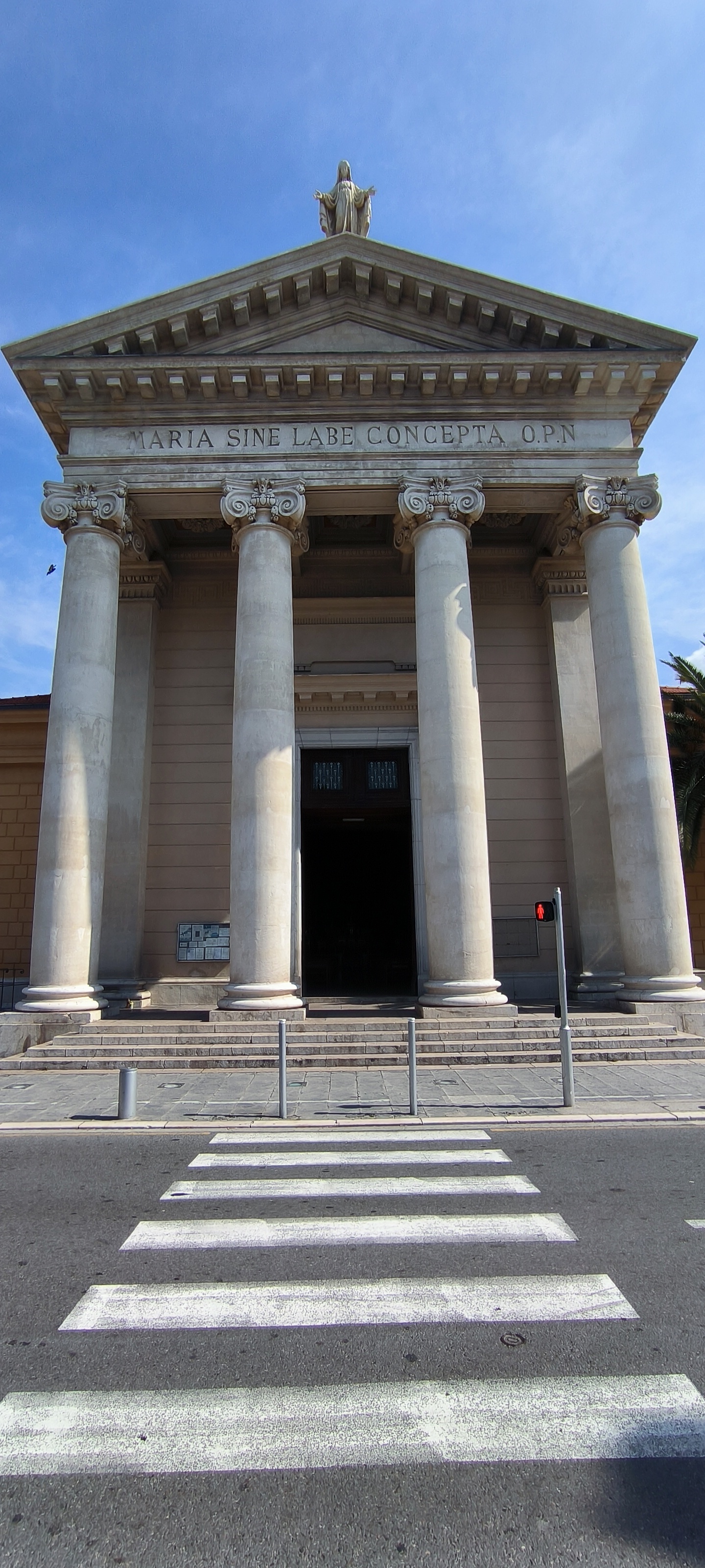 Église intéressante. Quatre colonnes classiques de face. Et au sommet du temple, se trouve une statue de la Vierge Marie, regardant le port.