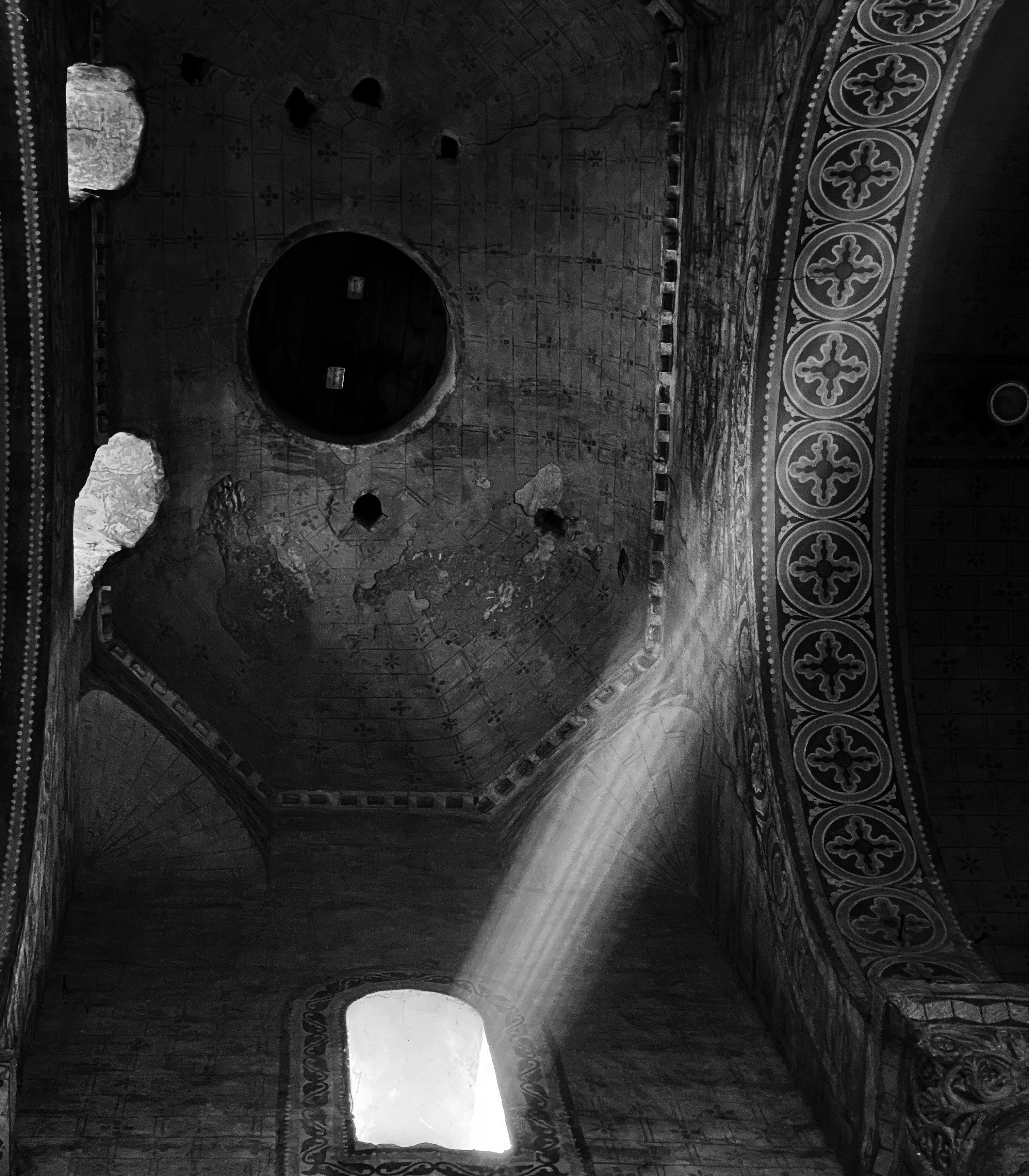 Superbe porte à l’extérieur. Et il y a des vestiges de peintures à l’intérieur : très joli