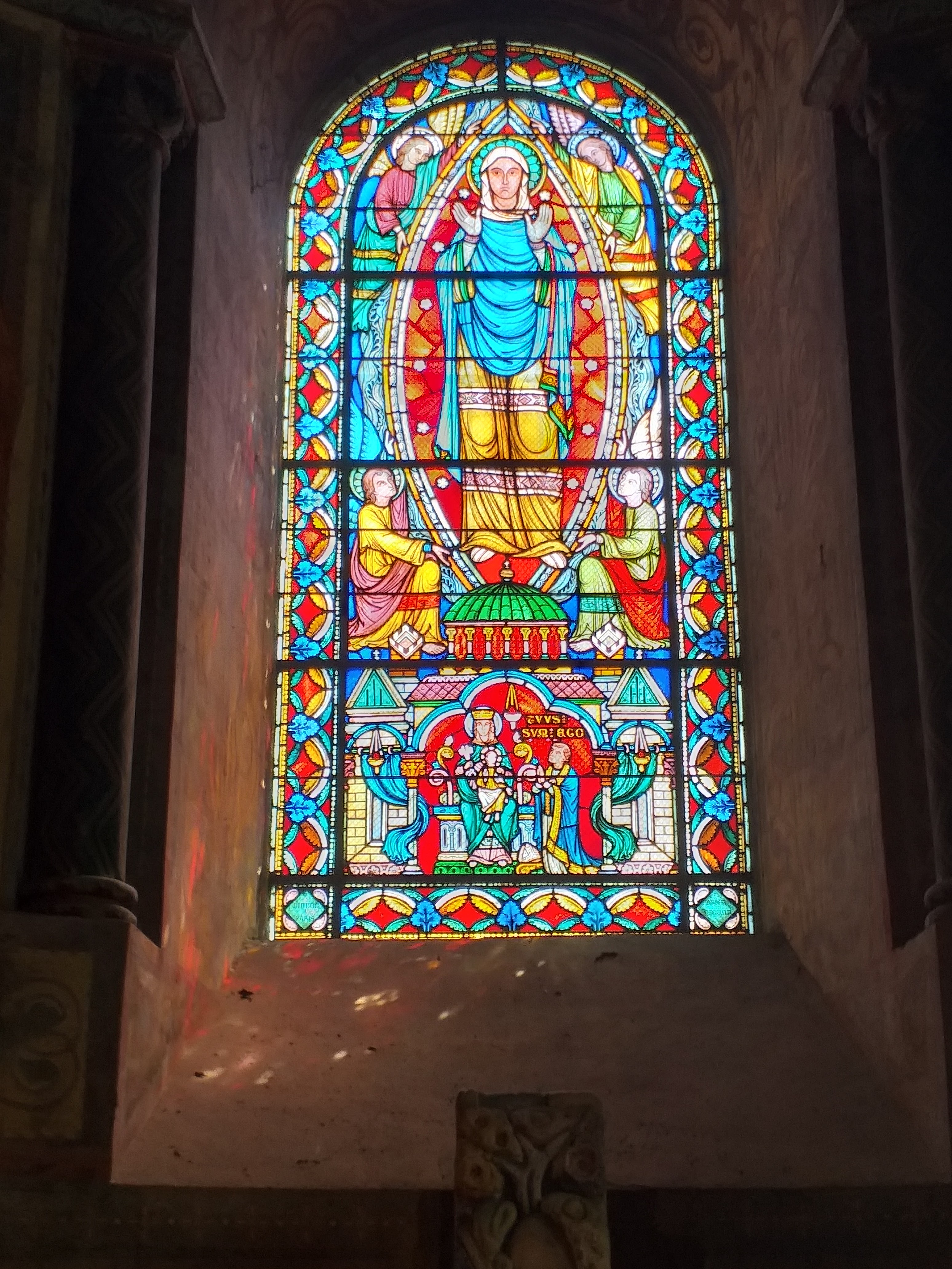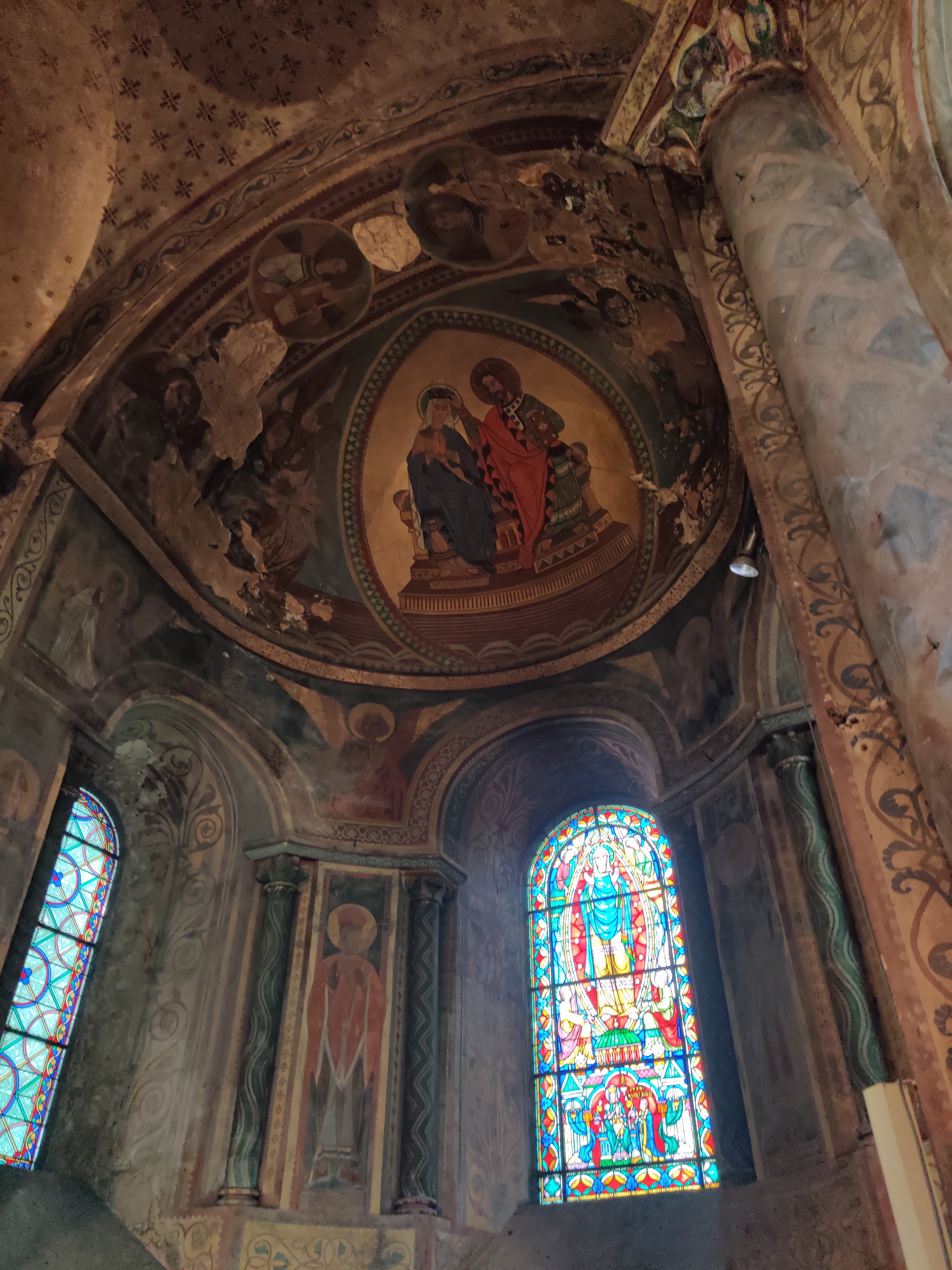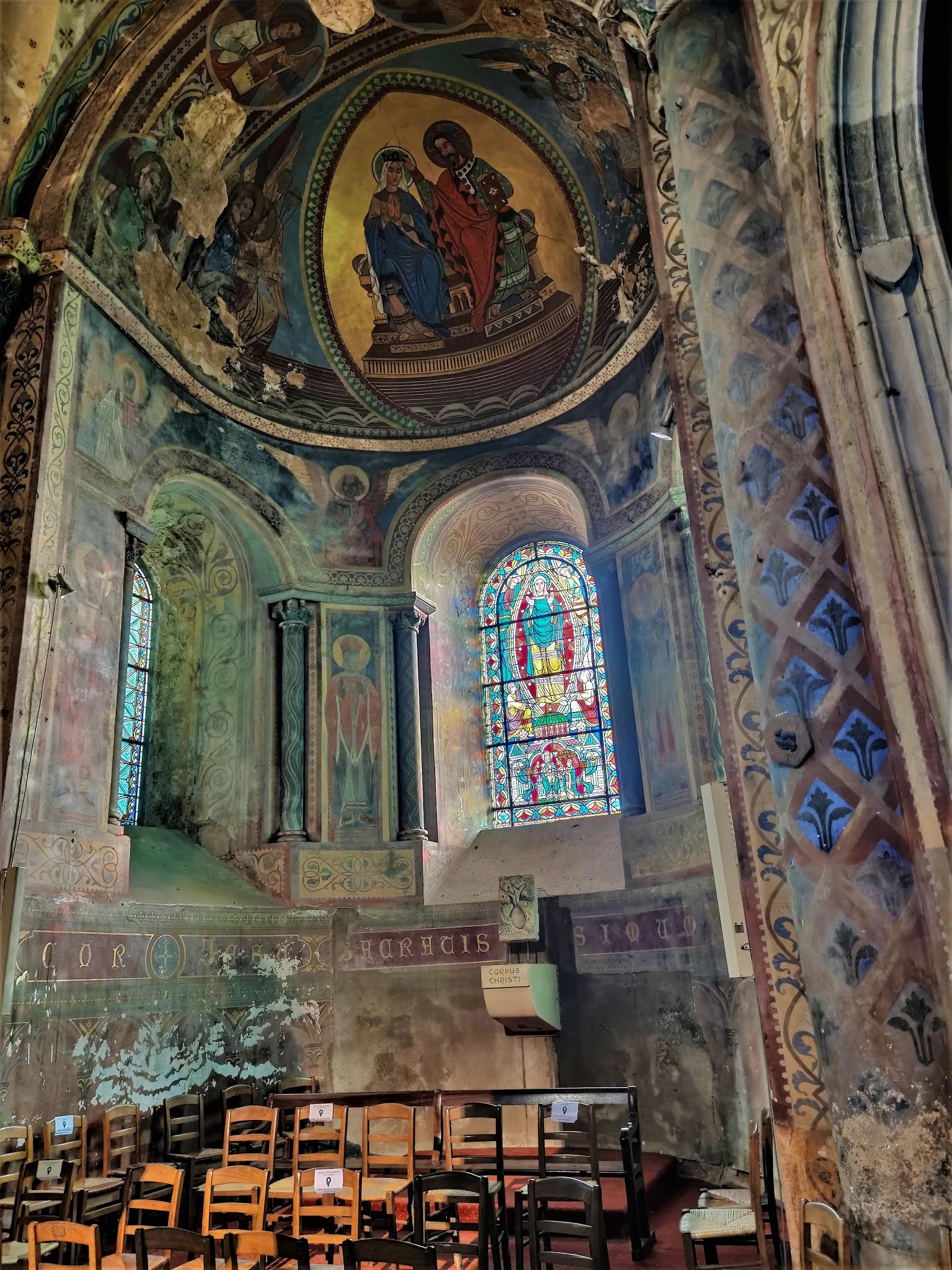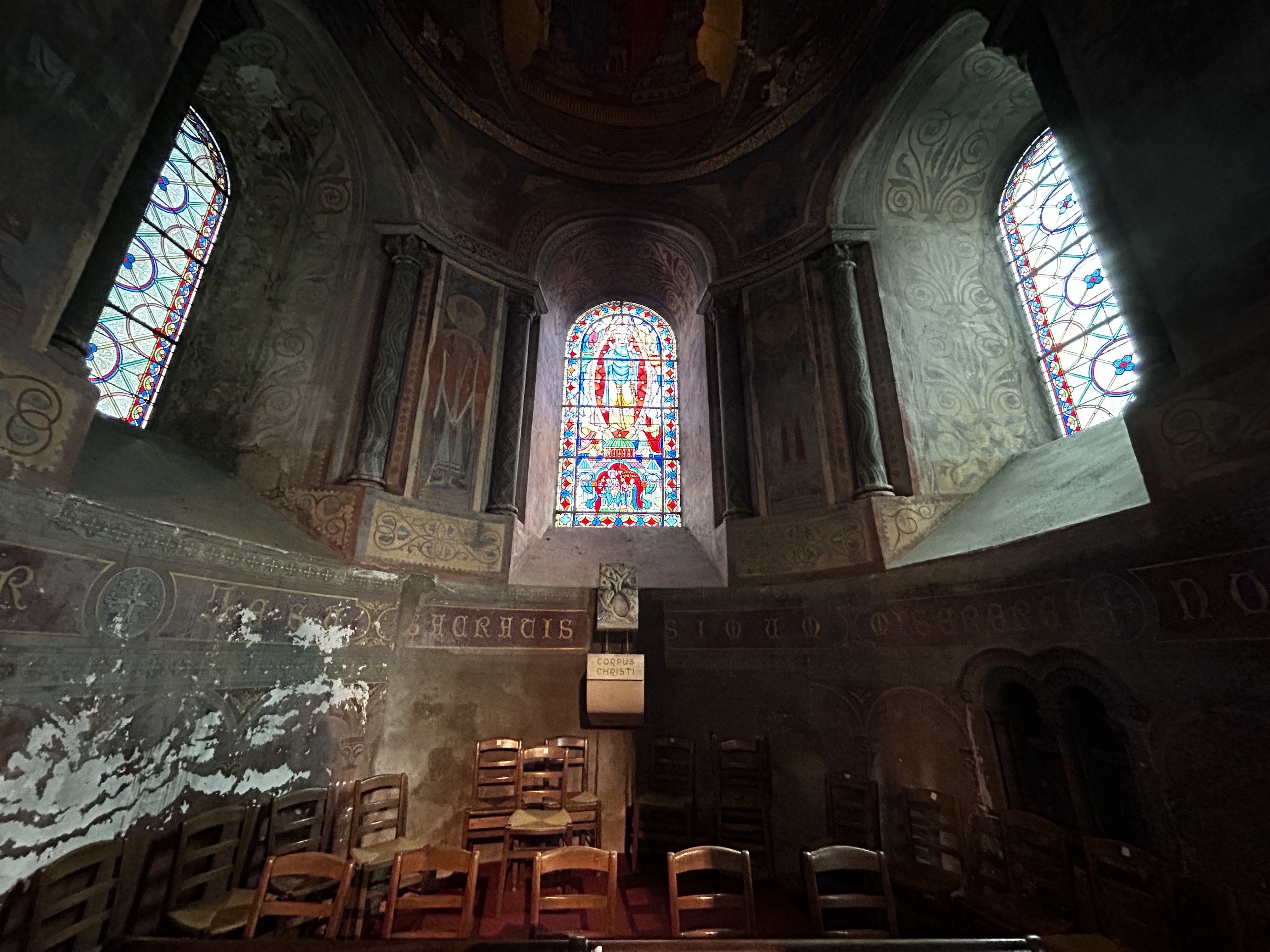 Peintures murales et vitraux magnifiques. Vraiment belle église qui demande à être rénovée.