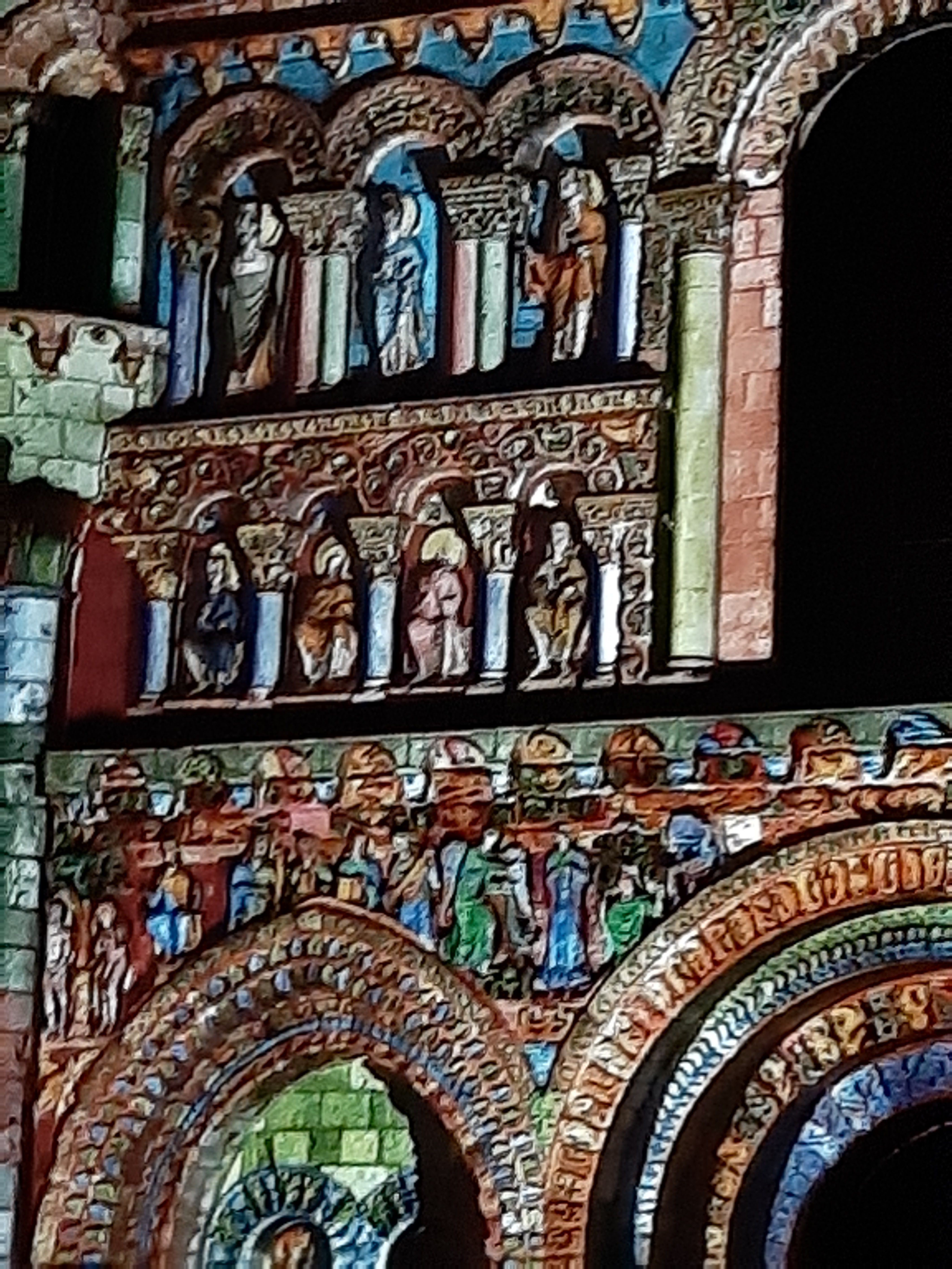 Magnifique église du 12e siècle. Avec ses toitures en pierres. Ses murs polychromes. Ses dimensions basses. Projections de reconstitution de coloration des fresques extérieures à blanc nuit tombée. En ce moment à 18h00, pour un quart d'heure.