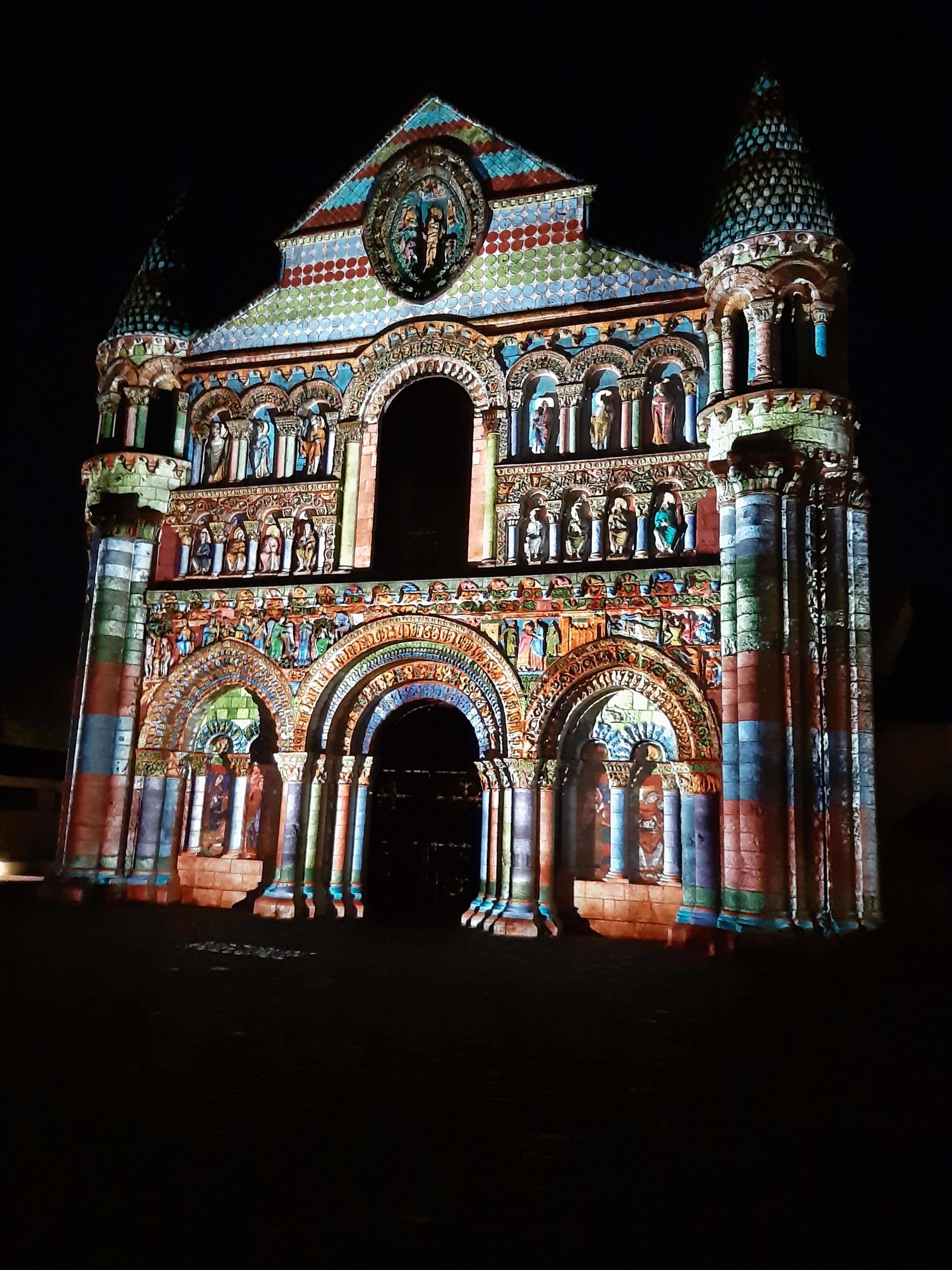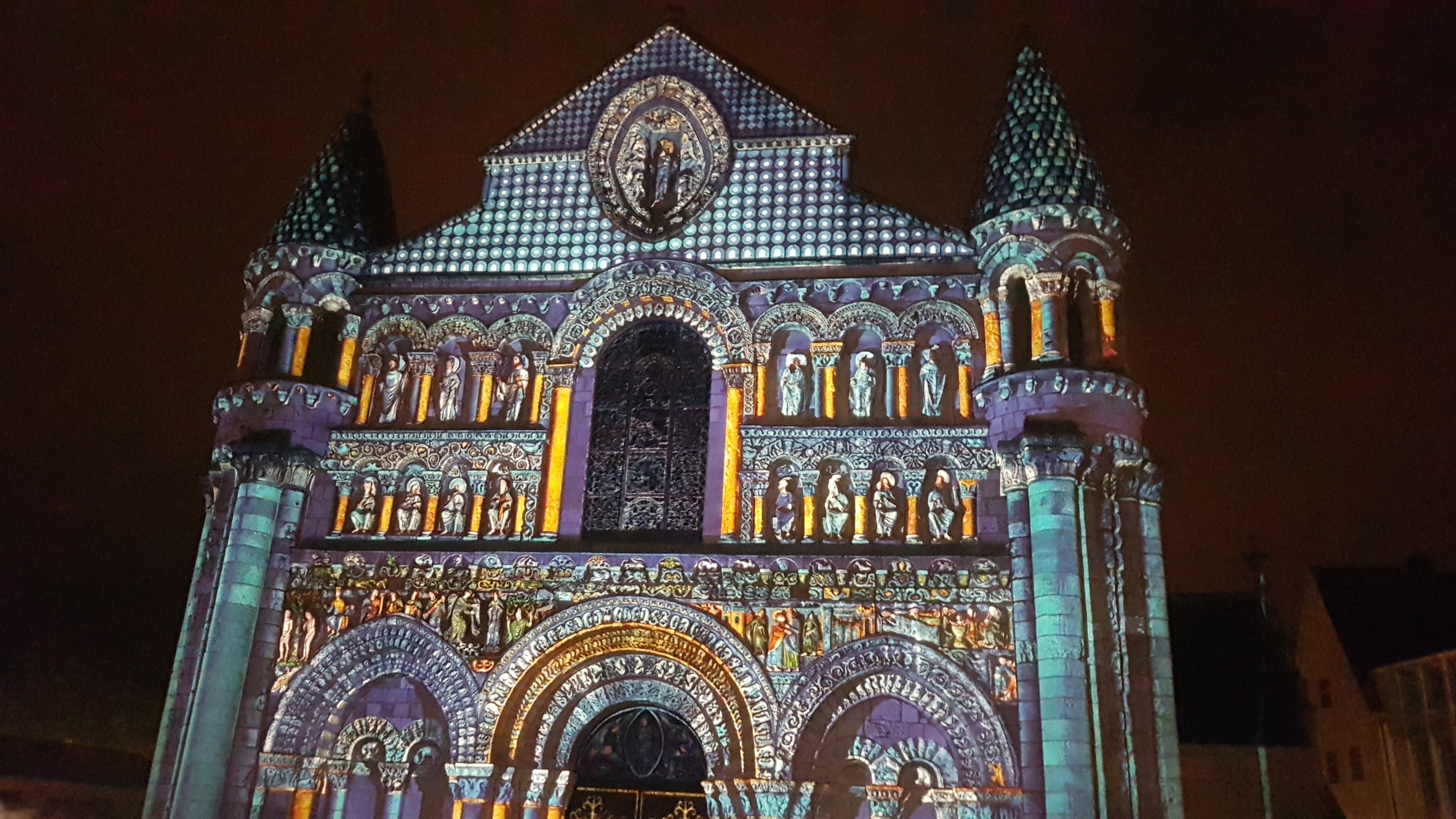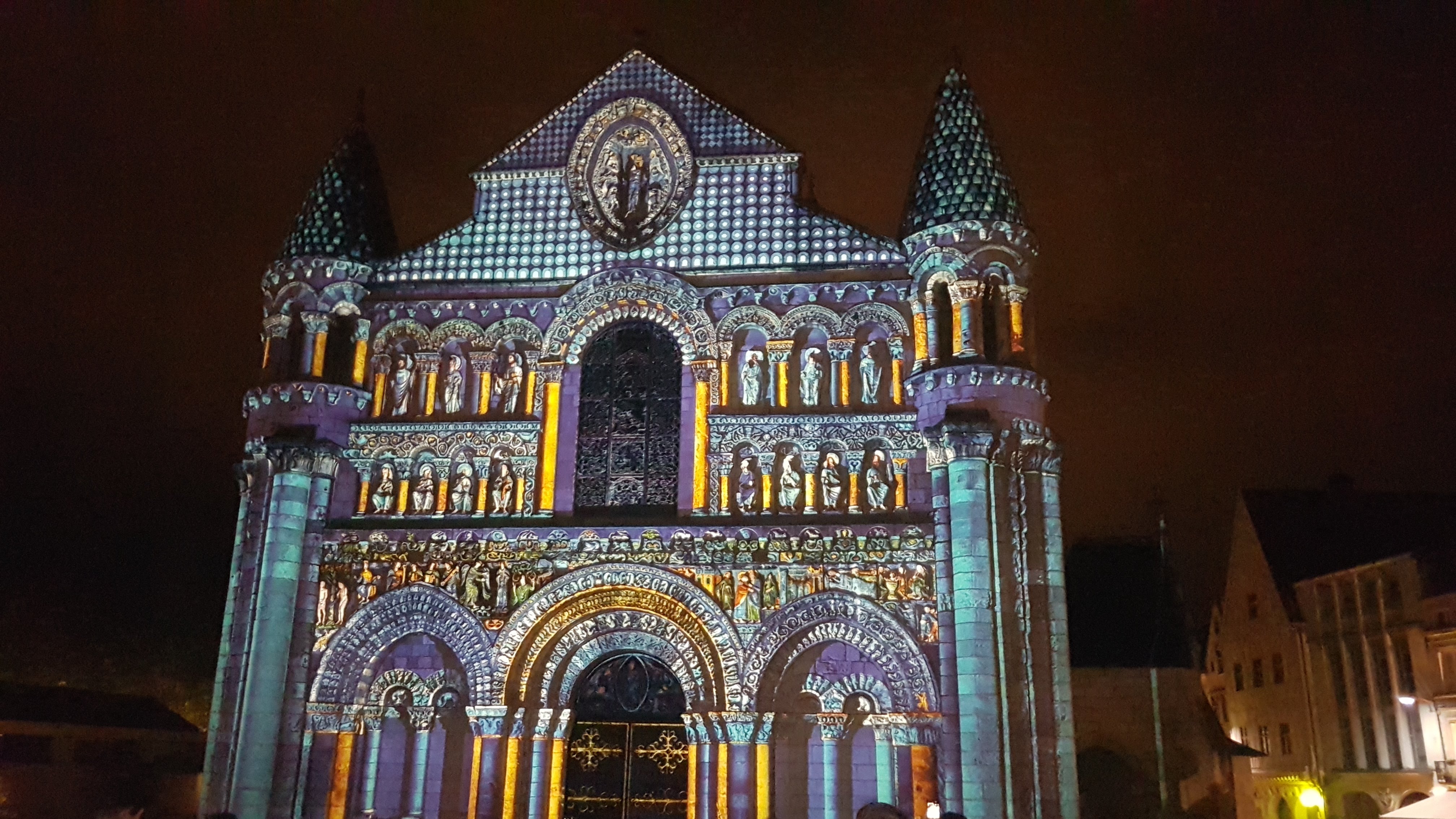 Chaque soir d'été et pendant les vacances de Noël, à la tombée de la nuit, la façade de l'église Notre-Dame-la-Grande se pare de couleurs pour renouer avec son passé et la tradition médiévale des églises peintes.