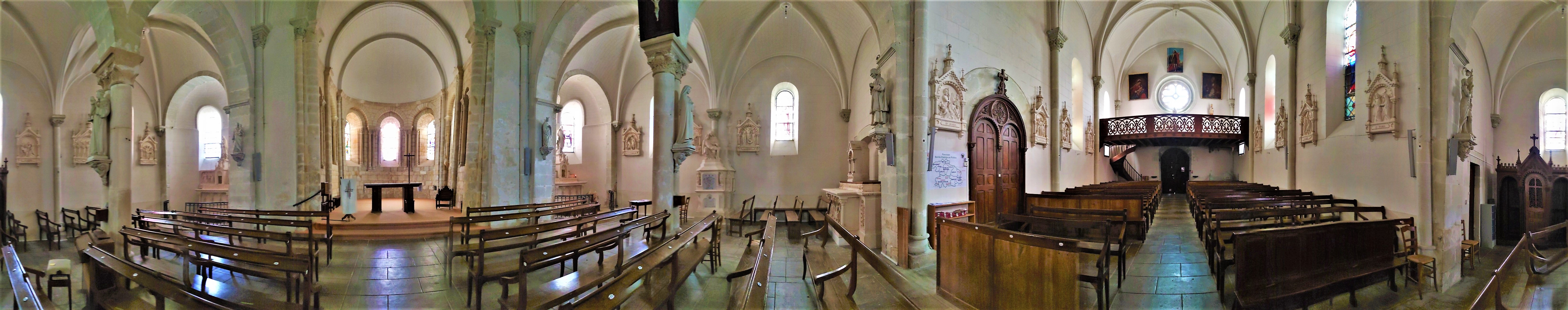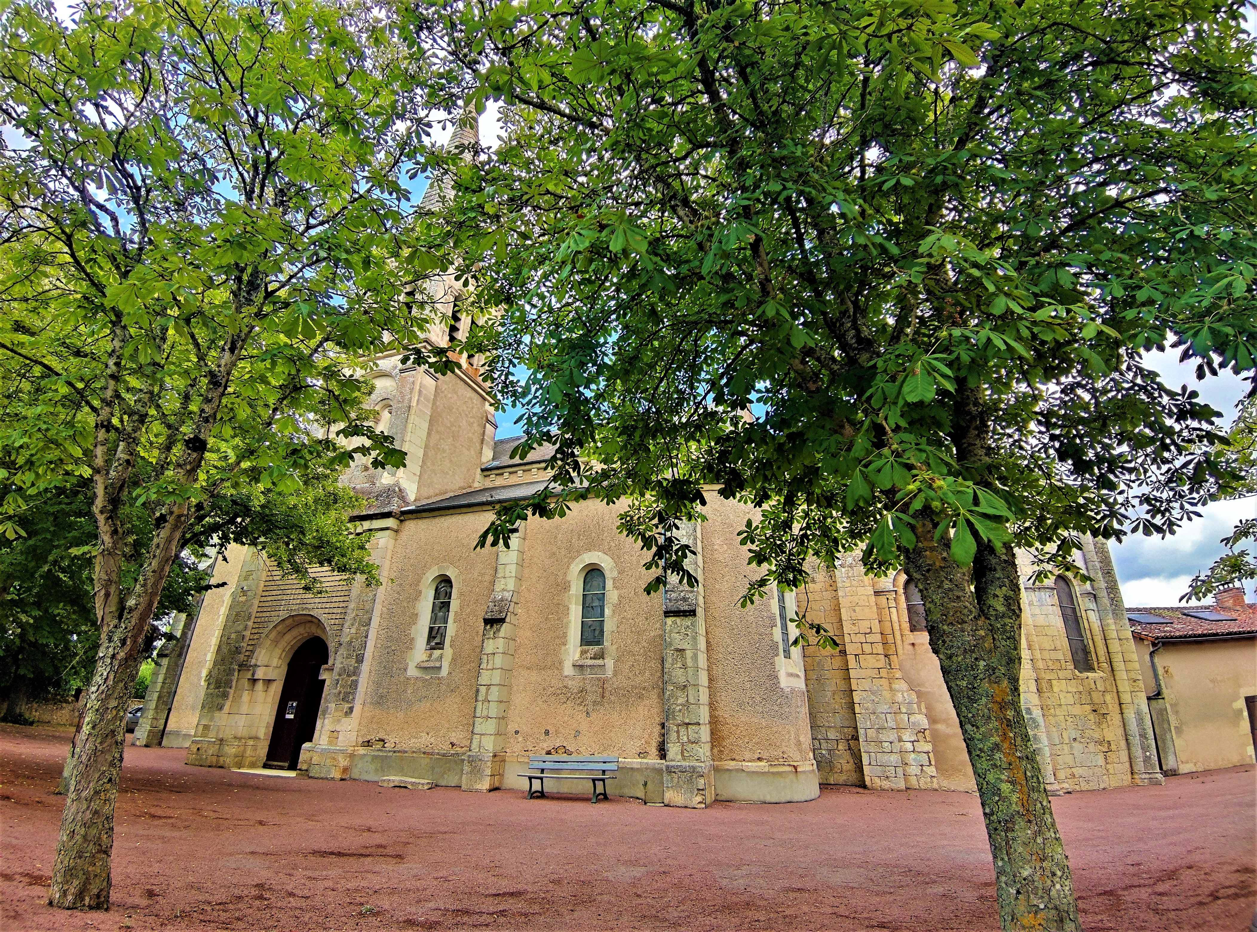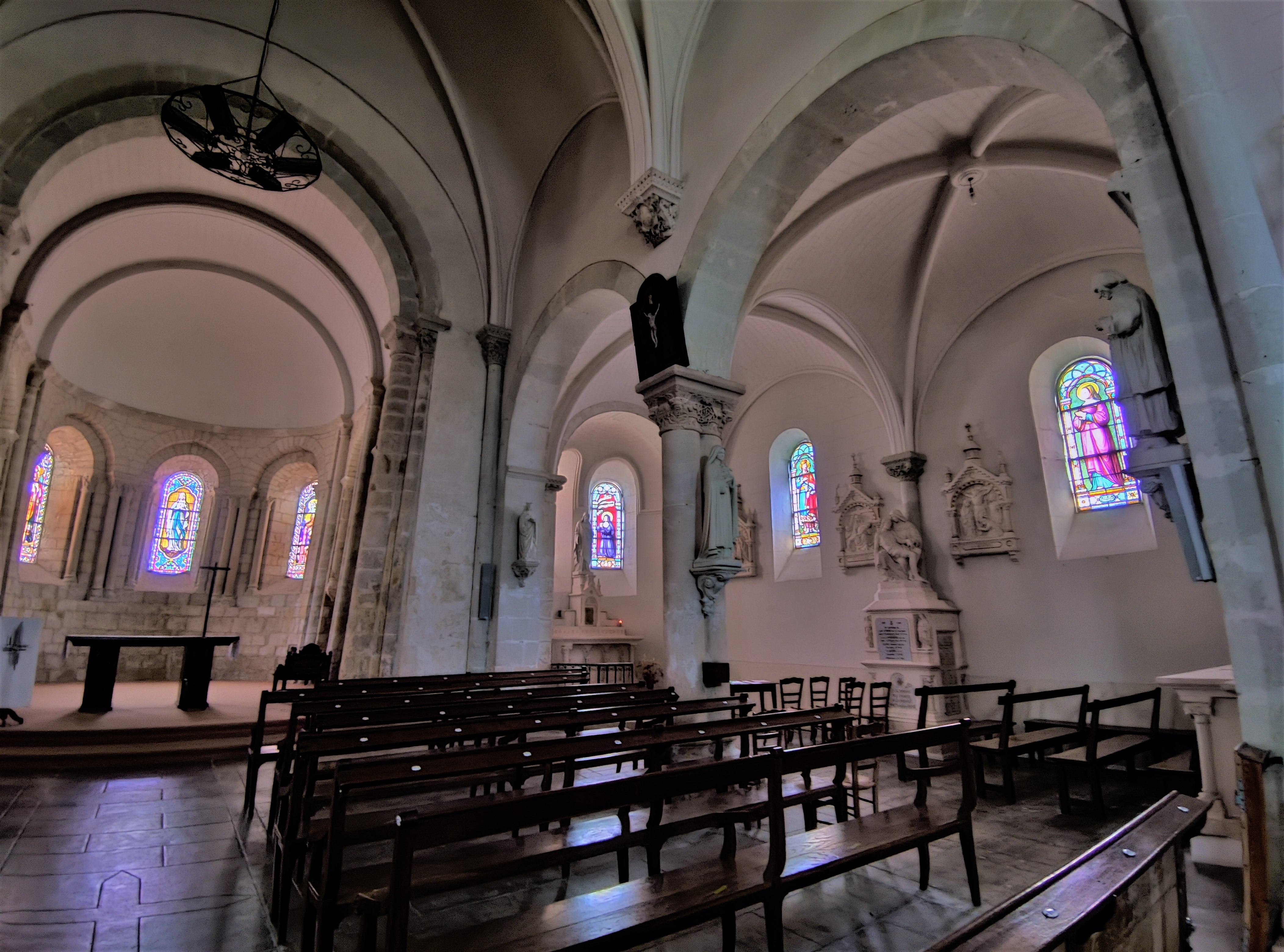 Un édifice qui remplit sa fonction de rassemblement, chaleureux, simple mais où la beauté, expression de la Foi n'a pas été oubliée. Une église orientée qui fut construite au 12ème, la nef et le clocher furent reconstruits au 19ème. On y entre par un clocher porche situé au Sud, on pénètre dans la troisième travée de la nef qui en compte 5. Les 2 travées Est de la nef côtoient des chapelles. Ces dernières ont aussi 2 travées, et se terminent à l'Est par des absidioles, encadrant le chœur historique de l'église primitive. Ouverte et accueillante, les arcs doubleaux, les arcades et les ouvertures en plein cintre du 19ème, offrent à cet édifice une harmonieuse cohérence architecturale. Les vitraux furent réalisés par Lux Fournier début 20ème qui prit en main l'atelier familial en 1901. De nombreux personnages bibliques sont représentés, dont les parents de la vierge Marie, Anne et Joachim dans la chapelle Nord. Vitraux, peintures, statues, décors sculptés, architecture du 12ème, monument aux morts et la Piéta, sont autant d'éléments à découvrir. Le chœur et le chevet roman sont en bon état de préservation, l'église dans son ensemble est bien tenue et mise en valeur sur une place arborée. Un édifice qui remplit sa fonction de rassemblement, chaleureux, simple mais où la beauté, expression de la Foi n'a pas été oubliée.