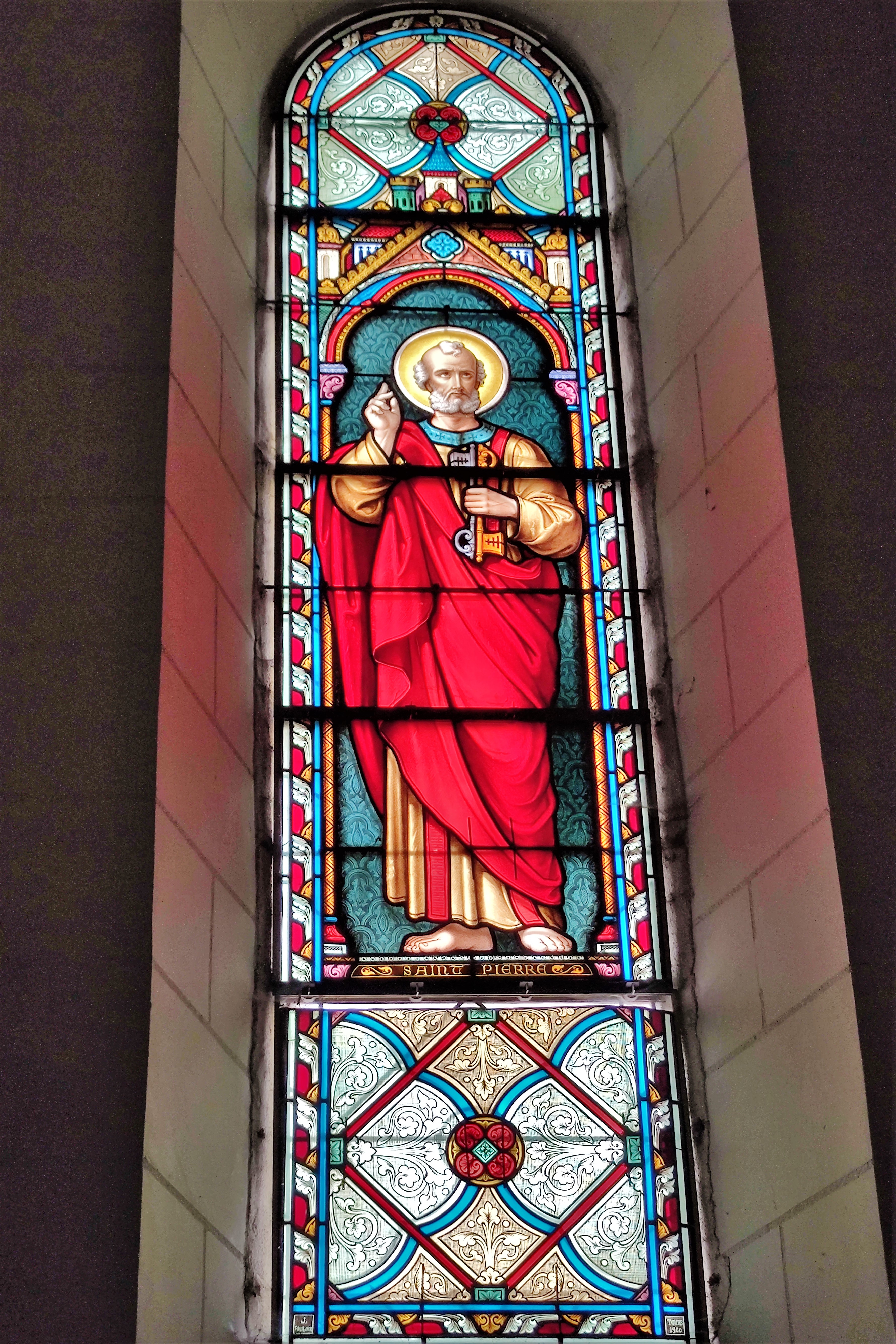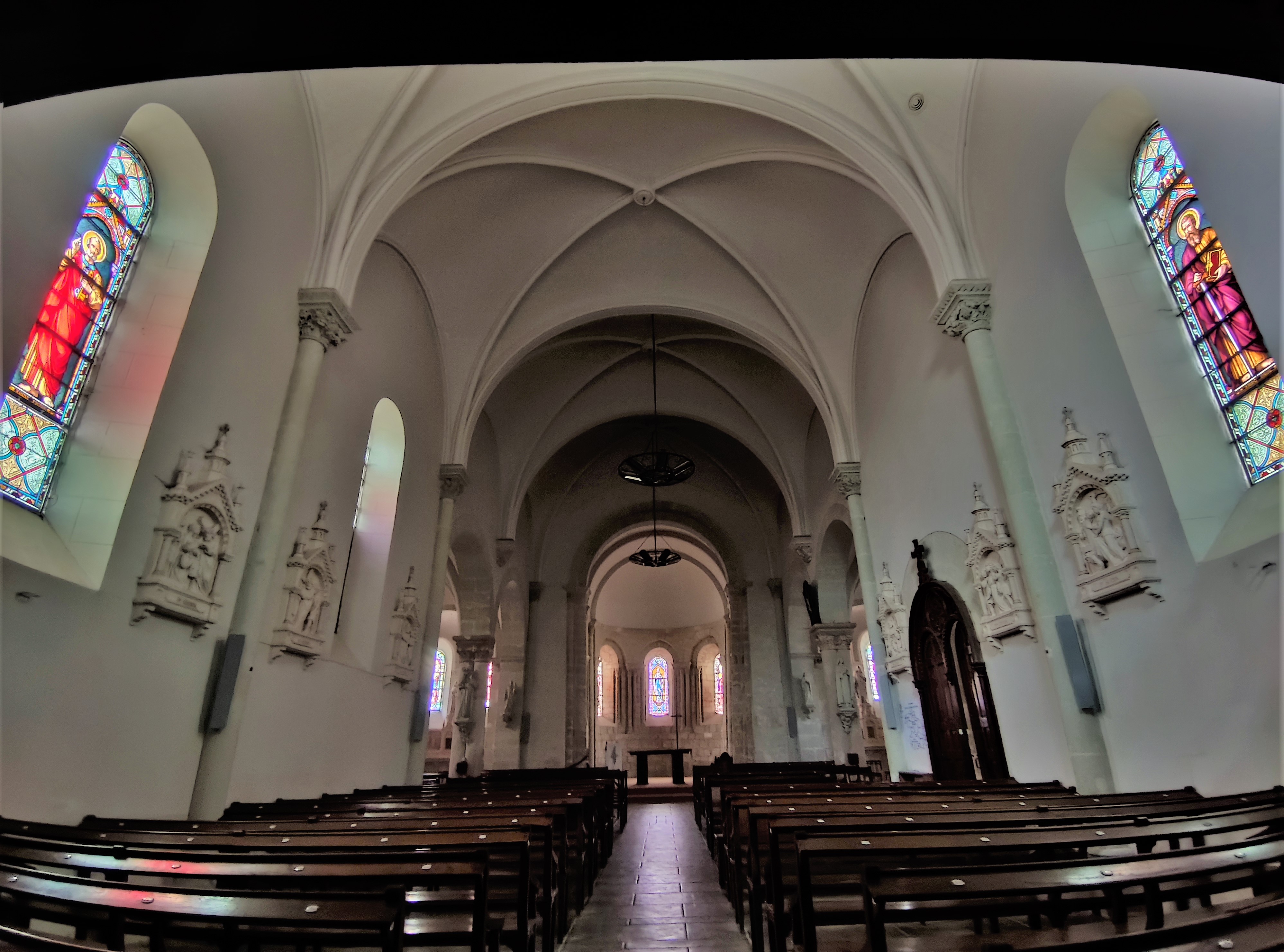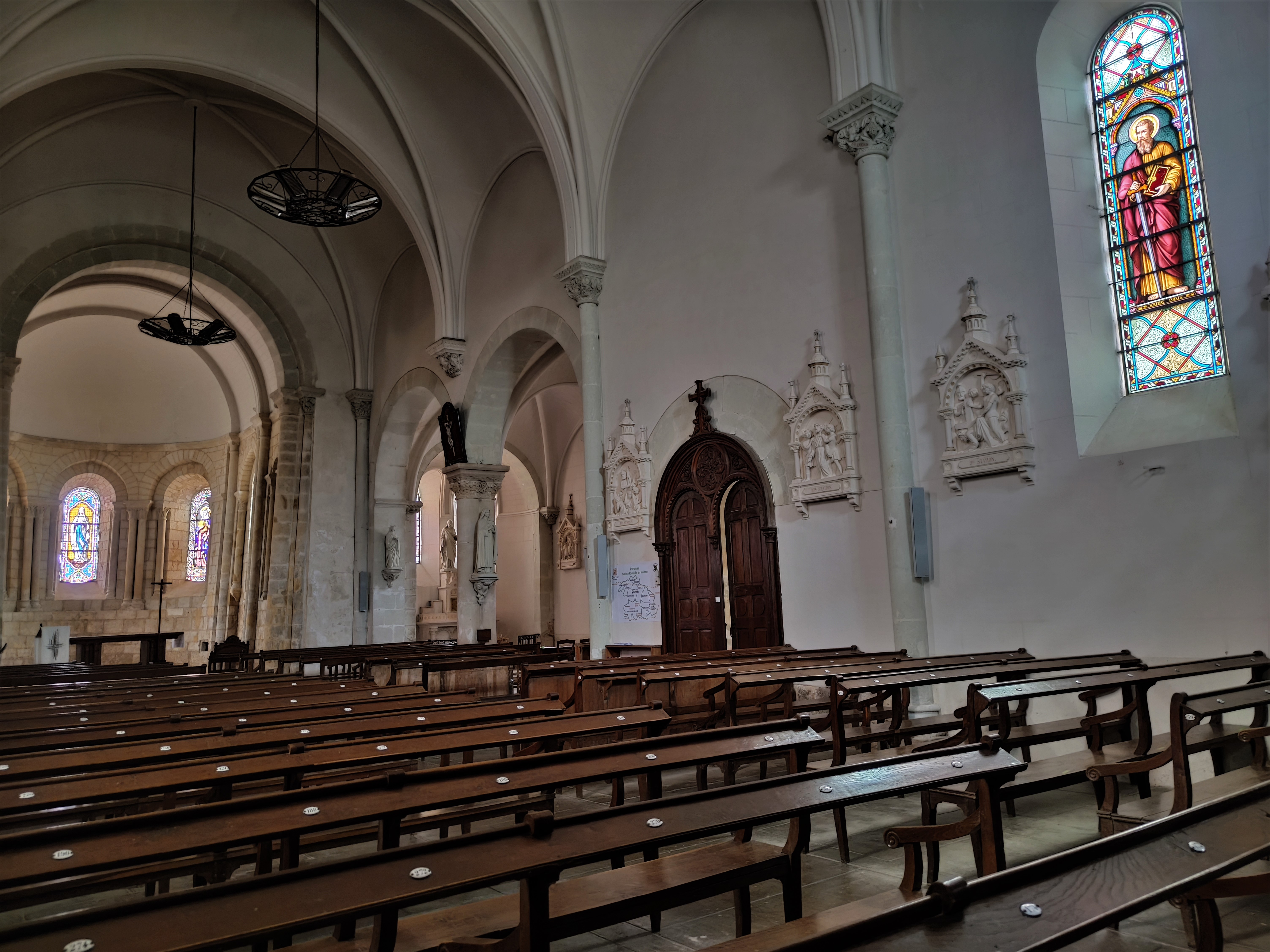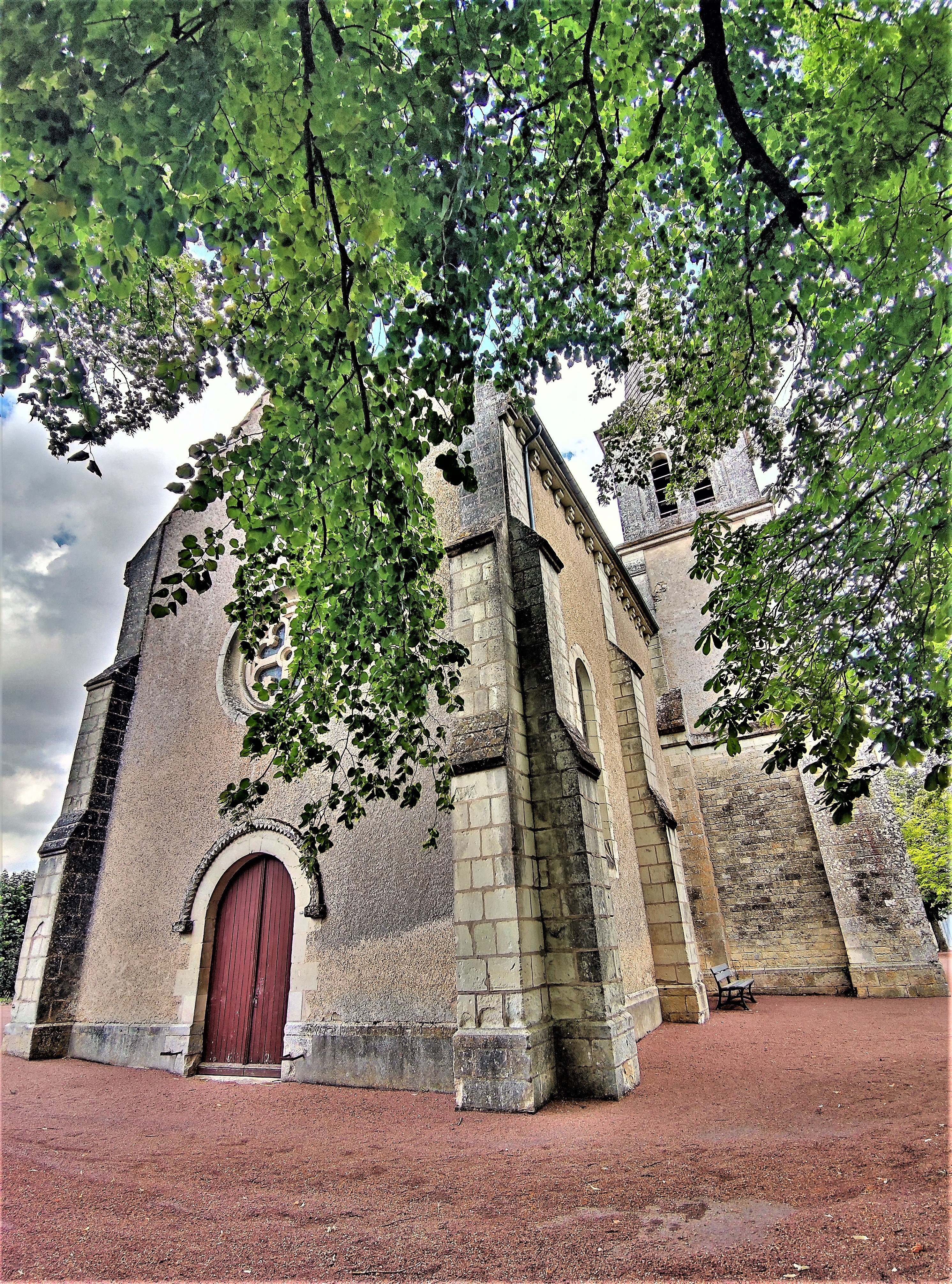 Un édifice qui remplit sa fonction de rassemblement, chaleureux, simple mais où la beauté, expression de la Foi n'a pas été oubliée. Une église orientée qui fut construite au 12ème, la nef et le clocher furent reconstruits au 19ème. On y entre par un clocher porche situé au Sud, on pénètre dans la troisième travée de la nef qui en compte 5. Les 2 travées Est de la nef côtoient des chapelles. Ces dernières ont aussi 2 travées, et se terminent à l'Est par des absidioles, encadrant le chœur historique de l'église primitive. Ouverte et accueillante, les arcs doubleaux, les arcades et les ouvertures en plein cintre du 19ème, offrent à cet édifice une harmonieuse cohérence architecturale. Les vitraux furent réalisés par Lux Fournier début 20ème qui prit en main l'atelier familial en 1901. De nombreux personnages bibliques sont représentés, dont les parents de la vierge Marie, Anne et Joachim dans la chapelle Nord. Vitraux, peintures, statues, décors sculptés, architecture du 12ème, monument aux morts et la Piéta, sont autant d'éléments à découvrir. Le chœur et le chevet roman sont en bon état de préservation, l'église dans son ensemble est bien tenue et mise en valeur sur une place arborée. Un édifice qui remplit sa fonction de rassemblement, chaleureux, simple mais où la beauté, expression de la Foi n'a pas été oubliée.