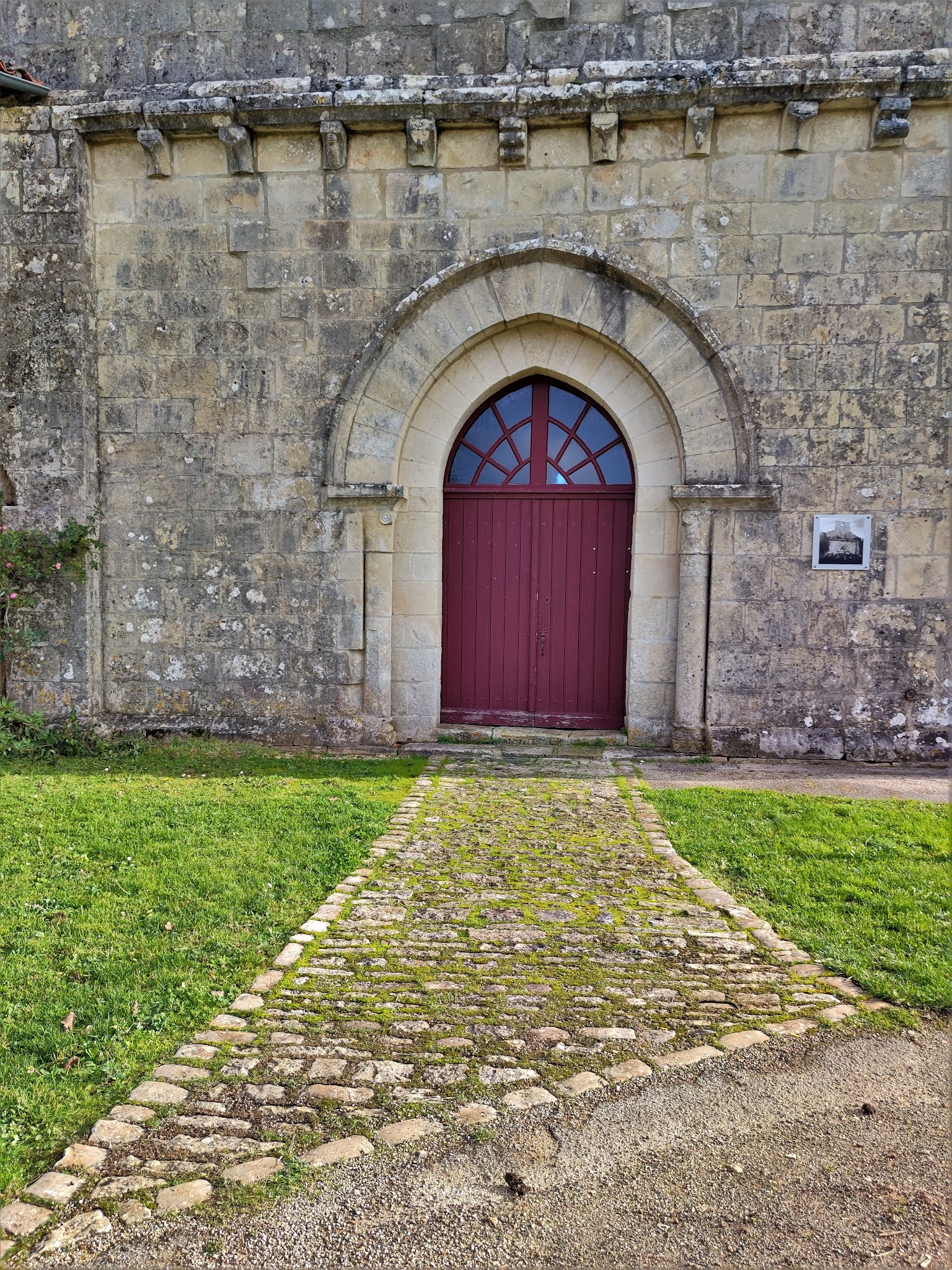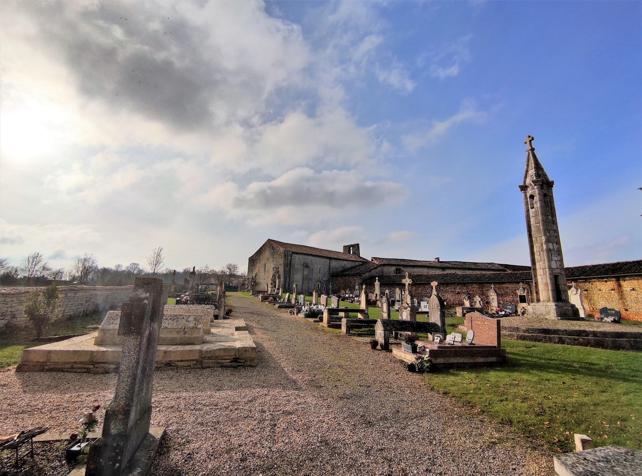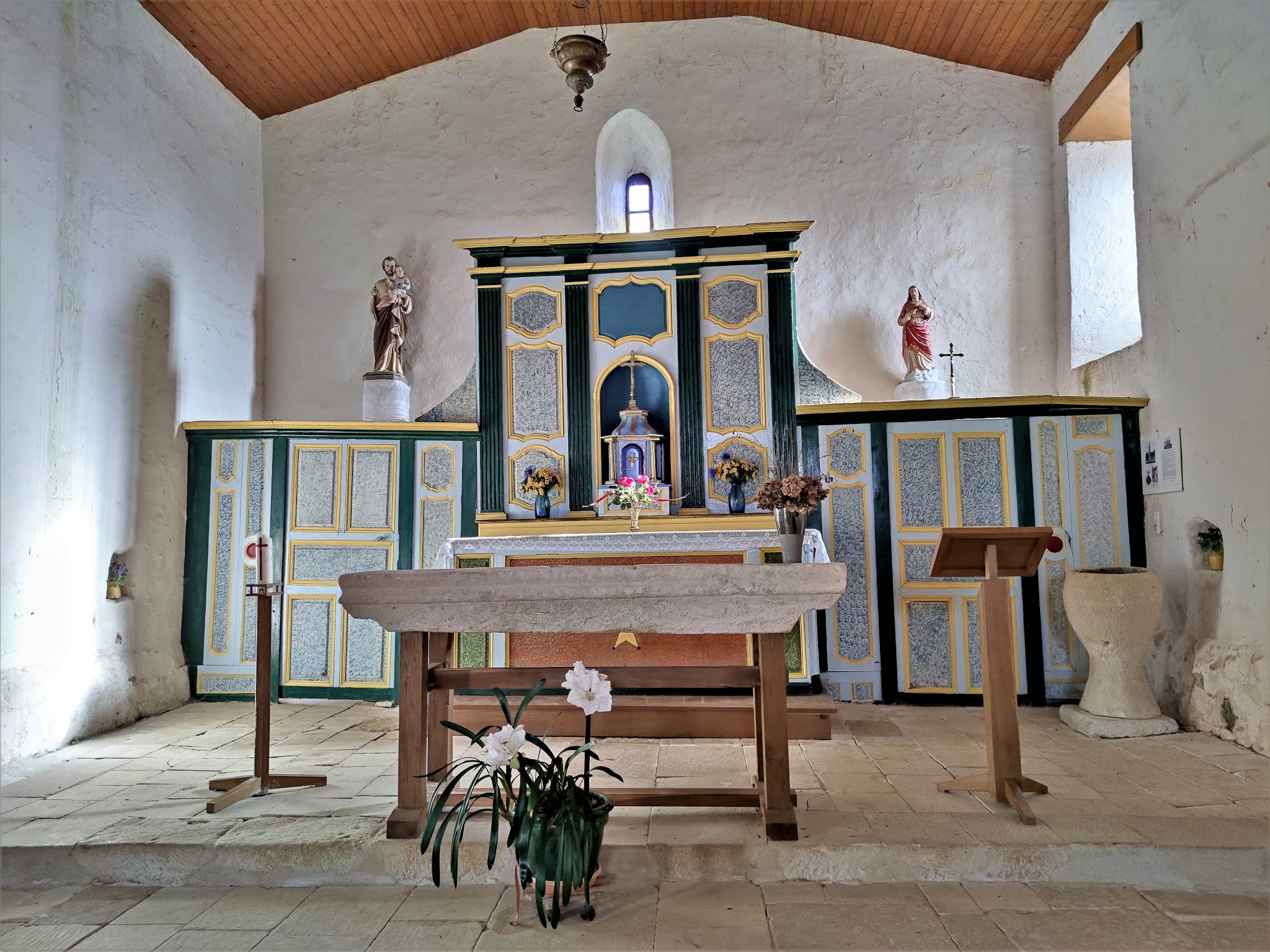 Construite au 11ème ou 12ème siècles, on peut difficilement imaginer une église plus simple. La nef rectangulaire est construite de belles pierres de taille, seul le chevet est en moellons, il a été reconstruit. Une abside, aujourd'hui disparue, dont il reste quelques départs de maçonnerie, abritait dans un premier temps le sanctuaire. L'intérieur surprend par sa simplicité mais aussi par les couleurs d'un tabernacle qui occupe tout le fond de l'église, réservant un espace, faisant sans doute office de sacristie. Ce retable, joliment coloré, possède aucun décor sculpté, renforçant la simplicité de l'édifice. Autel et tabernacle sont du même style, l'ensemble apporte des notes fraiches et joyeuses. Une cuve baptismale en forme de coquetier est placée à l'entrée de la nef. Le chemin de croix, ouvrage local sans doute, présente chaque station sculptée dans un morceau de chêne. Le clocher-mur, situé au dessus de la façade possède une cloche de 1723. Le cimetière attenant est a visiter sans faute, une fameuse lanterne des morts du 12ème siècle est a découvrir. Des pierres tombales, décorées de motifs Mérovingiens, y sont également mises en valeur. Elles furent datées, dans un premier temps, du début 6ème siècle. Certains estiment aujourd'hui leur conception à l'époque médiévale. Le débat est ouvert, une certitude, elles sont magnifiques.