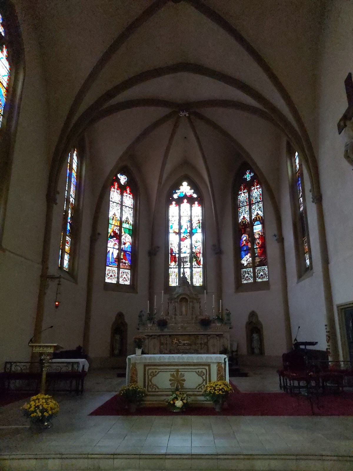Très belle église à l'intérieur sobre et solennel, surtout après sa réfection. Superbe chaire en bois sombre, très ouvragée, et de même l'ancienne porte de la chapelle latérale, deux héritages de l'ancienne chapelle du collège Ste Marie au pied du château. Excellents souvenirs liés à l'abbé Joseph Lecomte, historien hors pair et homme de grande bienveillance. En mémoire aussi : des offices dominicaux magnifiques qui élèvent l'âme, l'ordination de MM. Roy et Prouvé, visites épiscopales... Et ma communion !