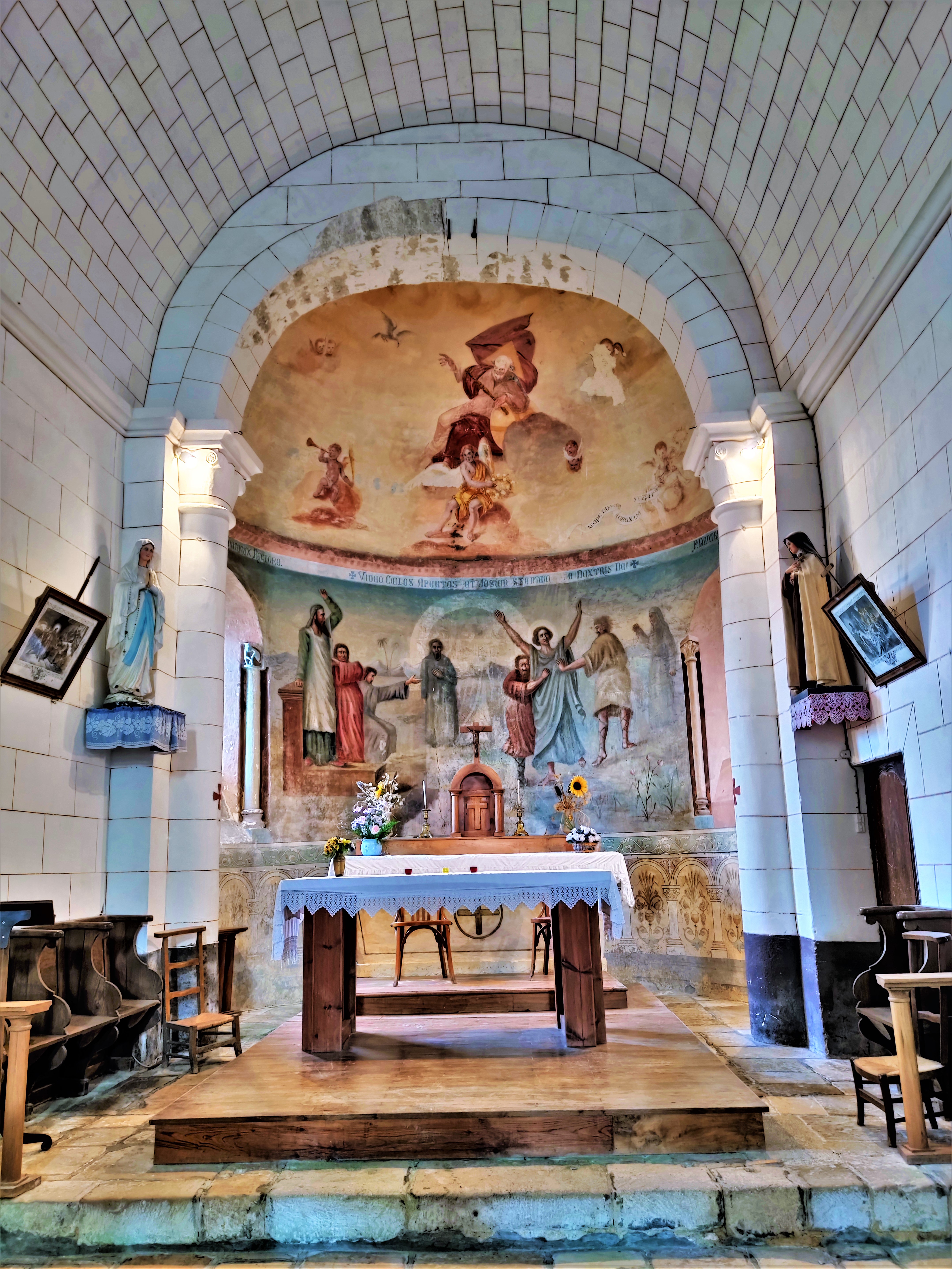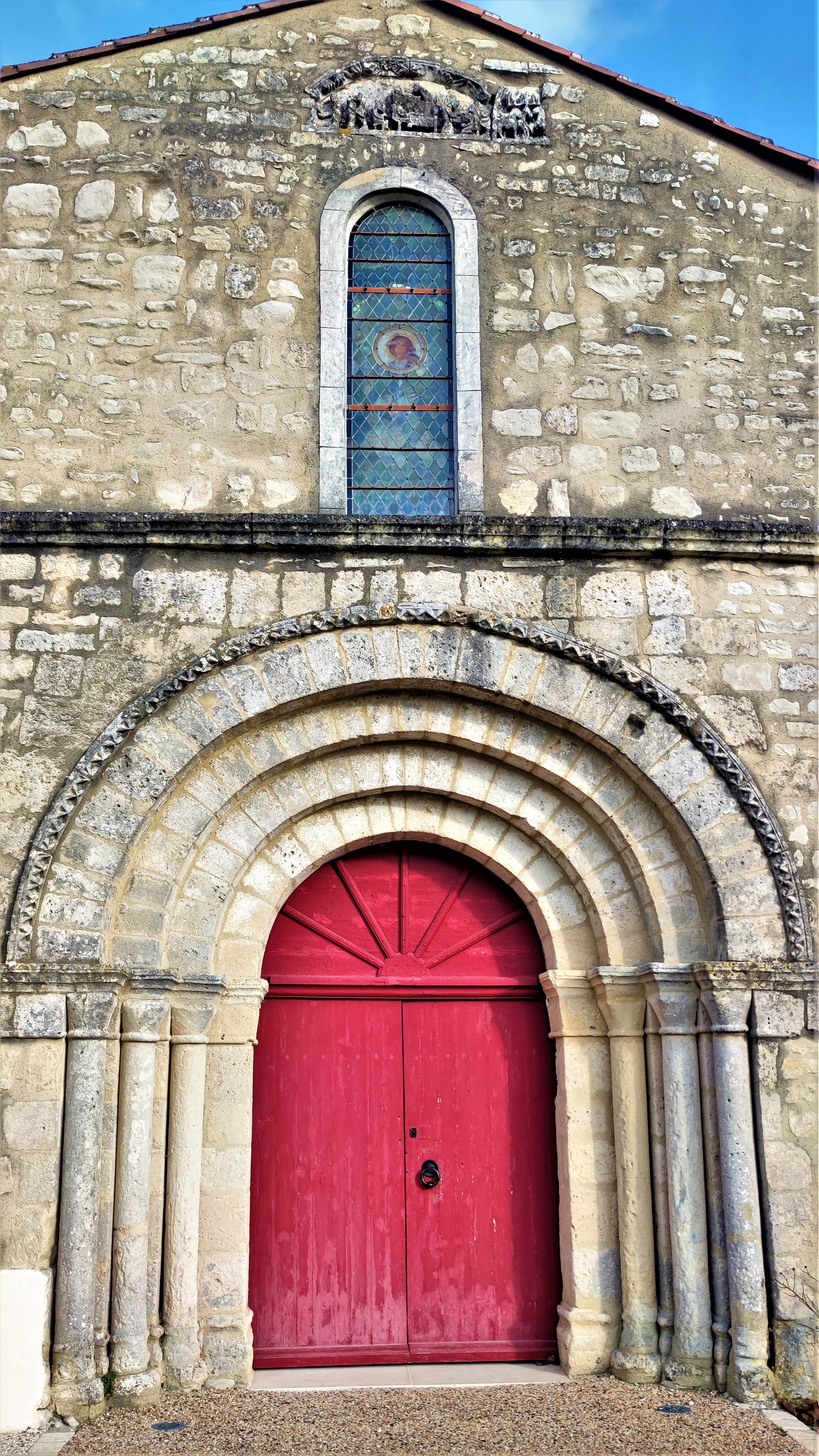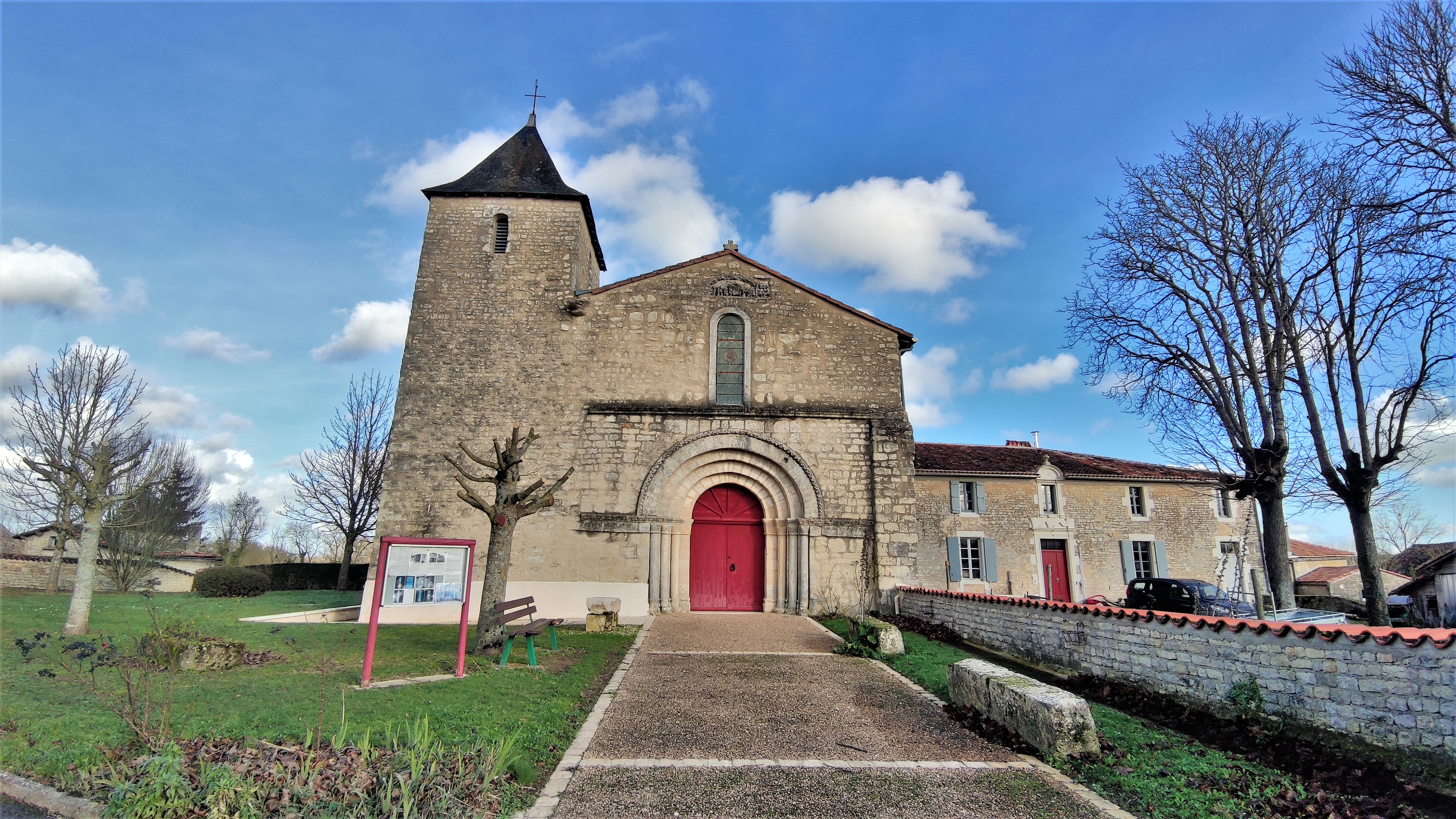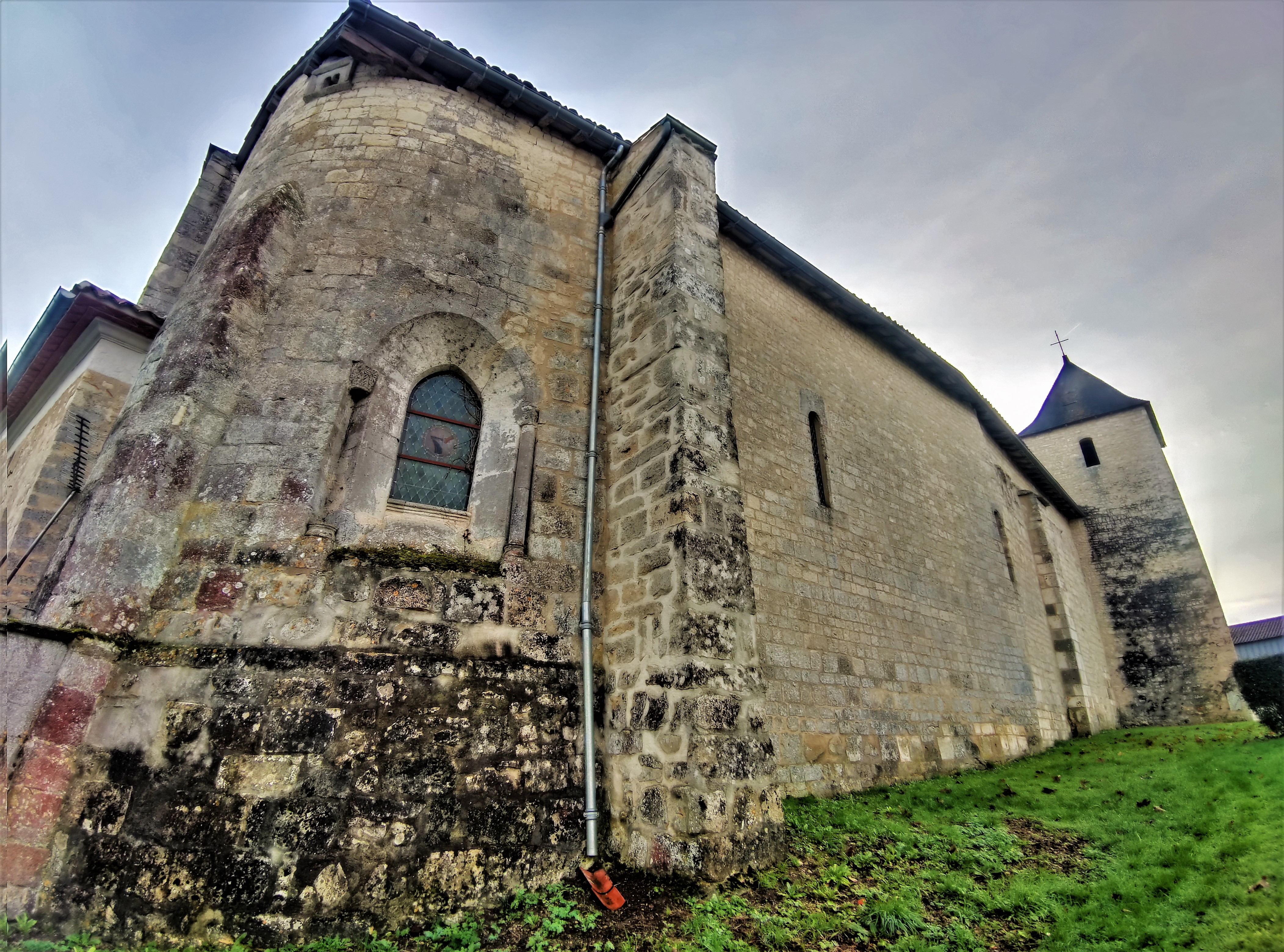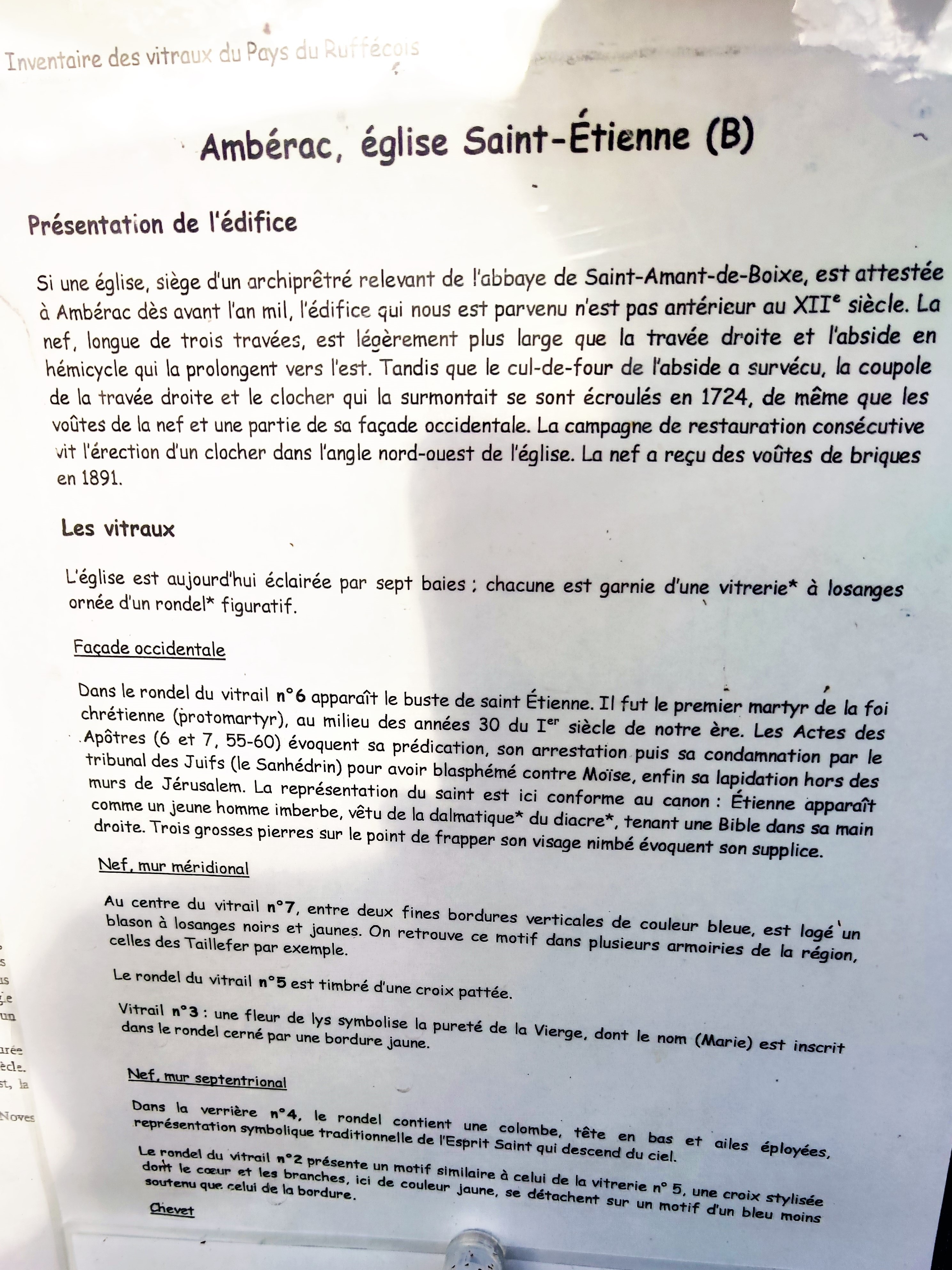 Une église du 12è qui a succédé à une église qui existait en l'an 1000. Rien ne nous est parvenu de l'église primitive, l'édifice actuel a subi de terribles dégâts au 18è, fut restauré le même siècle et le siècle suivant. Une voûte en berceau de brique fut installée au 19è, des vitraux posés au 21è, siècle d'une dernière restauration. Des bas-reliefs du 12è, classés depuis 1927, réemployés au 18è à la reconstruction, sont visibles sur la façade Ouest. Le clocher, reconstruit au 18è, fut accolé au Nord de cette façade. Des décors peints agrémentent l'abside, apportant un peu de fantaisie. Ambérac est un un village de 300 âmes, victime de l'exode rural, il en compta plus de 800 au 19è. Cette église, ouverte et accueillante, témoigne de l'attachement des paroissiens à leur église, des citoyens et de la collectivité à leur patrimoine bâti.