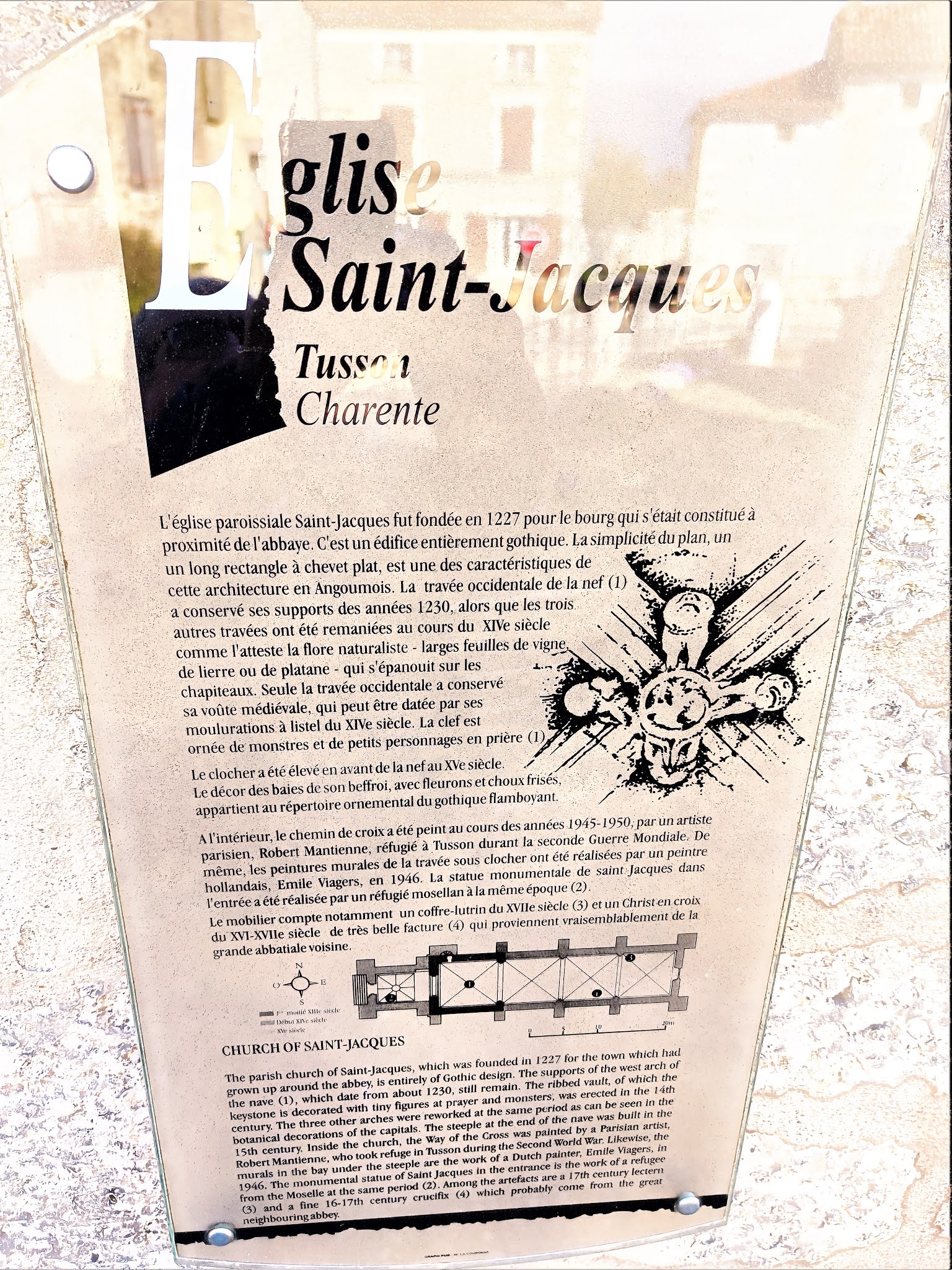 Normalement ouverte, cette église accueillante est un élément du riche patrimoine de cette cité. Créée en 1112, l'abbaye des Dames de Tusson, était de belle taille, dotée de 2 monastères, un féminin et un masculin comme à l'abbaye de Fontevraud, éponyme de l'Ordre auquel elle appartenait. Développant une belle activité, cette richesse eu pour conséquence la création d'un bourg, nécessitant une église paroissiale. Ainsi, au début du 13ème siècle, s'éleva l'église Saint-Jacques. Bien que fortifiée comme de nombreuses églises de la région, les conflits féodaux de la guerre de cent ans eurent raison de cet édifice primitif. De ce dernier, il reste à l'Ouest, le portail et la base du clocher-Porche qui fait narthex. Une nouvelle église est construite à la fin du 14ème et au début du 15ème siècle. C'est donc le style gothique qui apparait dans cette construction, simple mais de belle facture, elle parait avoir bien traversé les siècles, les voûtes en pierres lui donne un certain cachet. La position au centre du village la valorise. Pour le plaisir des yeux, de nombreuses peintures murales du 20ème siècle agrémentent l'édifice, bien éclairées par des vitraux aux couleurs chaleureuses . Quelques objets et sculptures, classés ou non, mais historiques, car datant du 16ème, 17ème et 18ème siècles sont à découvrir.