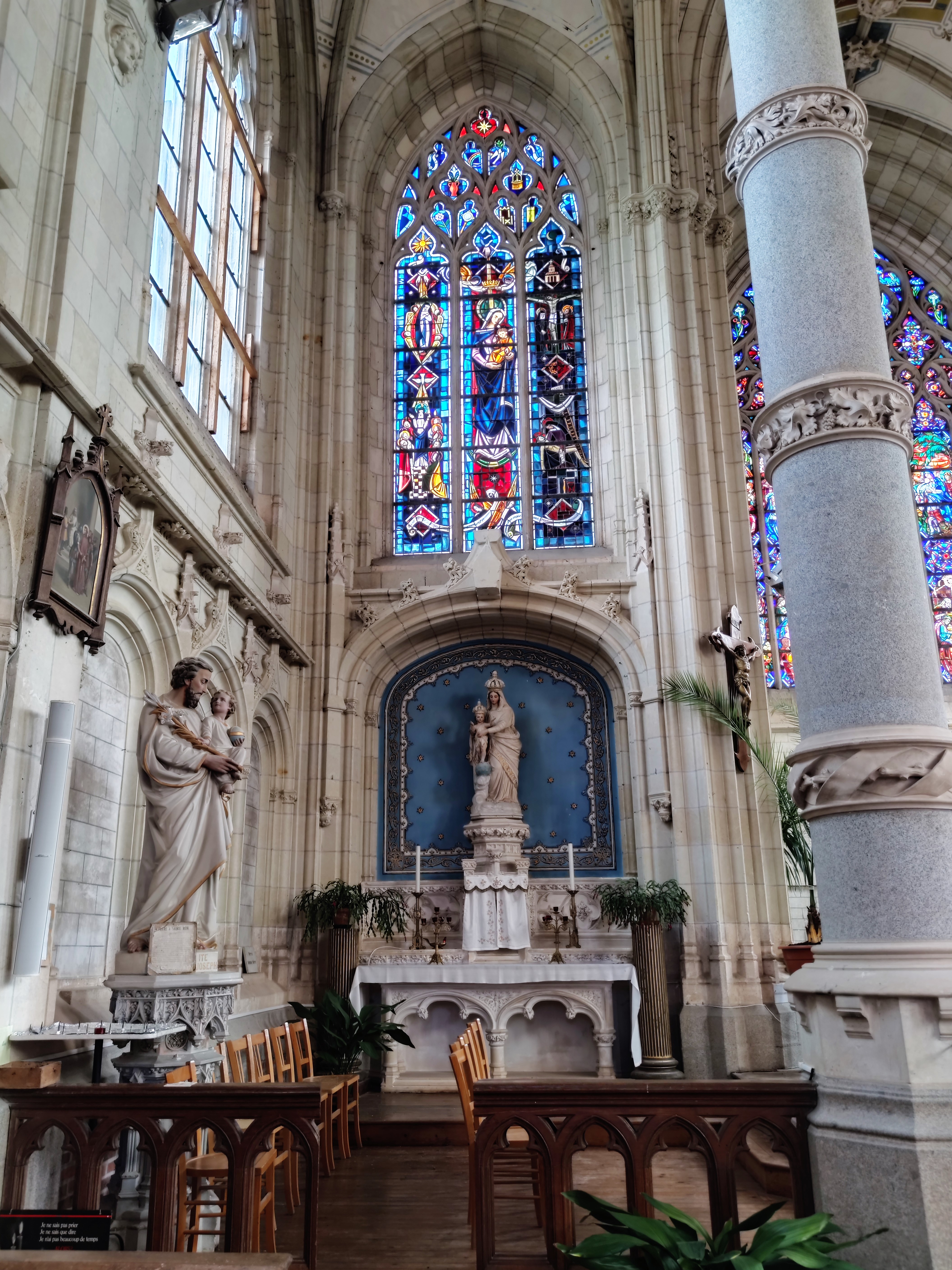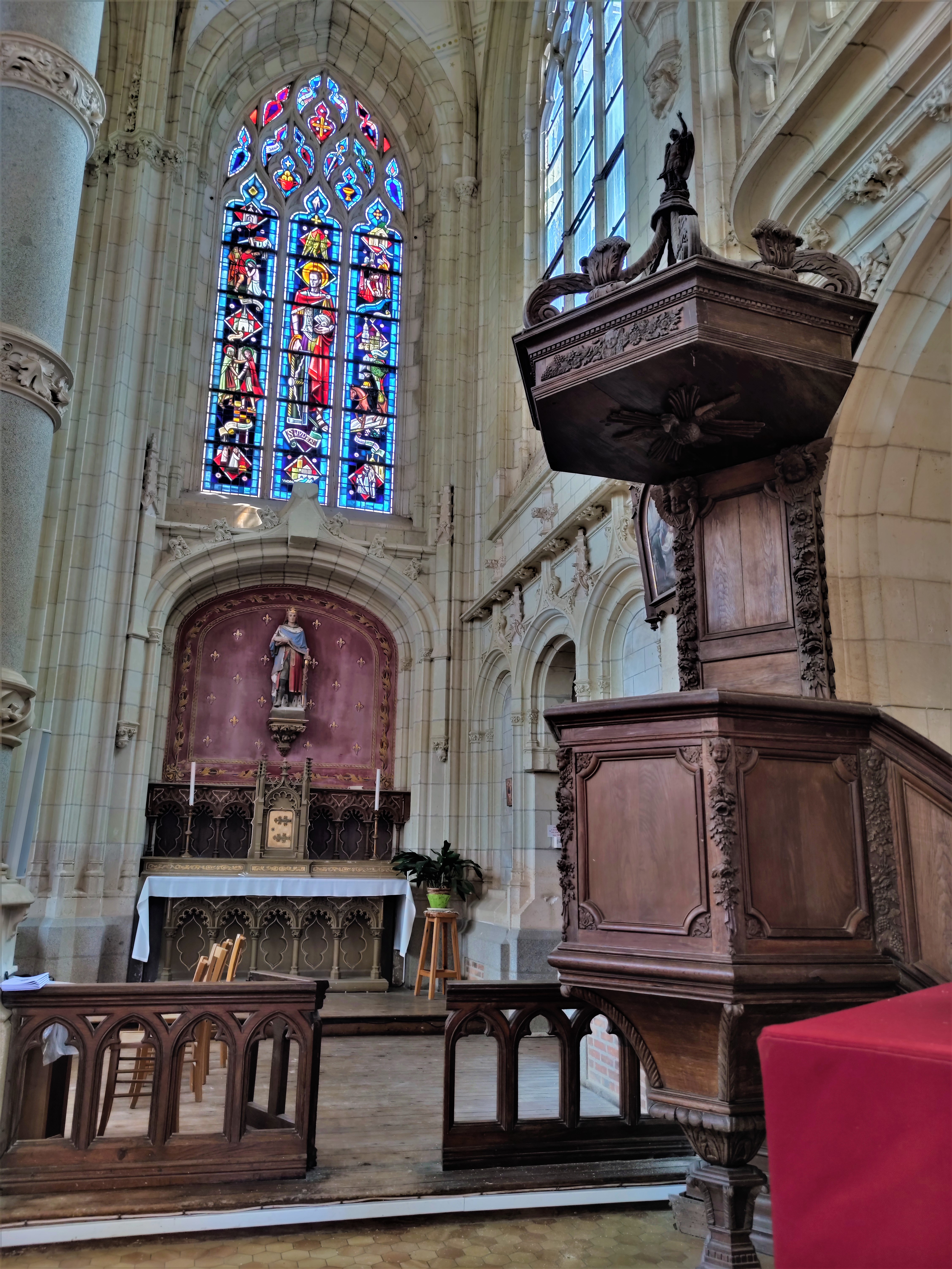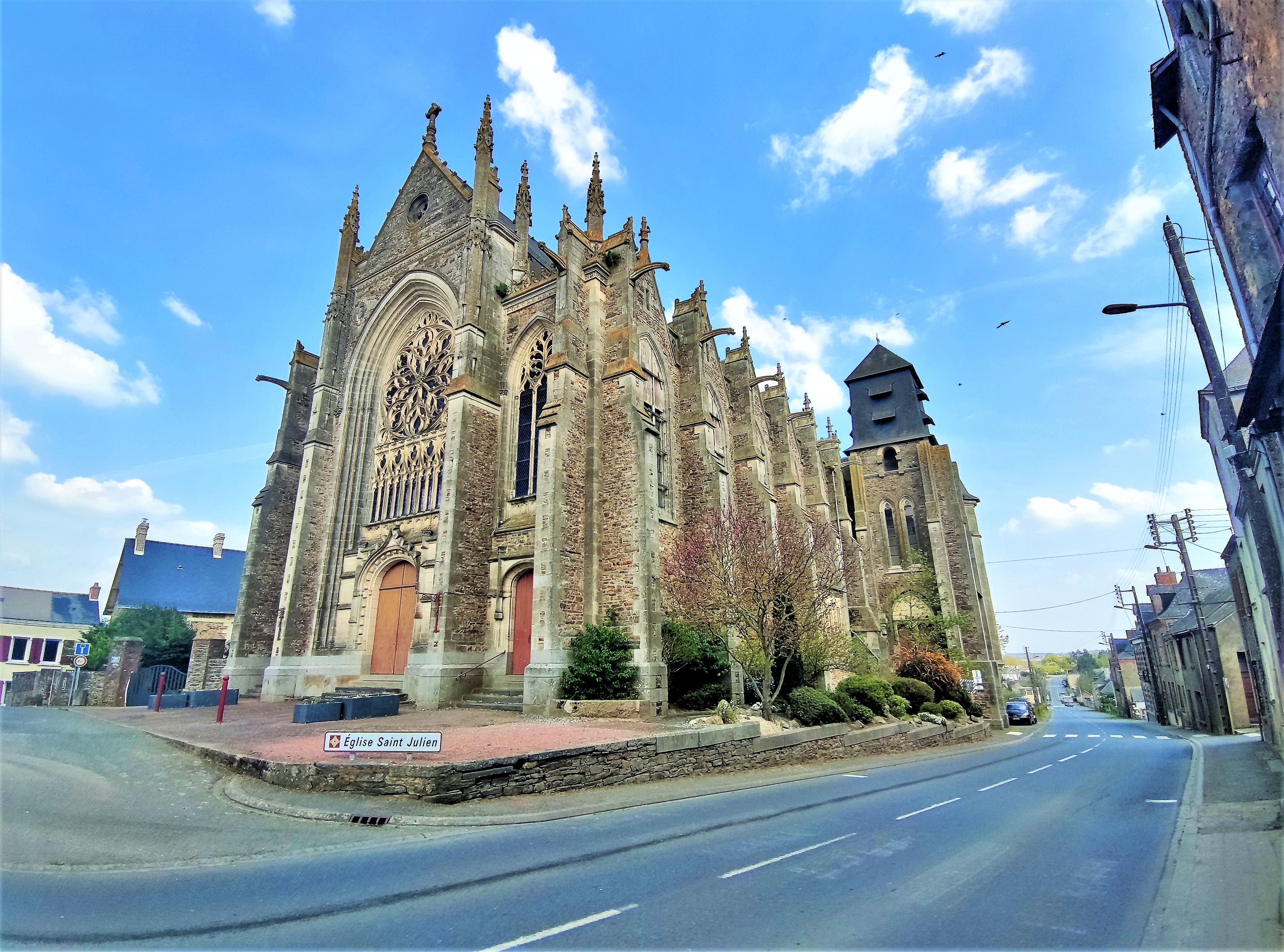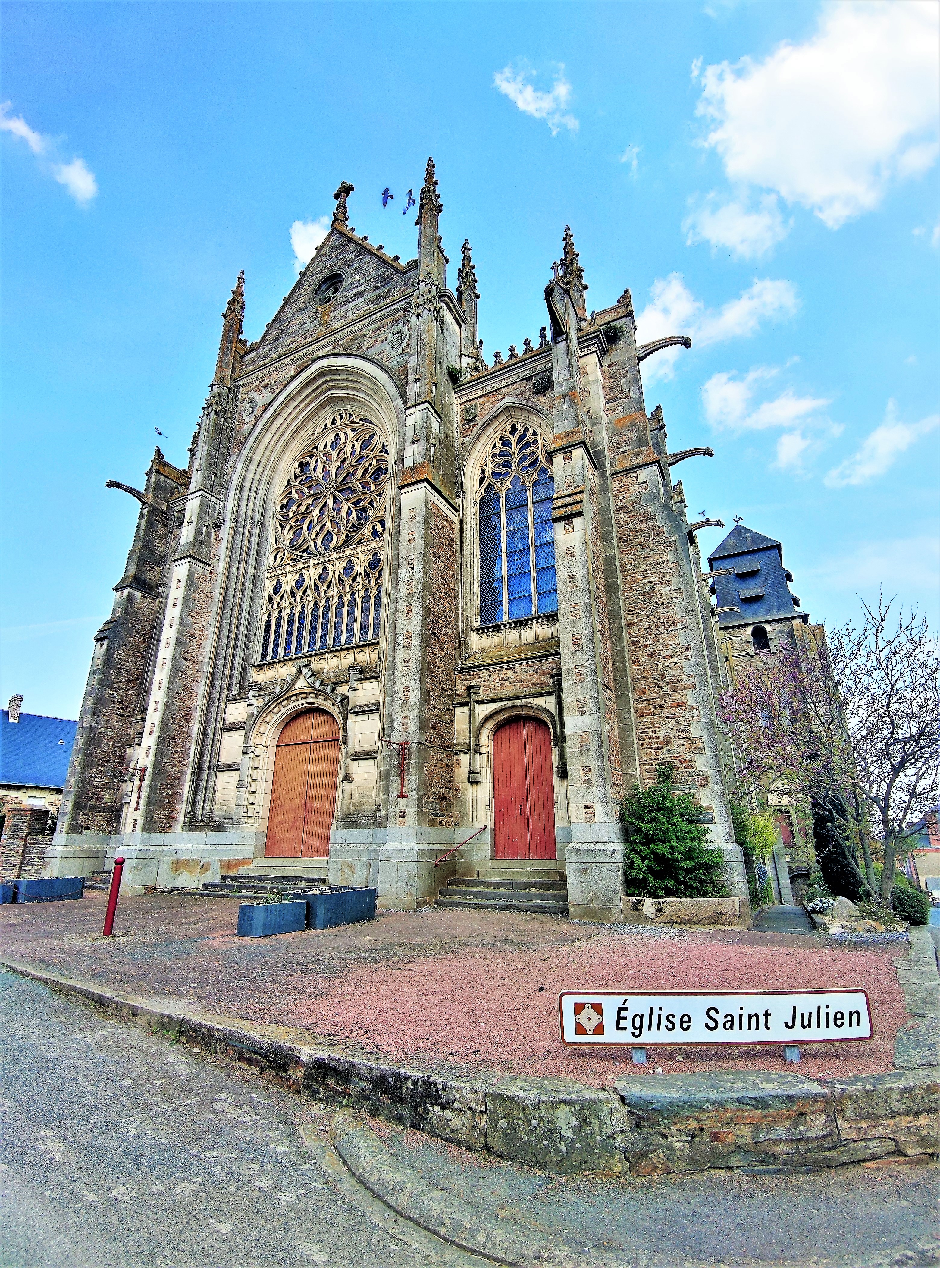 Cette église est ouverte, accueillante, colorée et chaleureuse, elle mérite que l'on fasse un détour. Découverte par hasard au cours d'une balade qui me conduisait vers Châteaubriant, cette église paroissiale Saint-Julien m'a impressionné. Construite dans une pente importante, vers le point culminant, elle impose sa présence par de belles dimensions. Église néogothique édifiée au 19ème siècle, elle remplaça un édifice gothique flamboyant. Sous le chœur, on a placé une crypte qui compense l'inclinaison du sol. Pour visiter cette crypte, il faut prendre rendez-vous à la mairie, l'église elle-même est ouverte et accueillante. Église de pèlerinage, sa grande capacité ne lui enlève rien de son côté accueillant et chaleureux, les grande baies de la nef apporte une lumière abondante. Les verrières du chœur et de la façade ouest sont sources de couleurs chaudes et de riches images.