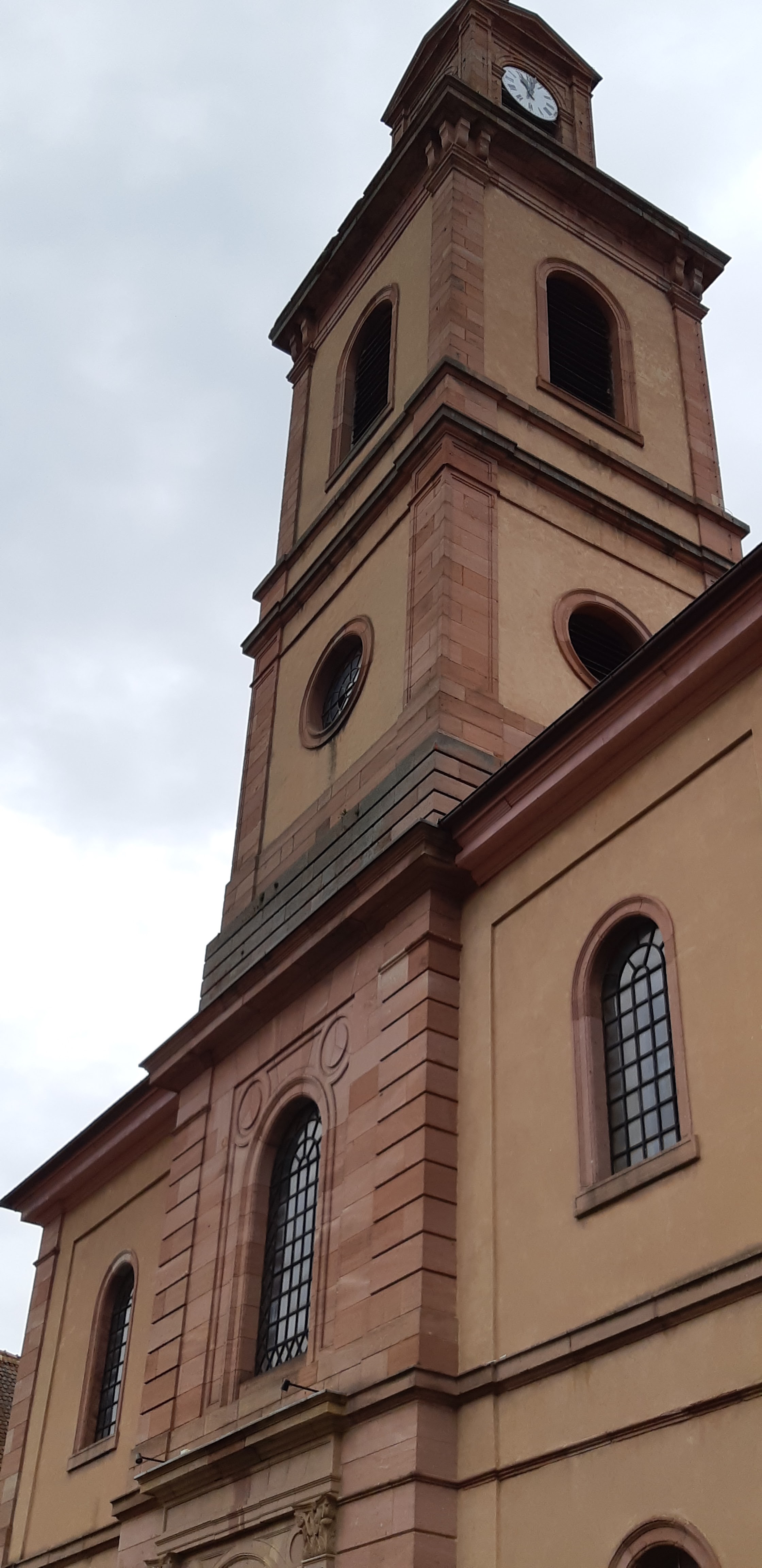 L'actuel temple protestant a été construit sur les vestiges de l'église paroissiale gothique Sainte-Marguerite des XIIe et XVe siècles, aujourd'hui disparue. Après l'introduction de la Réforme par les ducs de Wurtemberg en 1534, l'église paroissiale fut réservée au culte protestant puis partagée avec les catholiques à partir de 1687 (Simultaneum).