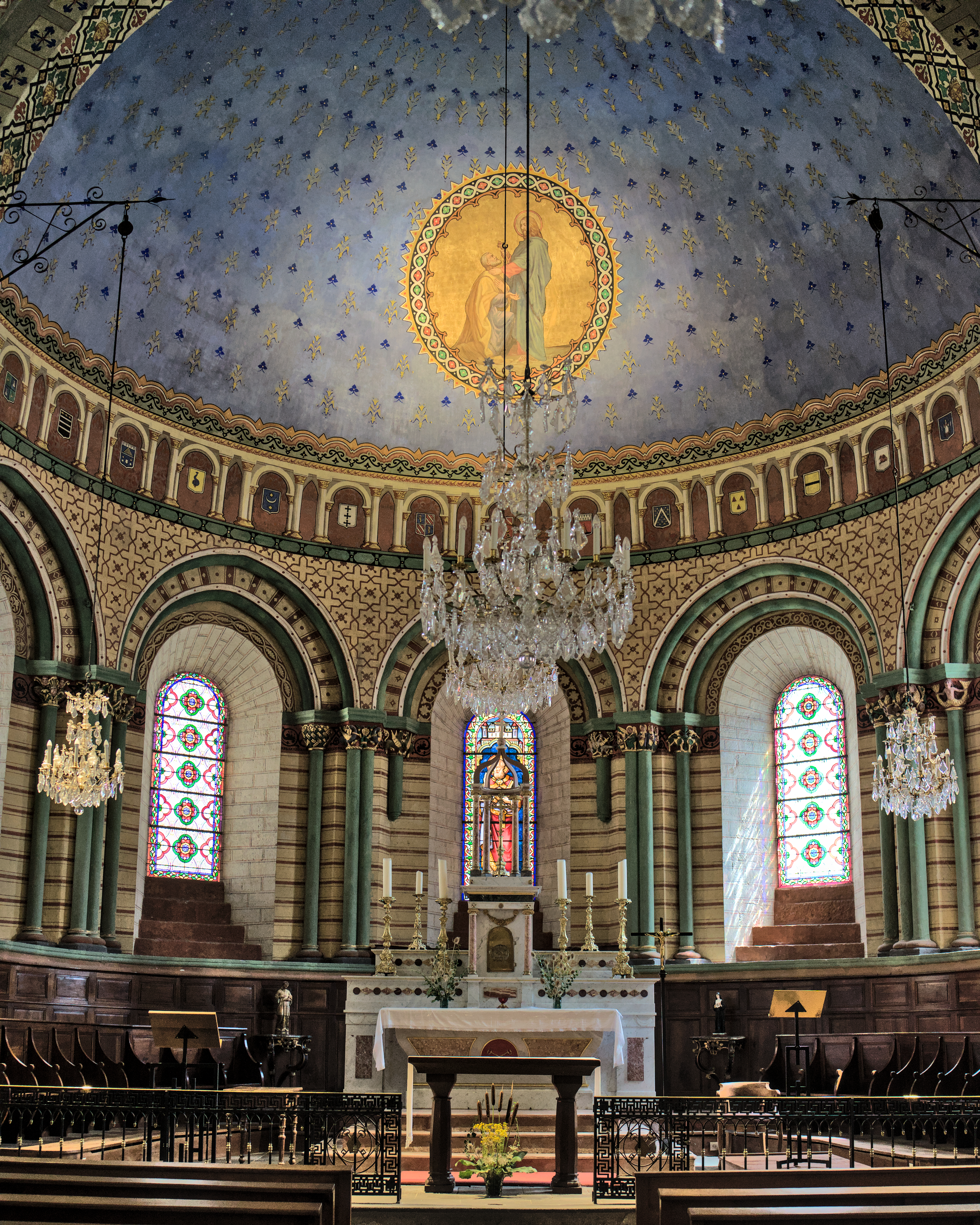 Eglise abbatiale atypique dans sa disposition et sa décoration.