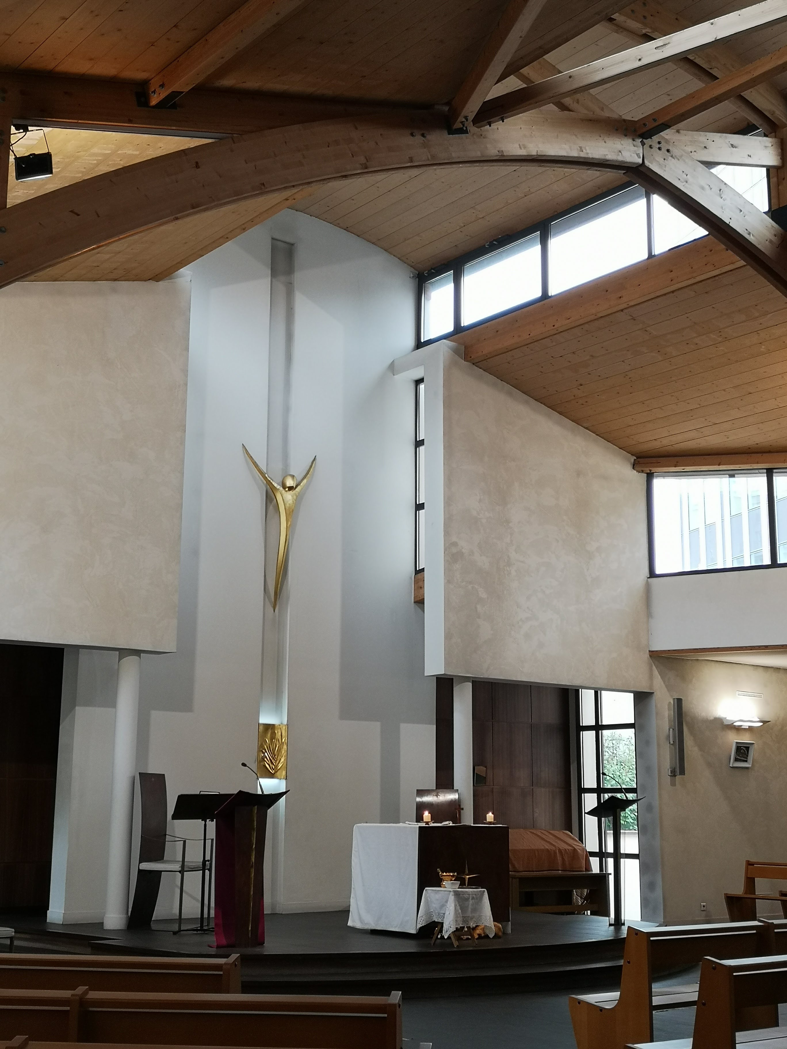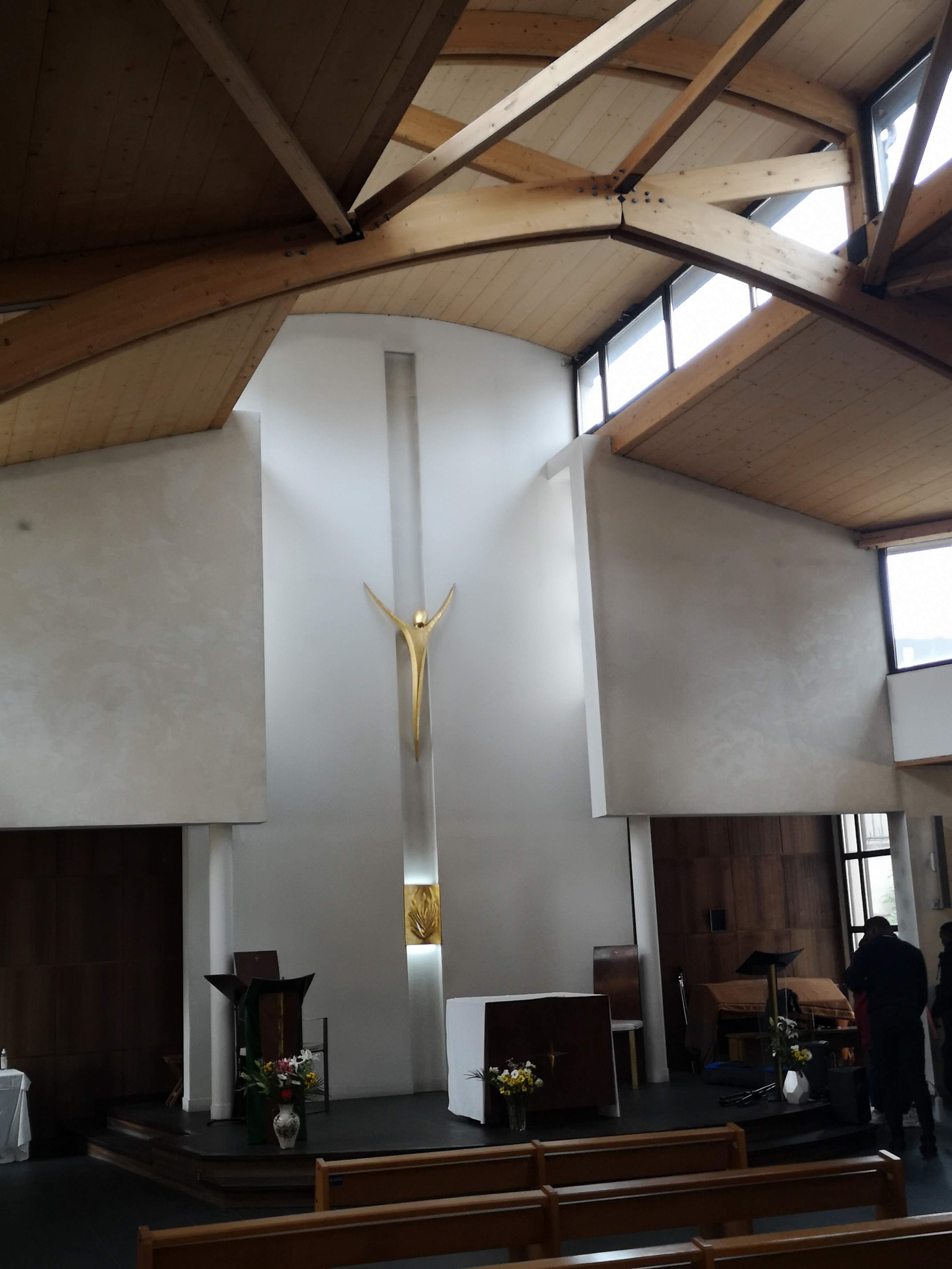 Une belle église moderne. Dommage qu'une enfant handicapée de 8 ans et sa maman se fassent virer du parvis sous prétexte de vigipirate, alors que le rassemblement d'une cinquantaine de personnes avant et après la cérémonie ne pose aucun problème.