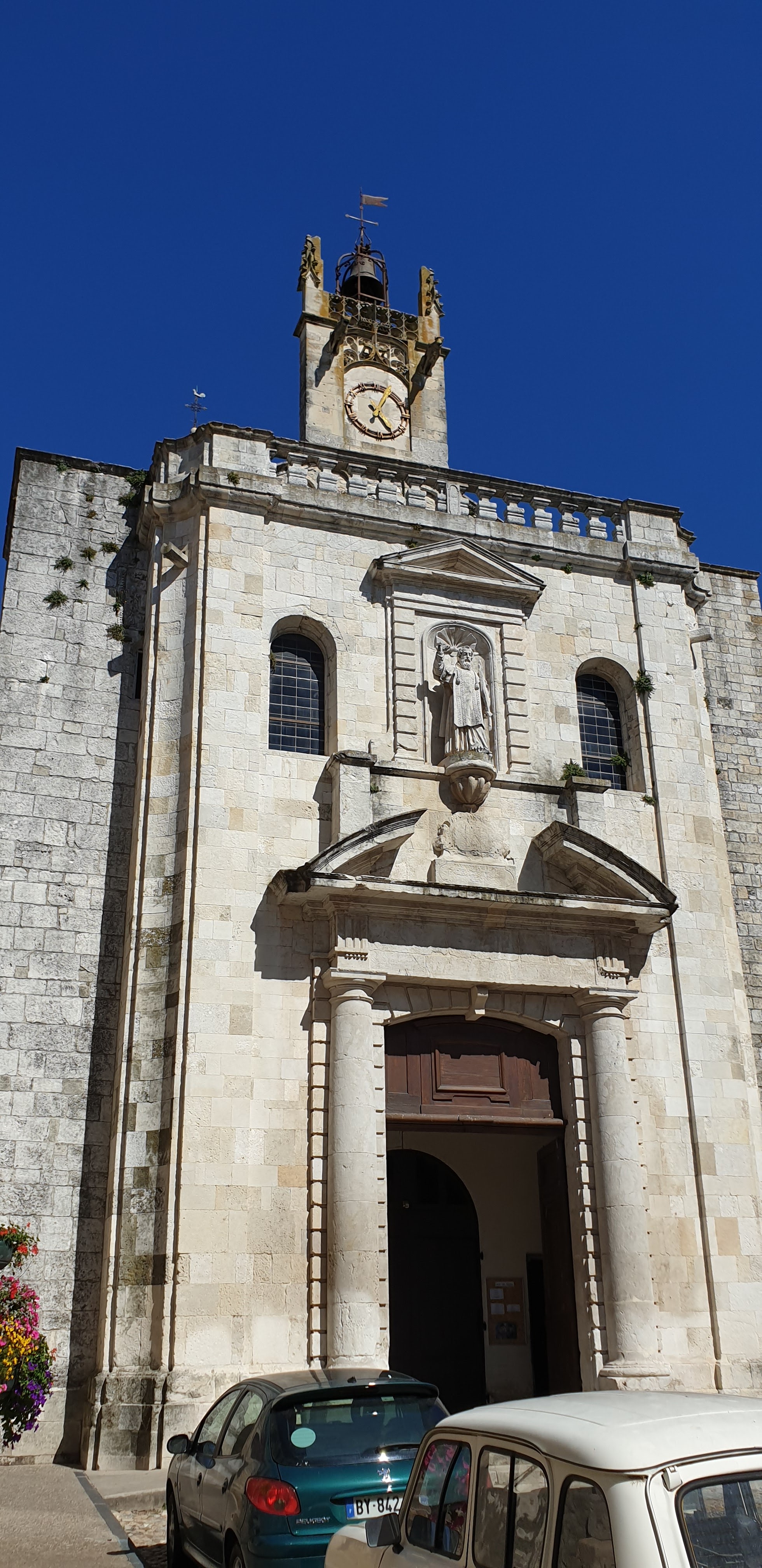 Église sur une petite placette de pavé ,où il est souvent facile,, de trouver une place de parking.