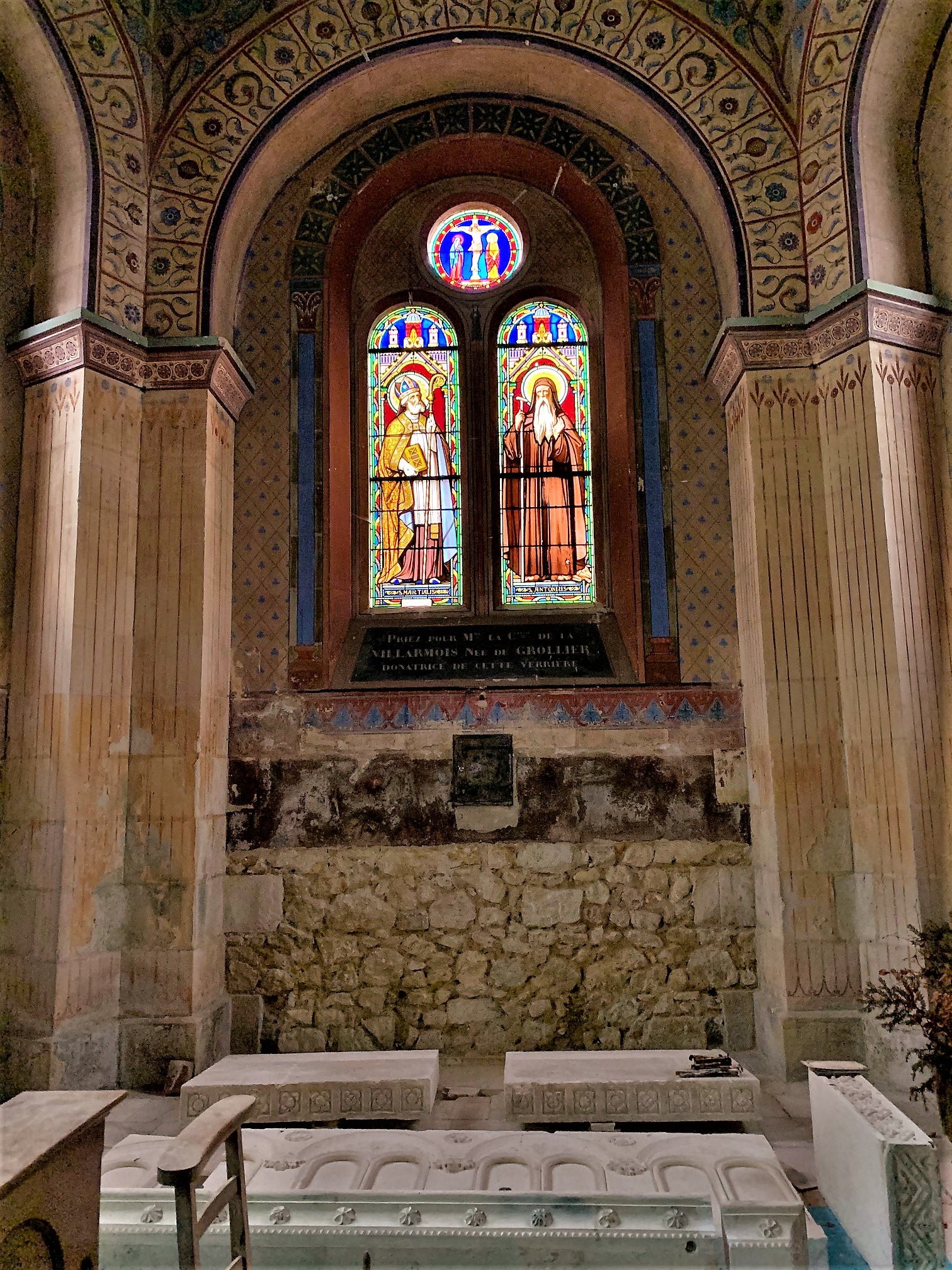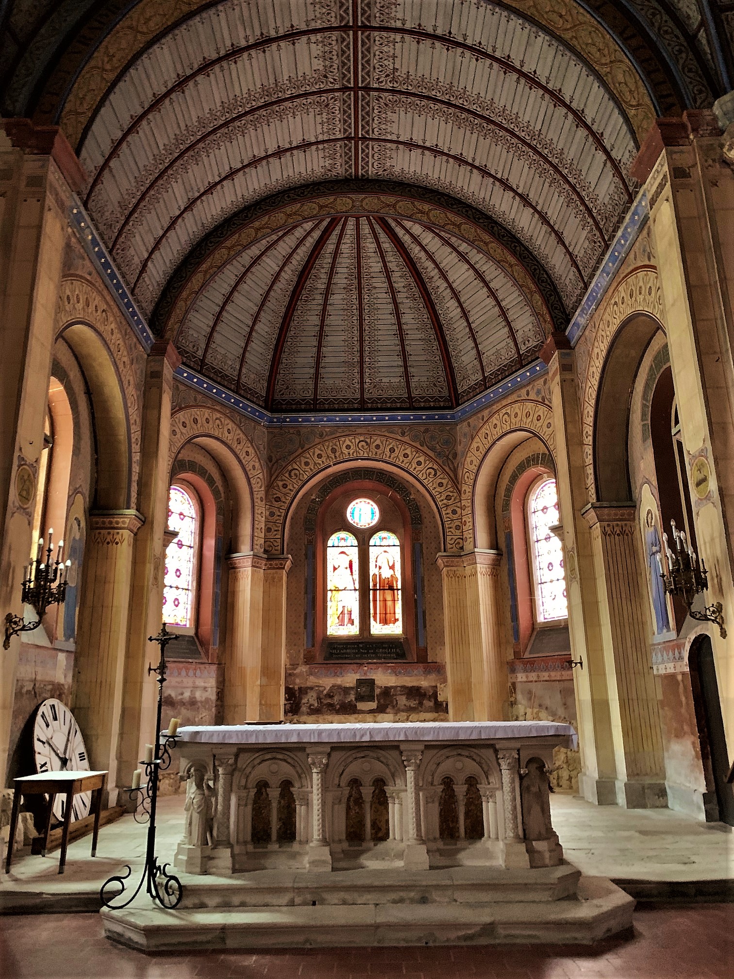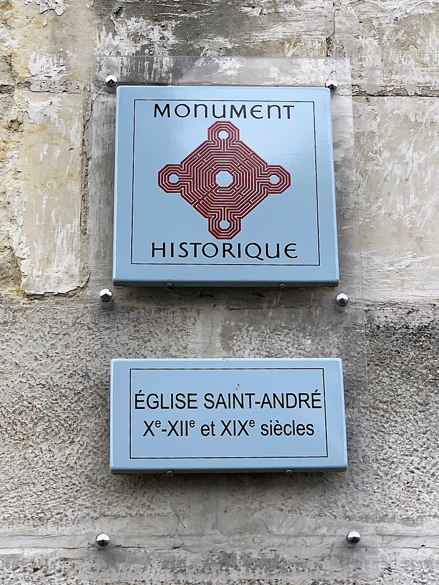 Sorte de laboratoire architectural et de techniques picturales, l'histoire de cette église est passionnante. Il existait une église romane du 12ème siècle, orientée vers le Nord-Est, dont la nécessité d'agrandissement apparue au 19ème siècle. Le projet qui vit alors le jour fut original et ambitieux, tout en ménageant les bourses des donateurs. En premier lieu, l'architecte imagina de construire une seconde église qui traverserait de part en part l'église primitive, cette dernière devenant transept. Le nouvel édifice de style néo-roman resterait en harmone avec l'architecture de l'ancien édifice. Il serait orienté au Nord-Ouest, En second lieu, les décors intérieurs seraient peints, moins couteux que des décors sculptés, et effectués avec une nouvelle technique de peintures minérales, plus résistantes. Le maitre d'ouvrage désigné fut Louis-Marie-Charles de Bodin, spécialiste du patrimoine médiéval. Il avait créé la Société de Saint-Grégoire, spécialiste de cette technique et de ce genre de chantier. L'église Saint André semble de l'extérieur assez banale, avec son clocher roman et le reste de l'édifice néo roman. Mais y pénétrer réserve quelques surprises, l'édifice est entièrement peint. Les couleurs et les thèmes choisis sont en superbes accord avec le style roman et l'esprit des peintures médiévales. Les vitraux des ateliers Lobin de Tours accompagne magnifiquement ce travail décoratif dont émane beaucoup d'optimisme, mettant l'accent sur le Christ source de vie. Classée en 2002, Sorte de laboratoire architectural et de techniques picturales, l'histoire de cette église est passionnante.