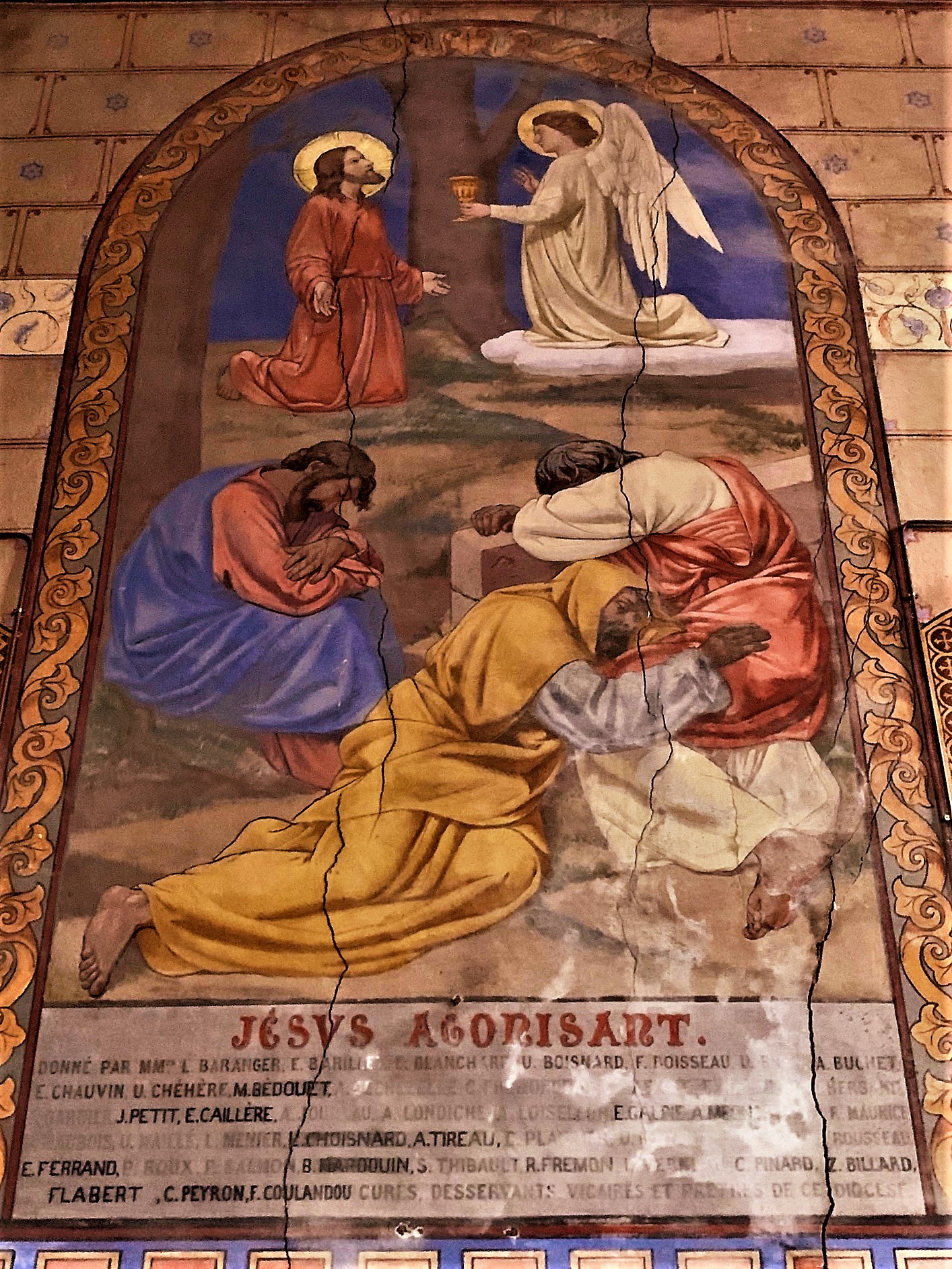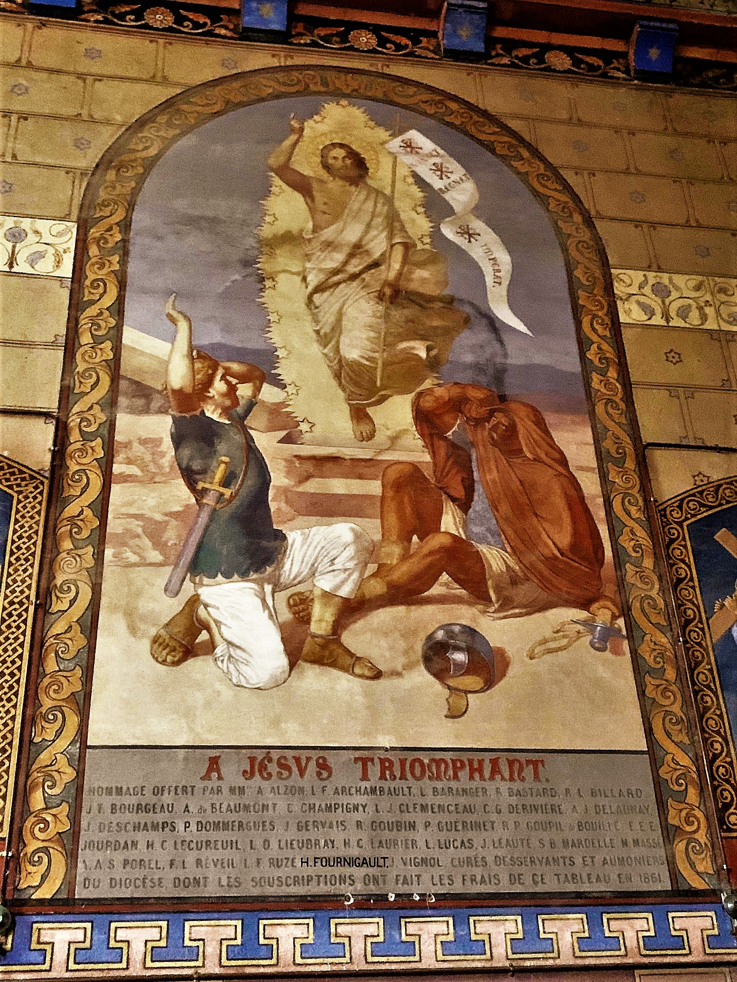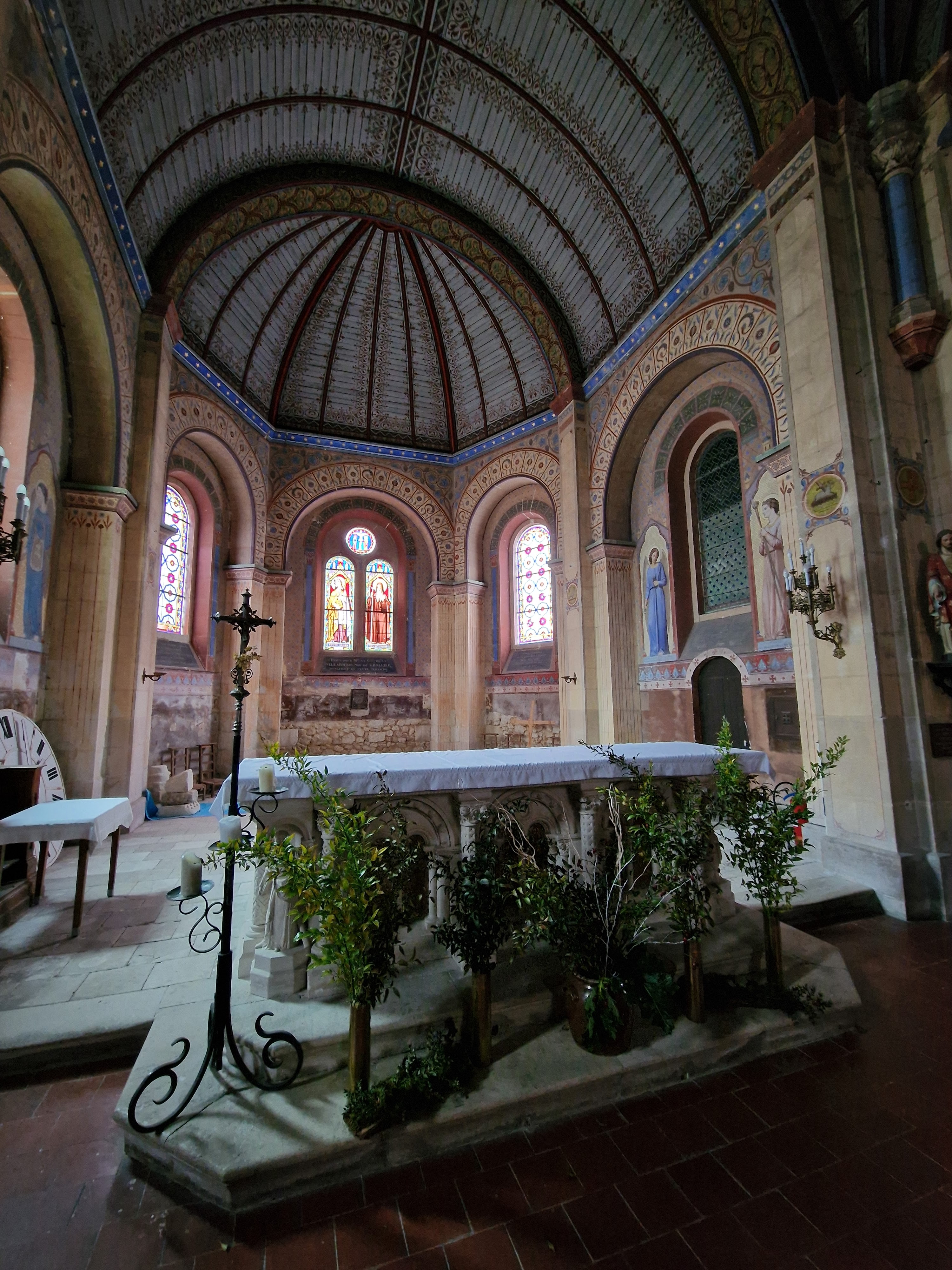 Sorte de laboratoire architectural et de techniques picturales, l'histoire de cette église est passionnante. Il existait une église romane du 12ème siècle, orientée vers le Nord-Est, dont la nécessité d'agrandissement apparue au 19ème siècle. Le projet qui vit alors le jour fut original et ambitieux, tout en ménageant les bourses des donateurs. En premier lieu, l'architecte imagina de construire une seconde église qui traverserait de part en part l'église primitive, cette dernière devenant transept. Le nouvel édifice de style néo-roman resterait en harmone avec l'architecture de l'ancien édifice. Il serait orienté au Nord-Ouest, En second lieu, les décors intérieurs seraient peints, moins couteux que des décors sculptés, et effectués avec une nouvelle technique de peintures minérales, plus résistantes. Le maitre d'ouvrage désigné fut Louis-Marie-Charles de Bodin, spécialiste du patrimoine médiéval. Il avait créé la Société de Saint-Grégoire, spécialiste de cette technique et de ce genre de chantier. L'église Saint André semble de l'extérieur assez banale, avec son clocher roman et le reste de l'édifice néo roman. Mais y pénétrer réserve quelques surprises, l'édifice est entièrement peint. Les couleurs et les thèmes choisis sont en superbes accord avec le style roman et l'esprit des peintures médiévales. Les vitraux des ateliers Lobin de Tours accompagne magnifiquement ce travail décoratif dont émane beaucoup d'optimisme, mettant l'accent sur le Christ source de vie. Classée en 2002, Sorte de laboratoire architectural et de techniques picturales, l'histoire de cette église est passionnante.