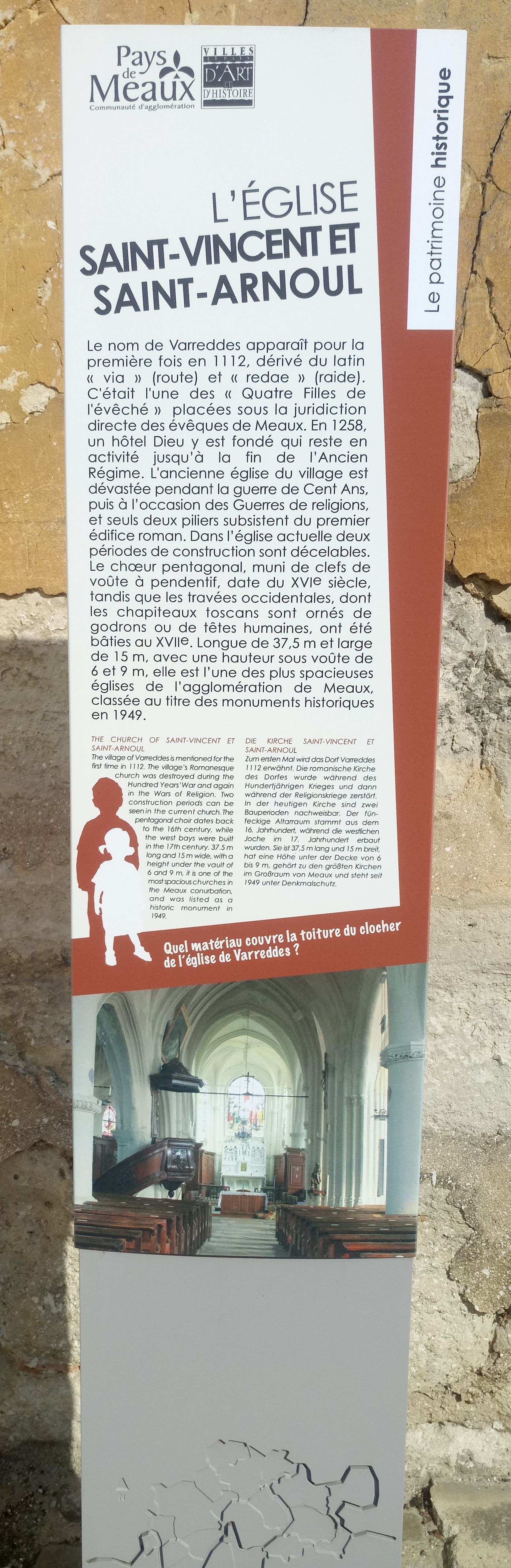 Quand vous pénétré dans l'église Saint Arnoul-Saint Vincent, et non le contraire comme l'indique le panneau de l'office du tourisme du Pays de Meaux. Elle vous invite à la méditation et à écouter la splendeur du silence intérieur. Cette église est lumineuse et au charme authentique. Pour les personnes à mobilité réduite,il y a un accès par la grande porte. Pour les messes voir sur le site : cathomeaux.fr . Pour Varreddes le 4ème samedi du mois, plus les célébrations importantes dans l'année (jour de fête).