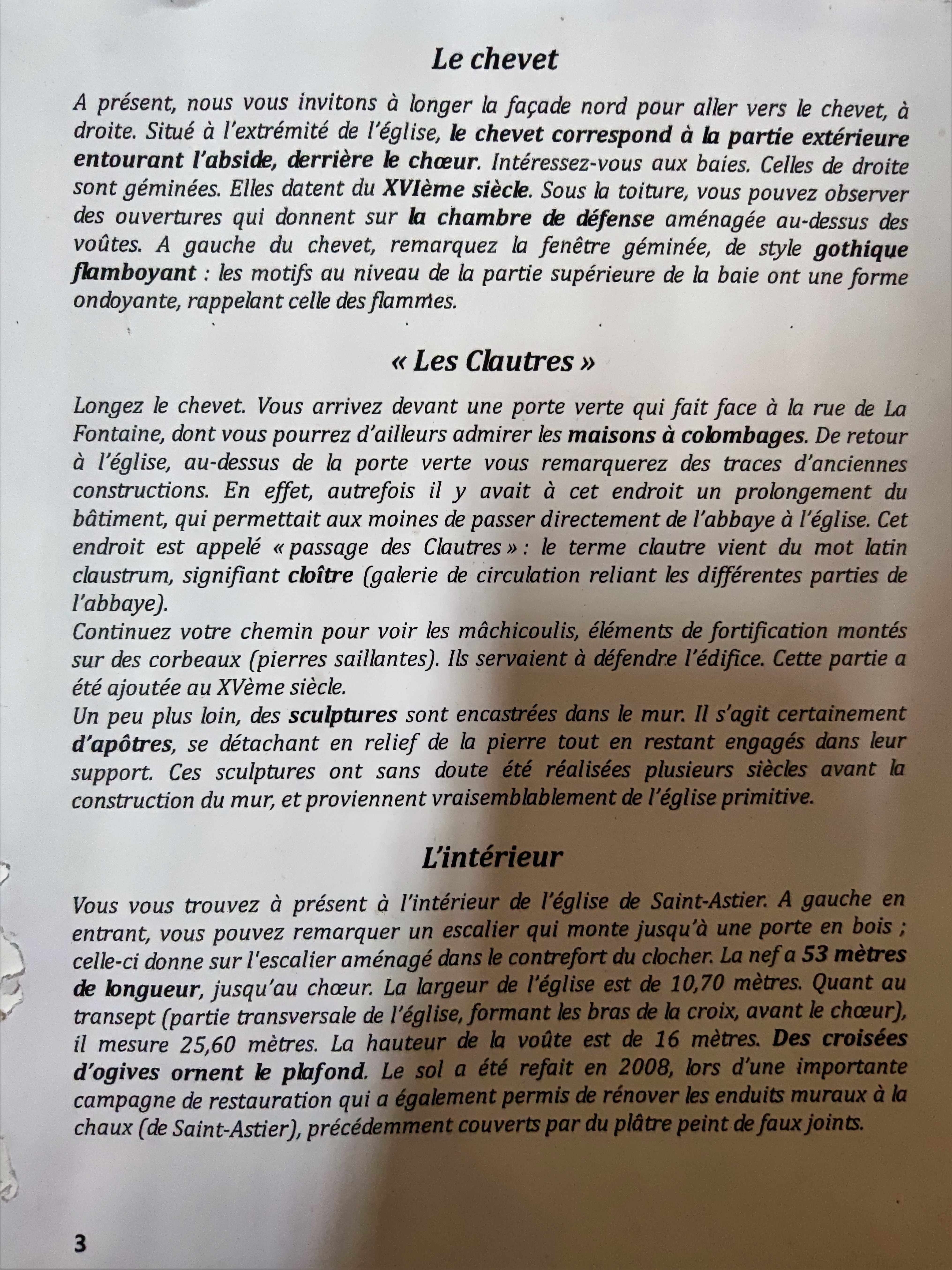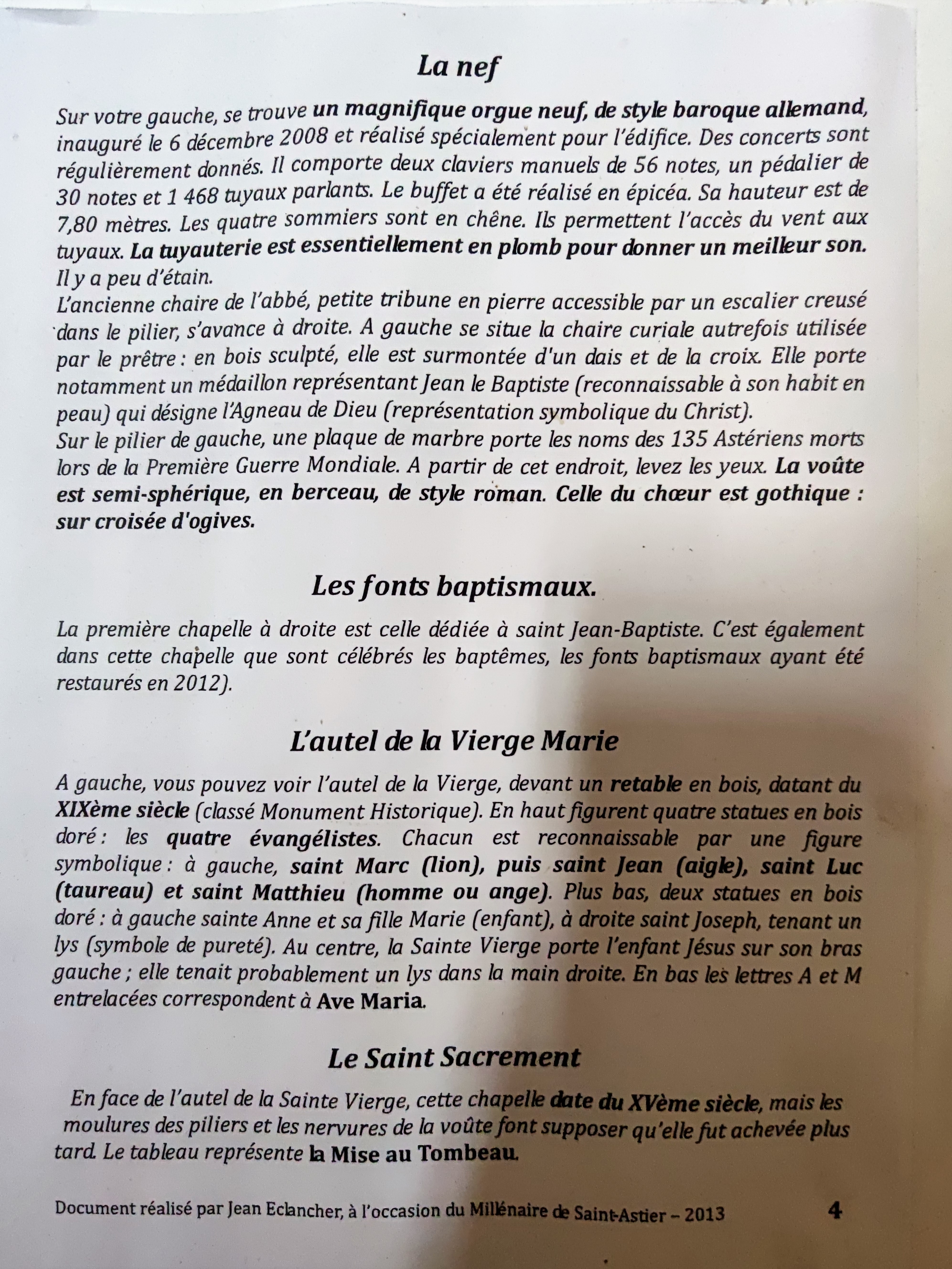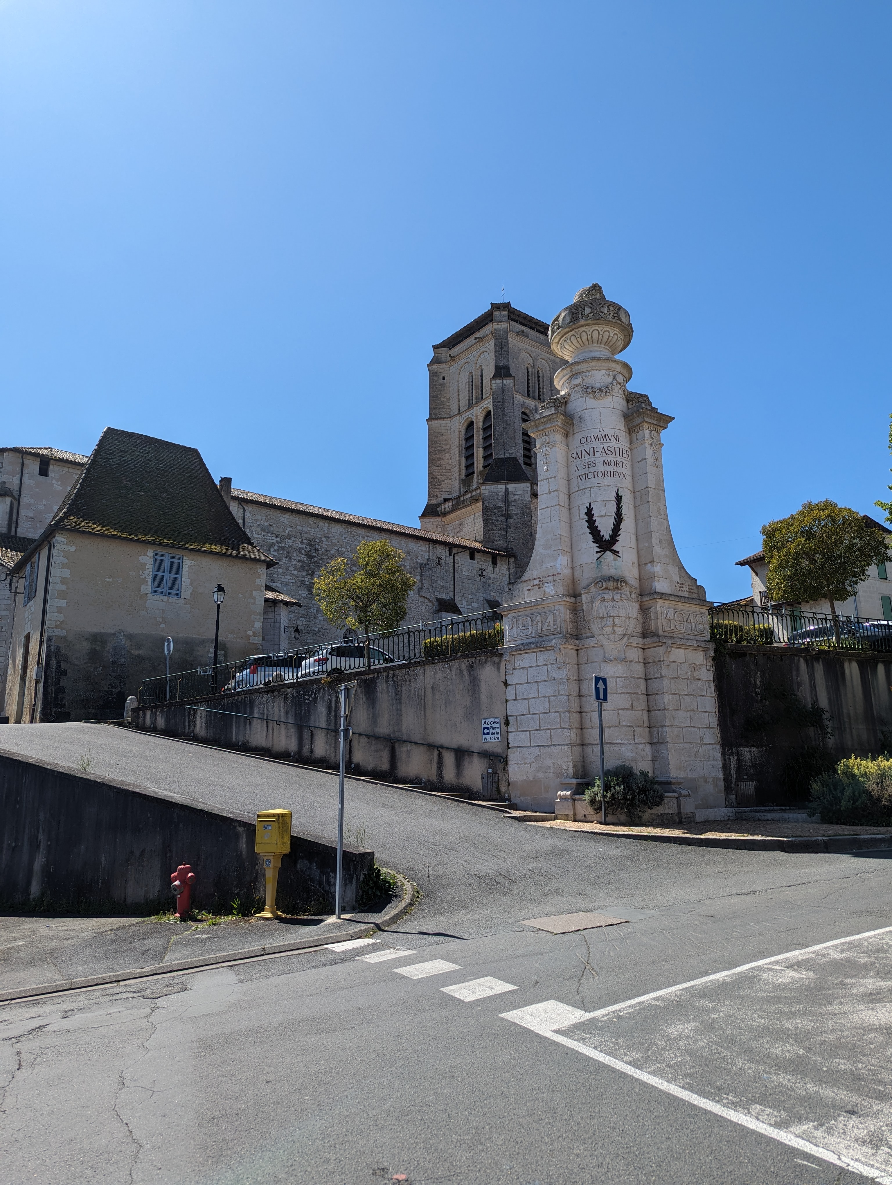Au cœur de la ville, contigu à la place du marché, un riche patrimoine bâti est à découvrir. Saint-Astier, ermite et thaumaturge du 7ème siècle, guérit, un jour, une princesse. Cet événement fut à l'origine de la construction d'un premier édifice en bois et d'un pèlerinage. Devant le succès du pèlerinage, la construction d'une église plus grande s'imposa, ce premier édifice en pierre fut détruit au 9ème siècle, au cours des invasions normandes. Au 10ème siècle, une nouvelle construction vit le jour, dont il reste aujourd'hui la crypte et quelques fondations. Du 12ème siècle jusqu'au 17ème siècle, des modifications, constructions ou reconstructions, agrandissements, restaurations, vont modifier le plan de l'église primitive. Conséquemment, le plan de l'édifice actuel est difficile à appréhender. Placée au cœur de la cité, c'est une église imposante, fortifiée, vaste, ouverte et accueillante. La découvrir m'a bien plu, je ne peux qu'encourager sa visite. L'Office de Tourisme est situé à côté, un remarquable Monument au morts est à découvrir sur la même place. Ce monument, ainsi que l'église, sont protégés par les Monuments Historiques.
