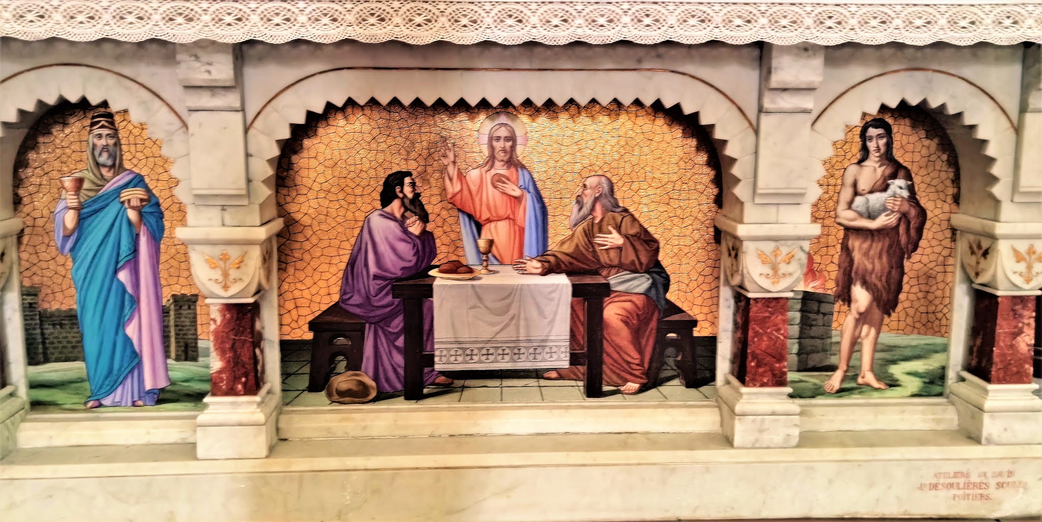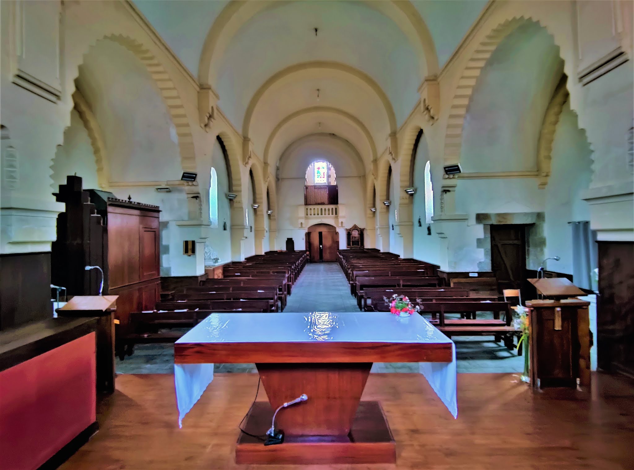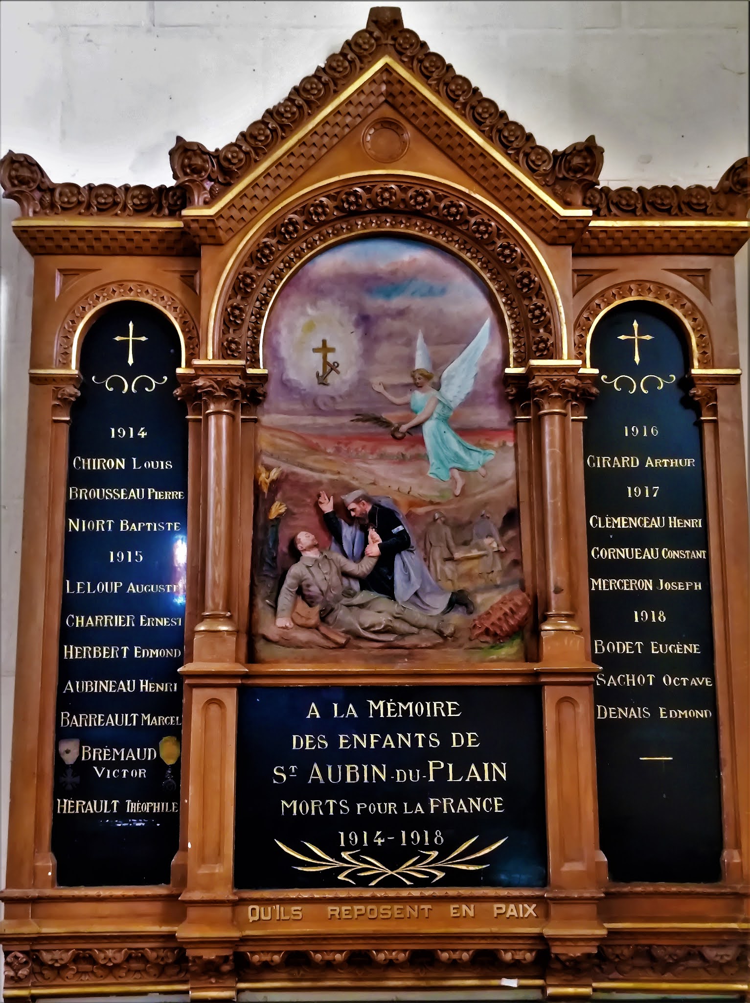 Une église du 20ème qui remplaça l'église romane brûlée par les colonnes infernales. Une église romane, sans doute du 12ème siècle, occupa cet endroit. Restaurée en 1736, elle semblait avoir un avenir serein. Mais en 1794, un drame terrible frappa le village : le général Grignon, à la tête des colonnes infernales, incendia l'église Saint-Aubin, exterminant la population du village qui l'avait choisi comme refuge. L'édifice fut plus ou moins restauré, l'activité cultuelle put reprendre dès 1802. Mais conséquemment à l'incendie, les dégradations inévitables imposèrent le projet d'une reconstruction. Cette dernière débuta en 1904, le projet était simple et classique, clocher-porche et plan en croix. Le style néo-roman fut adopté, arcs doubleaux et ouvertures en plein cintre, voûtes en berceau. Le sanctuaire occupe une abside voûtée d'ogives, des arcatures au Nord et au Sud de la nef offrent une certaine élégance. Les vitraux sont des ateliers Lux Fournier de Tours, ils datent de 1904 et 1905. Ouverte et accueillante, cette église est un lieu parfait, quelque soit sa position dans les différents niveaux de croyances, pour se détendre, méditer ou prier.