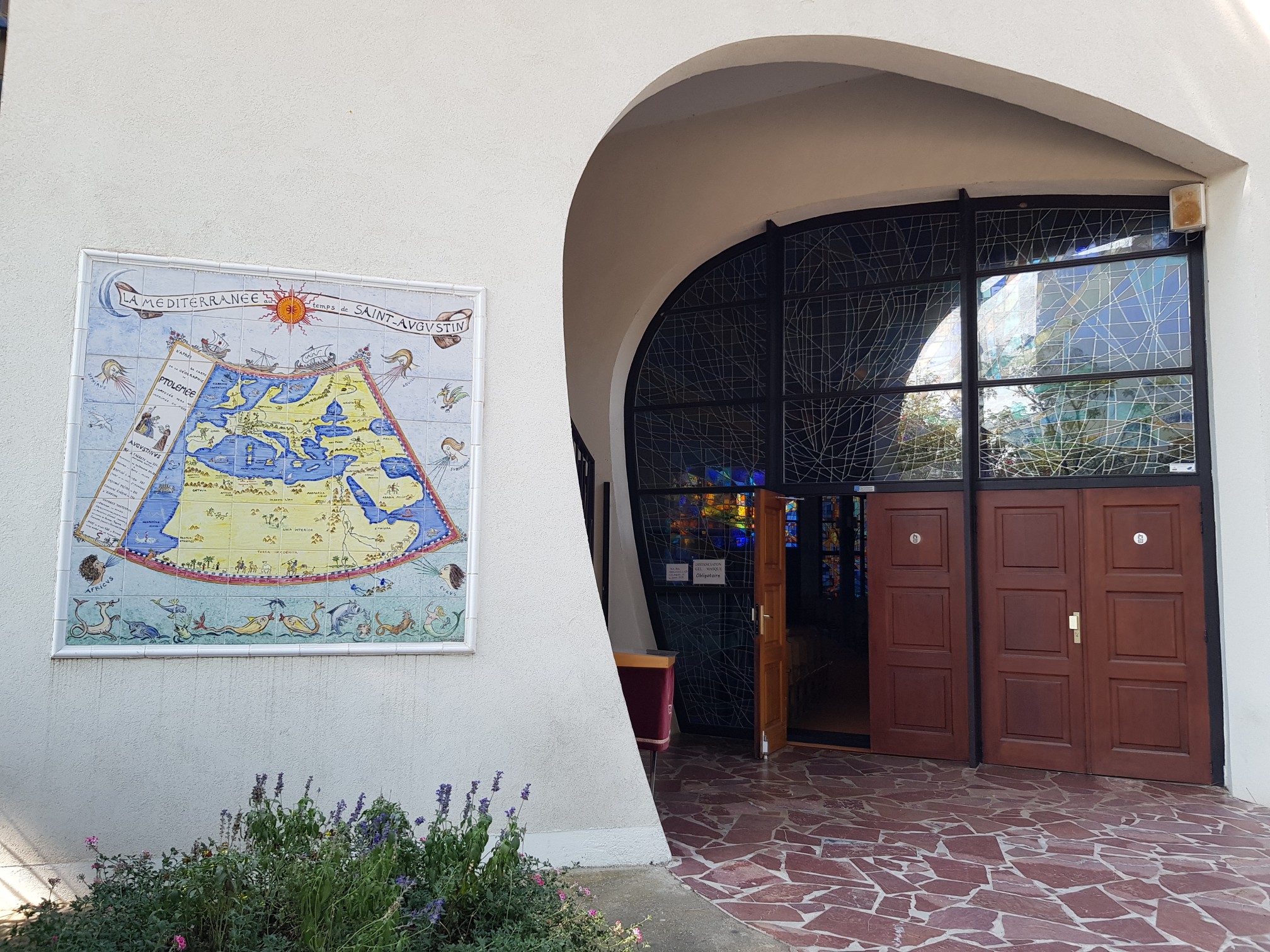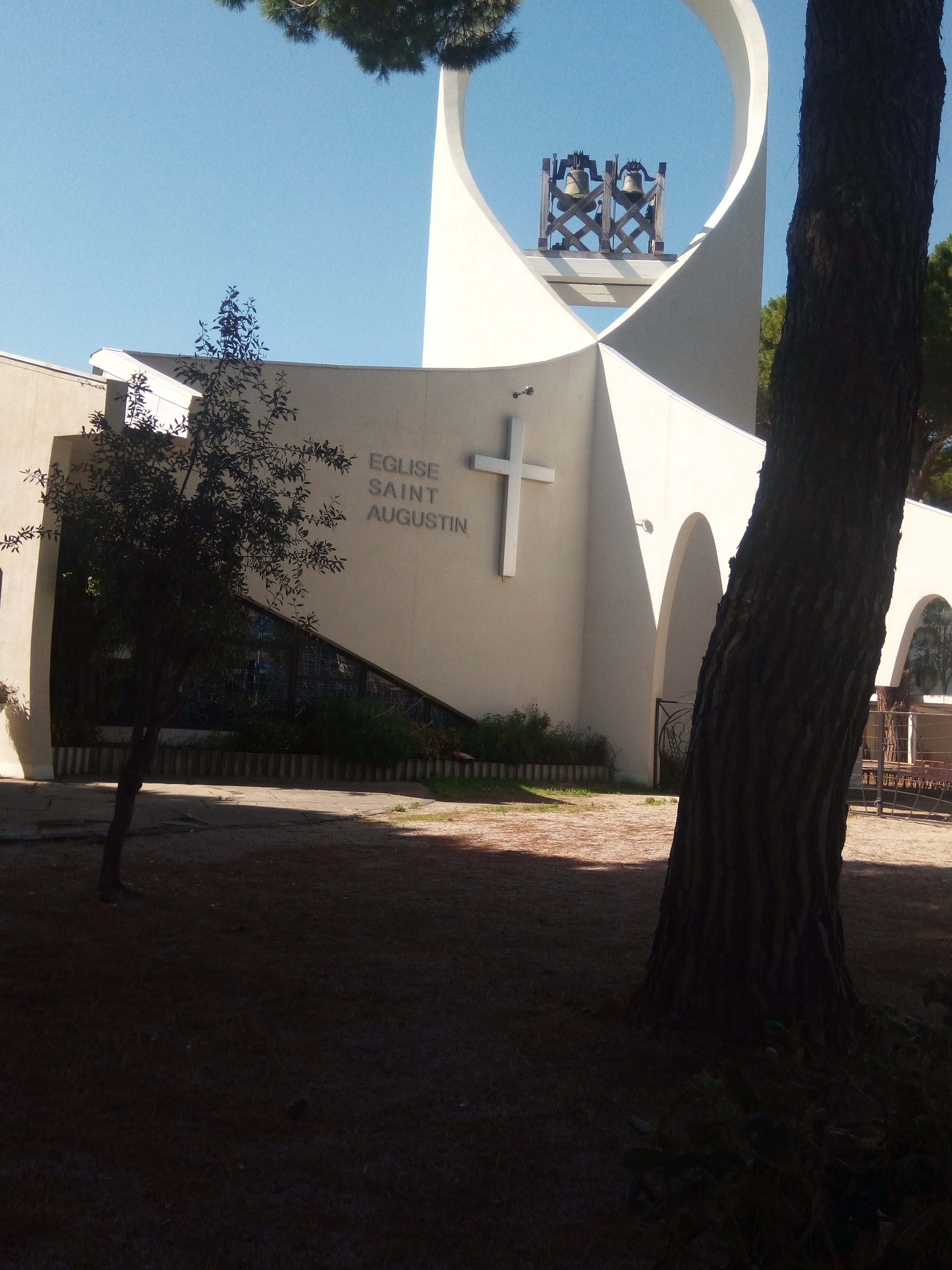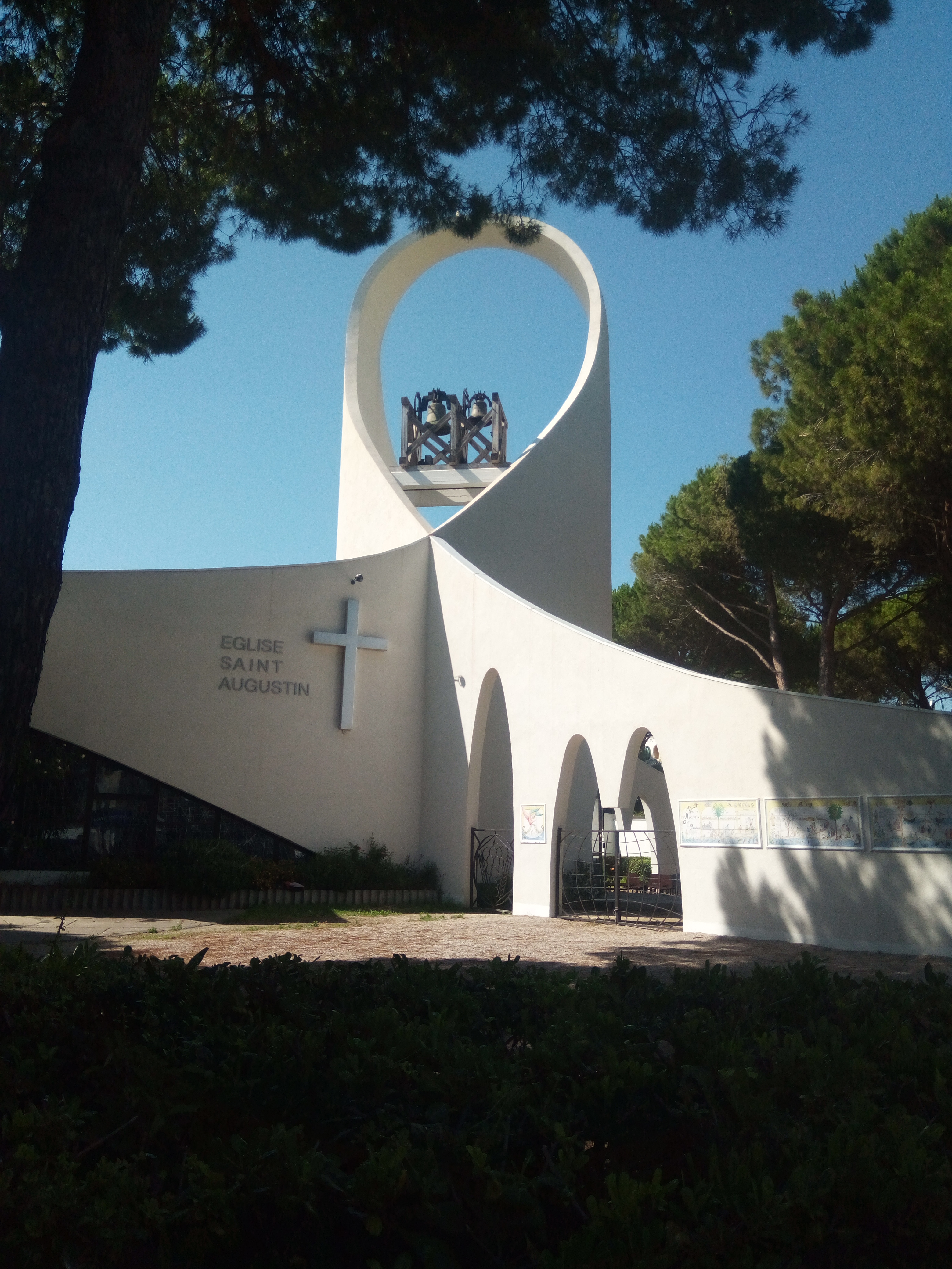 Eglise très moderne. Il est agréable d'entendre les cloches l matin au réveil lorsque nous habitons a proximité. Il ne faut pas se contenter de la regarder de l'extérieur et de regarder la fresque sur la façade extérieure qui évoque le périple de Saint Augustin, il faut y pénétrer...nous sommes étonnés de voir ce type d'église, les vitraux sont magnifiques, aucune fioriture d'or etc.....nous ressentons de la simplicité qui permet un recueillement plus approfondi. Une annexe avec des bancs est installé juste à côté pour des concerts en plein air sous les pins