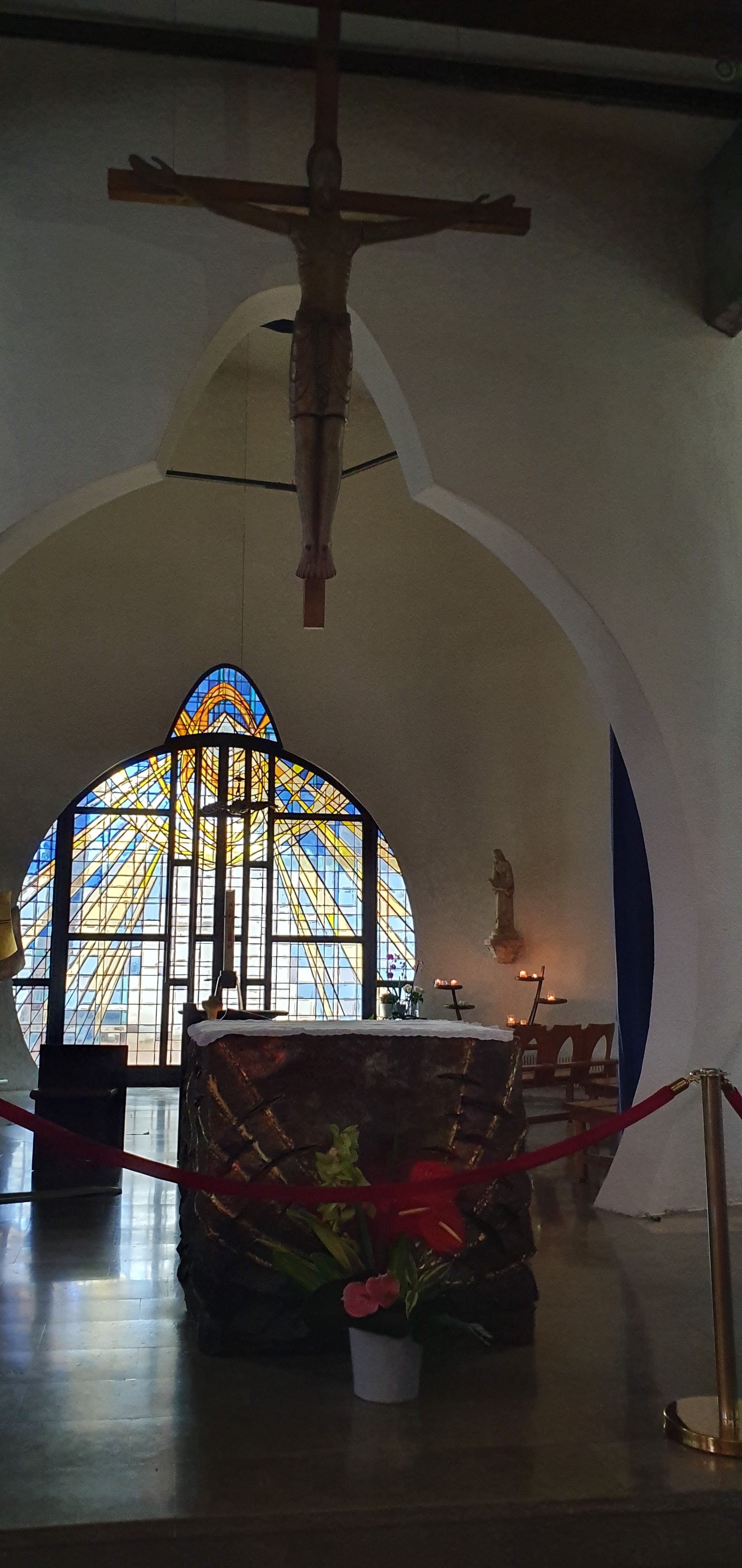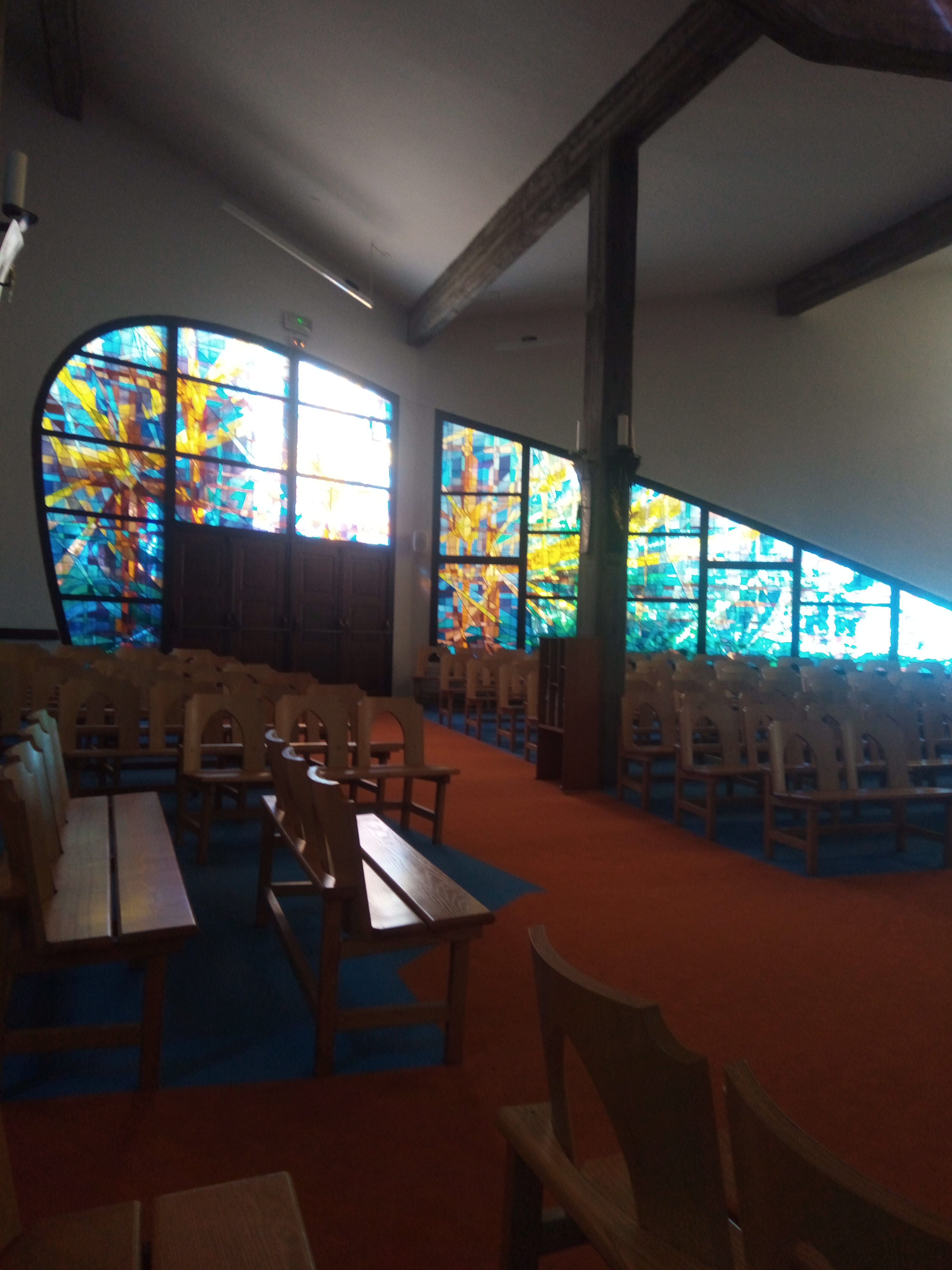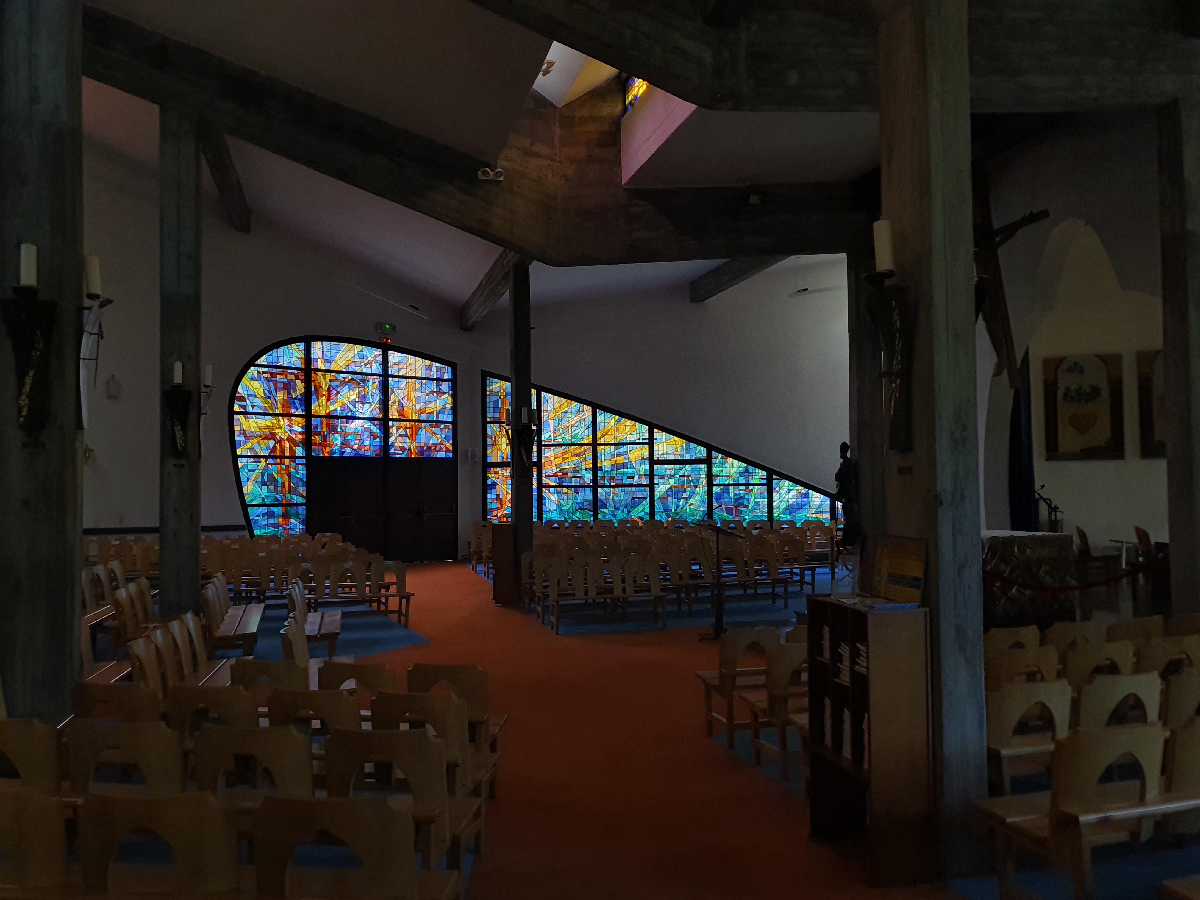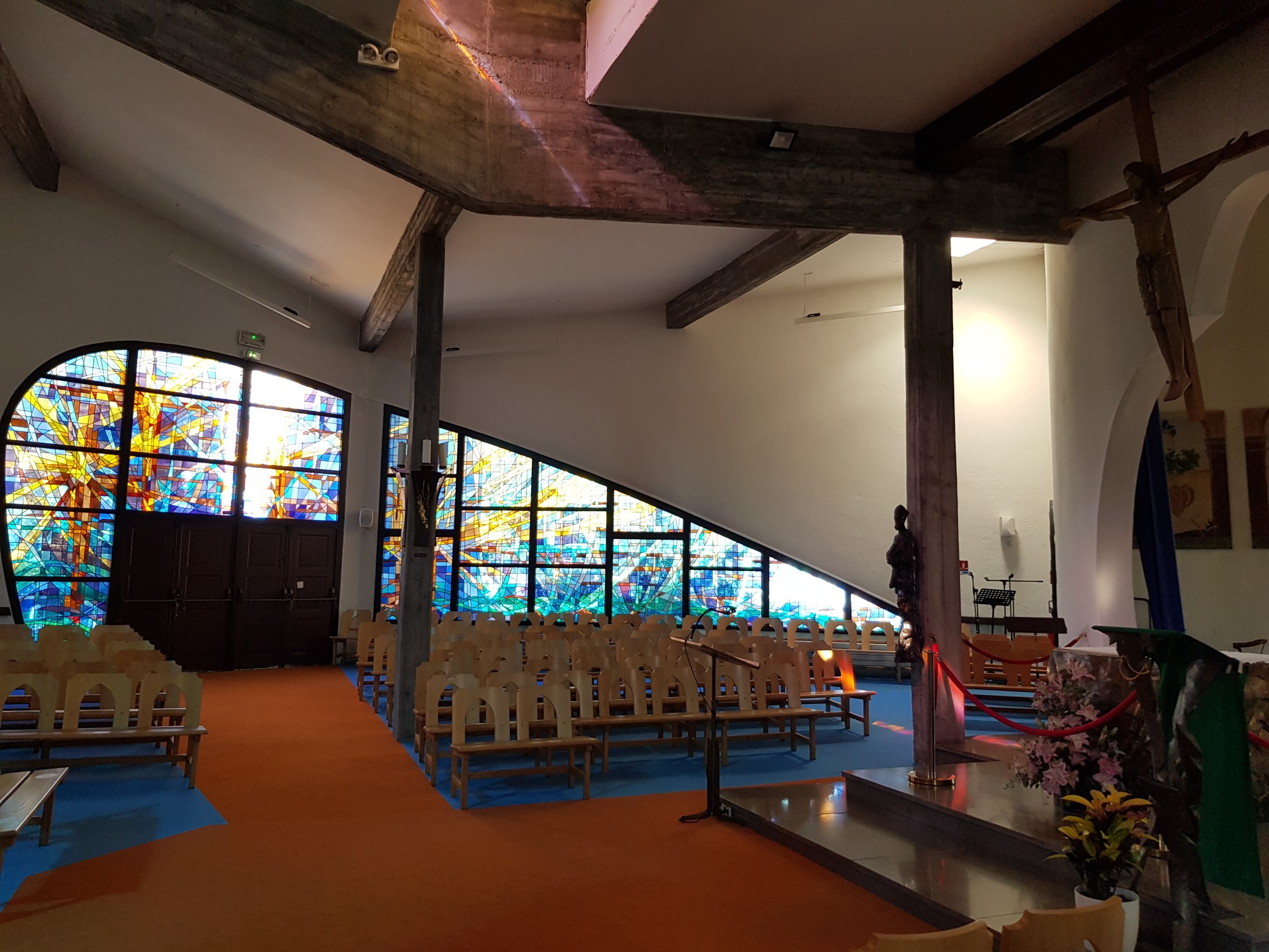 Eglise moderne beaux vitraux lieu de recueillement avec musique on peut prier la vierge Marie petite chapelle prévue.