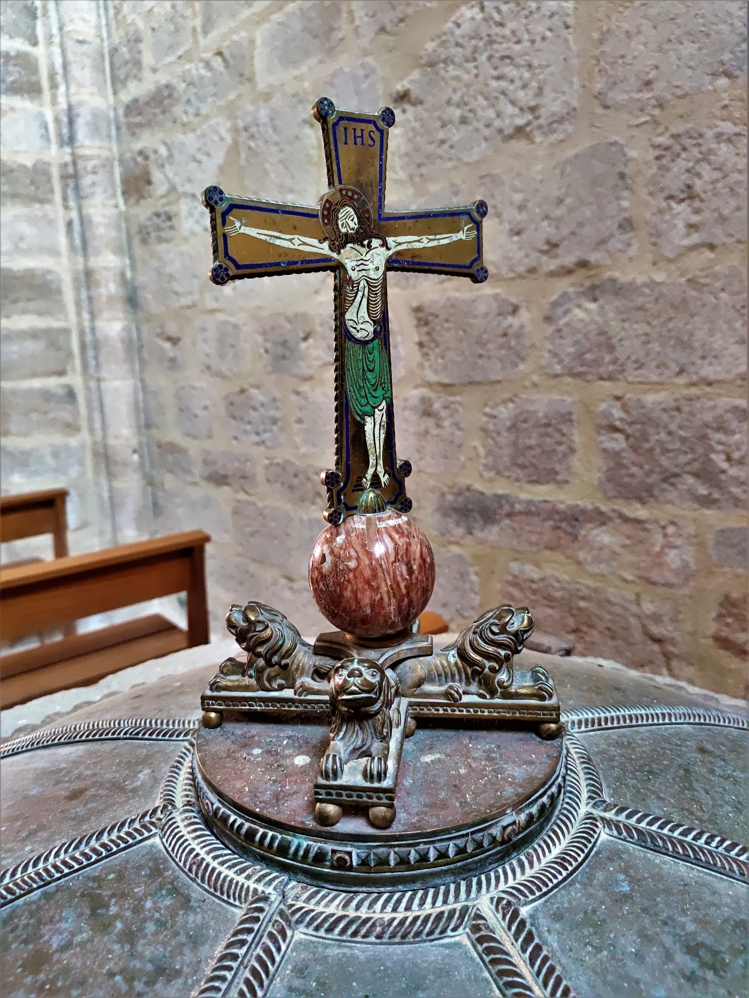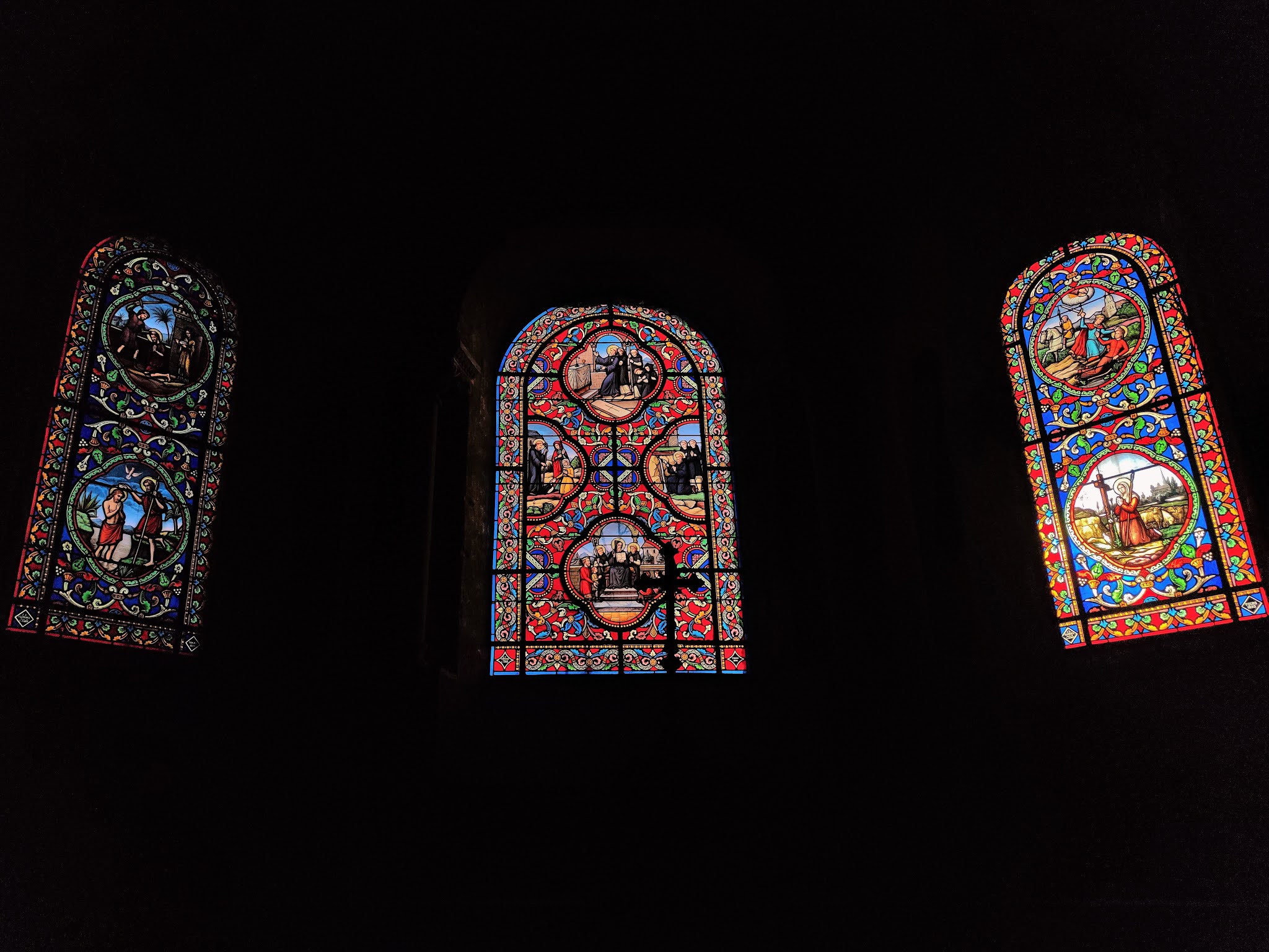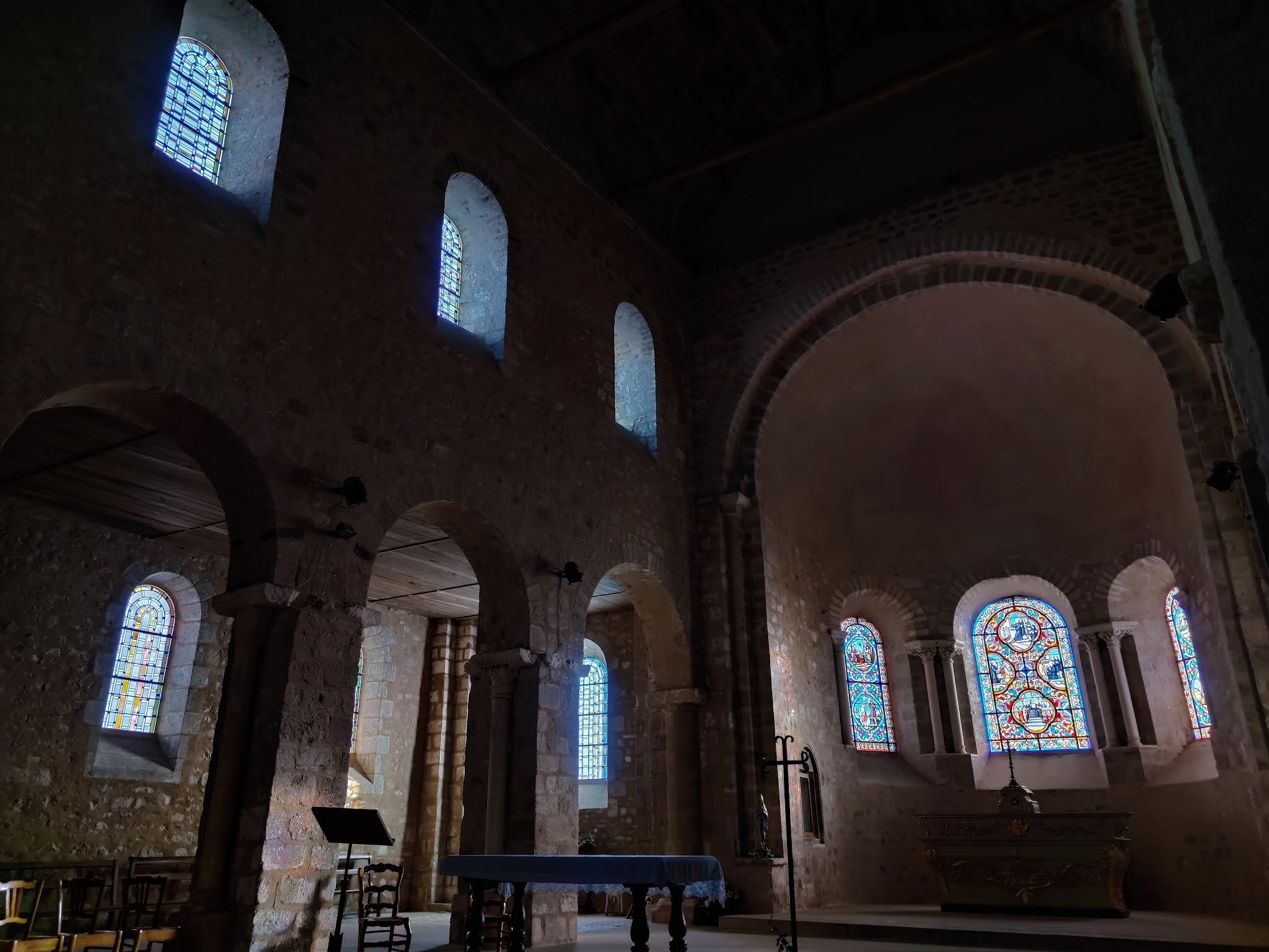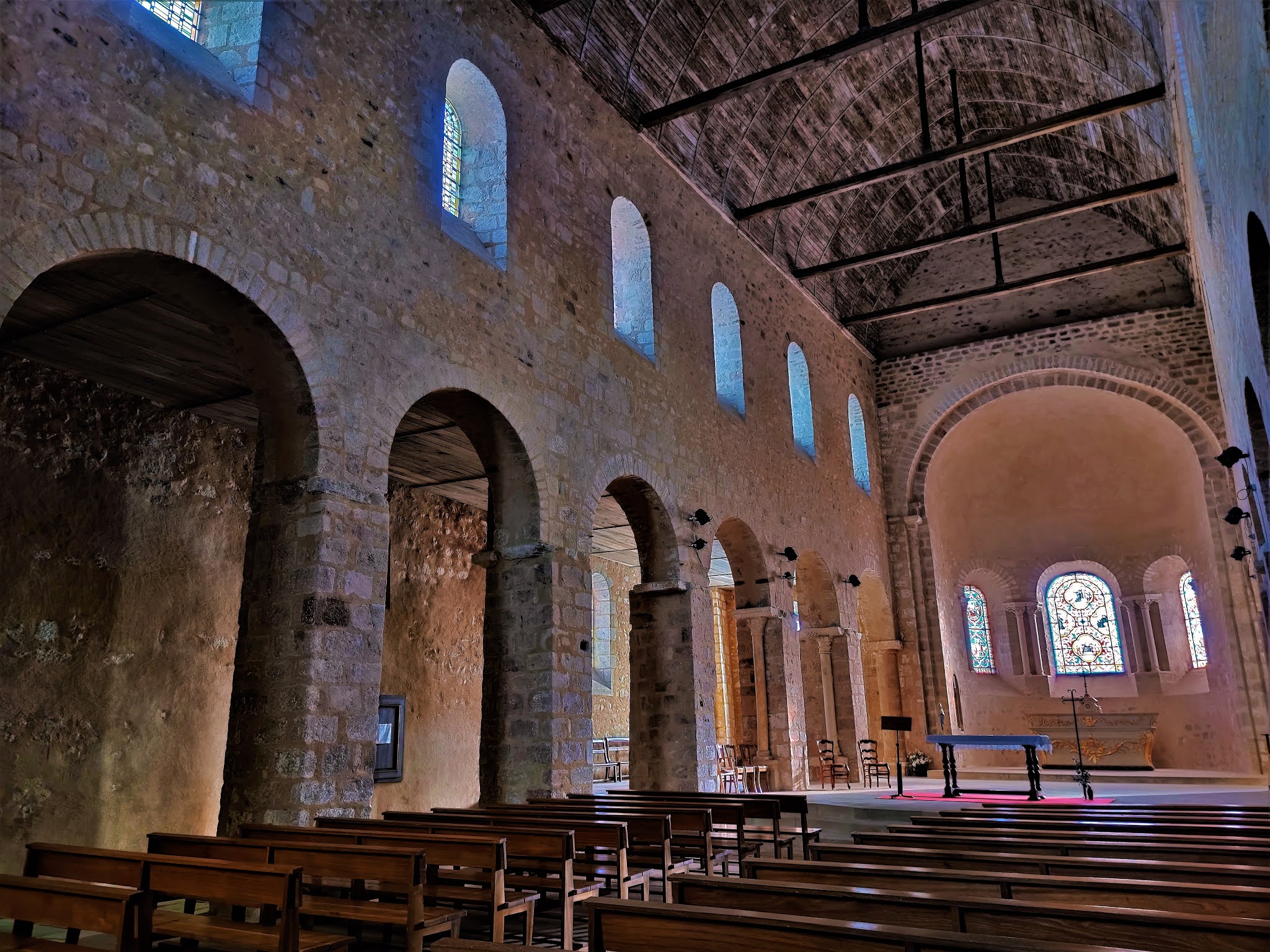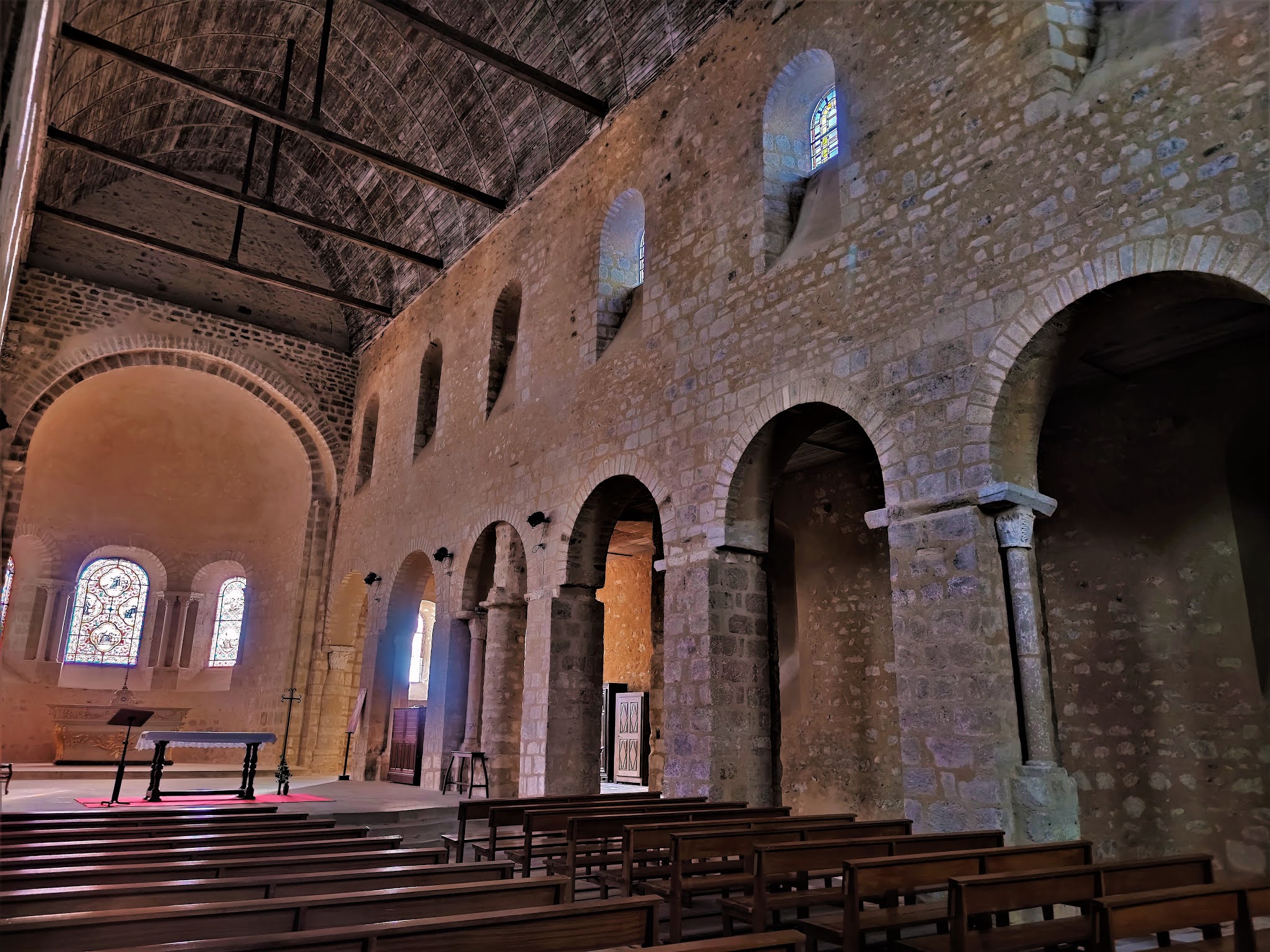 Une superbe restauration, pratiquant judicieusement le réemploi, lui a permis de renaître. Une église sobre, voir austère, dépouillée d'artifices décoratifs, même s'ils subsistent quelques décors sculptés, survivant d'un millénaire et protégés par une brillante restauration. Les vitraux magnifiques apportent une touche de fantaisie dans cet édifice de l'an 1000. Quelques modifications sont intervenues, un clocher porche gothique et la disparition de deux absides. Recouverte d'enduit à l'intérieur avec des décors de faux joints, c'était tout l'esprit de cette église préromane qui allait disparaitre. Une superbe restauration, pratiquant judicieusement le réemploi, lui a permis de renaître. La visiter, c'est s'autoriser un voyage dans le temps de mille ans. Le prieuré du 15ème siècle qui jouxte l'église ouvre normalement en été.