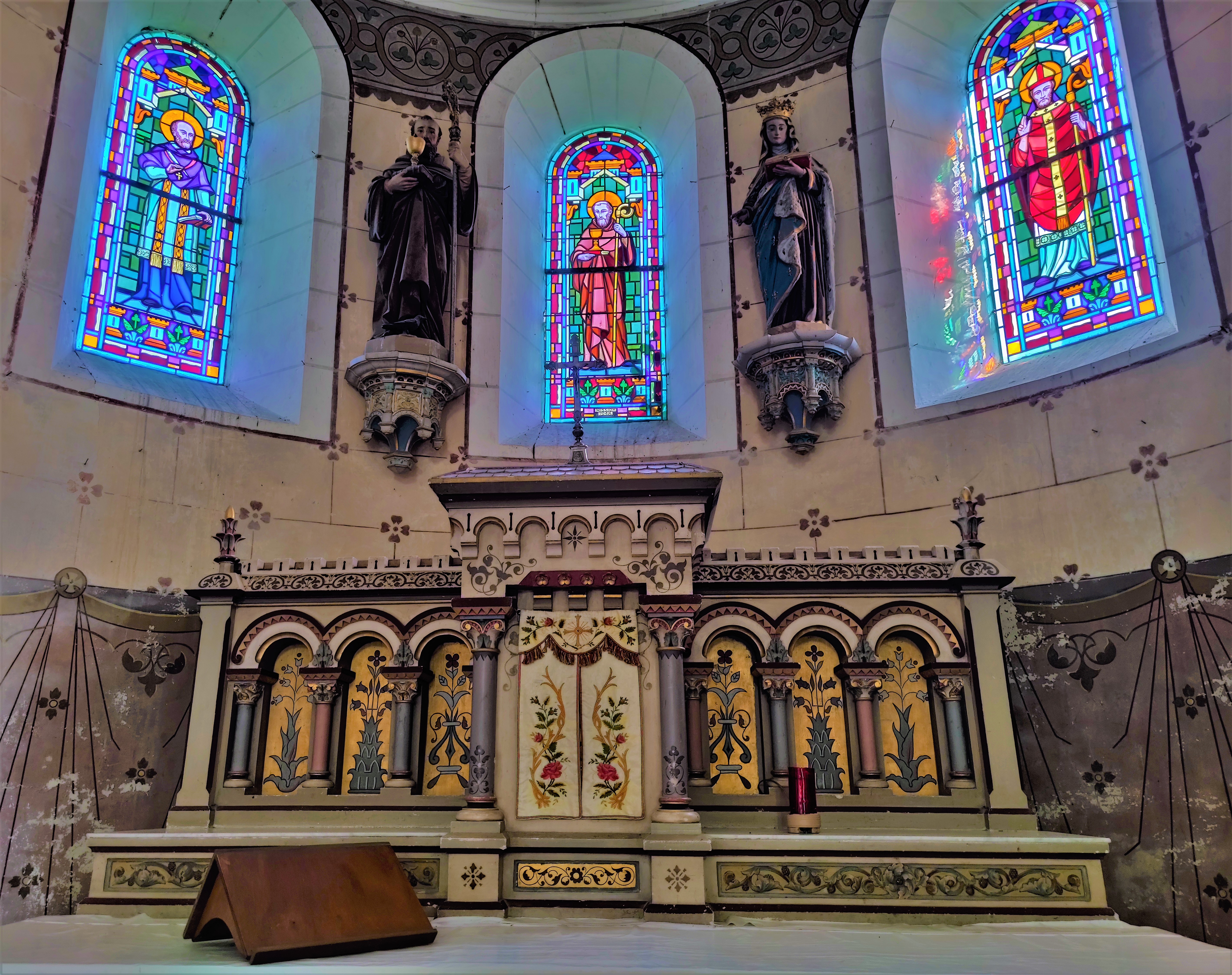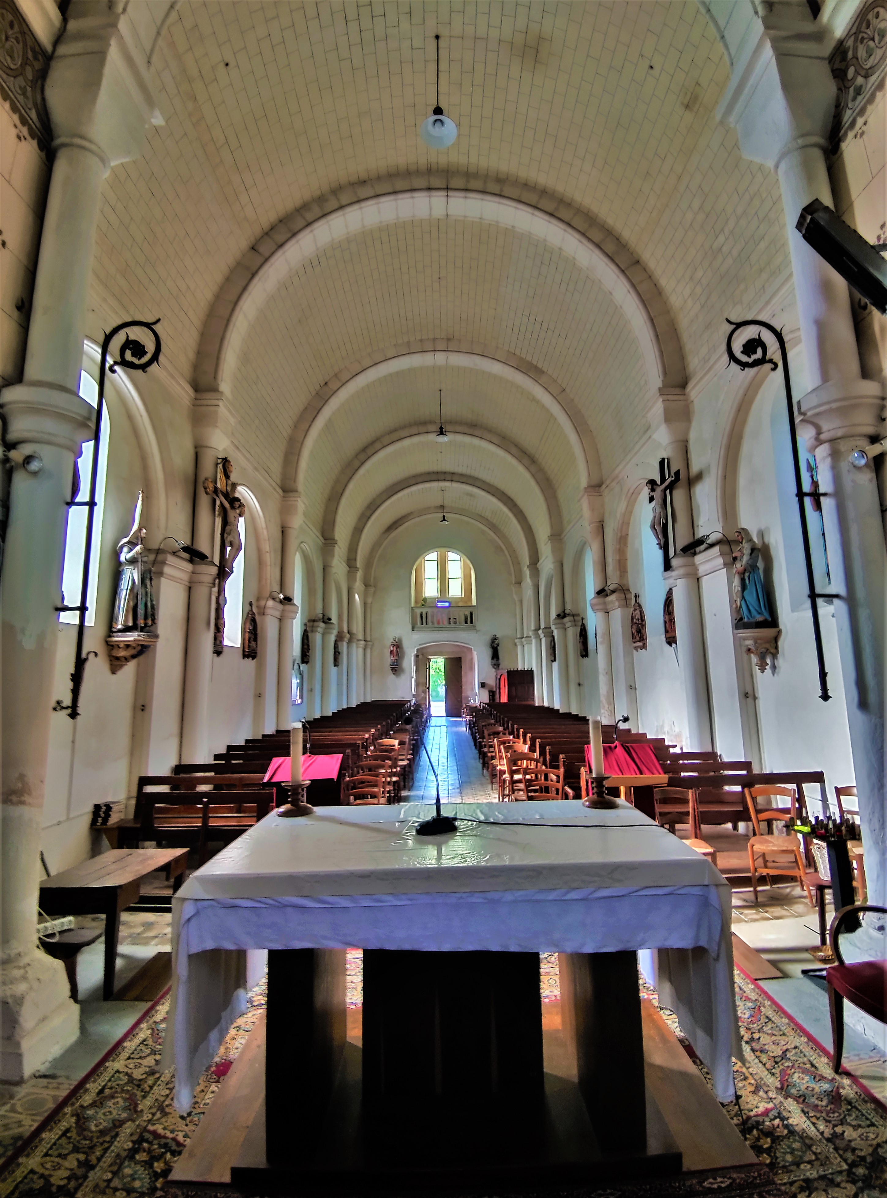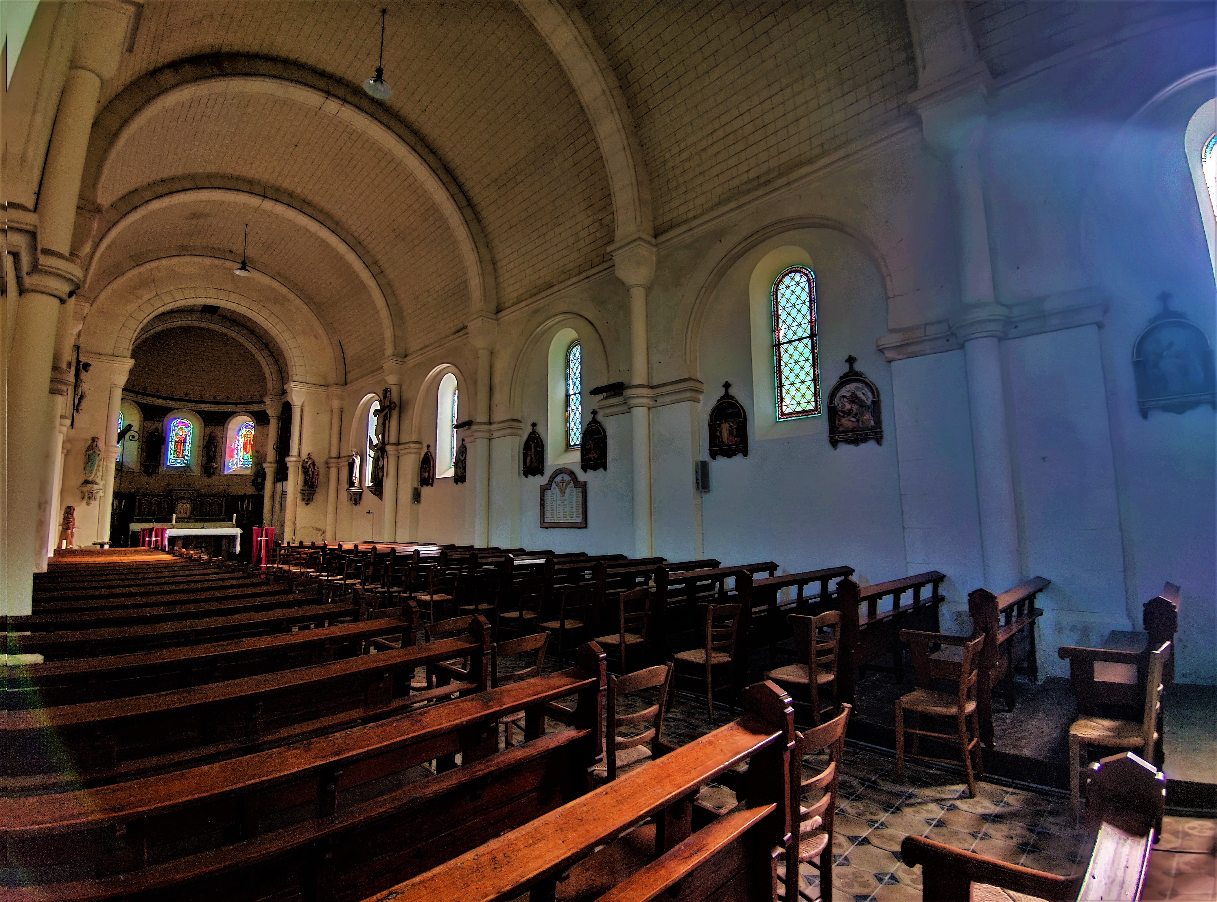 Ordinairement fermée, j'ai profité de l'intervention technique d'un employé municipal. Elle remplaça, fin 19ème, l'église romane de la commune La Boissière, lorsque le hameau Lageon, qui s'était beaucoup développé, devint chef-lieu de commune et que cette dernière changea de nom. L'ancienne église romane Saint-Benoît de la Boissière est aujourd'hui privée et utilisée comme bâtiment agricole. Inscrite par les Monuments Historiques depuis 2001, elle bénéficiera peut-être d'une mise en valeur. L'église Saint-Benoît de Lageon, joliment installée sur un petit espace arboré, est un bel exemple d'église rurale, une Sainte-Vierge-des-Champs trône à gauche du portail. La nef à 5 travées et arc doubleaux prolonge la travée sous clocher. Des arcatures entourent les baies en plein cintre et leurs vitraux non historiés. La travée du chœur est un peu plus étroite, l'abside est hémisphérique. Cette église, voûtée en berceau, simple et bien tenue, est accueillante, voire chaleureuse. Les vitraux historiés du sanctuaire, des peintures, de nombreuses statues de diverses époques agrémentent la visite. Voilà un endroit calme, idéal pour s'isoler, se détendre et méditer.