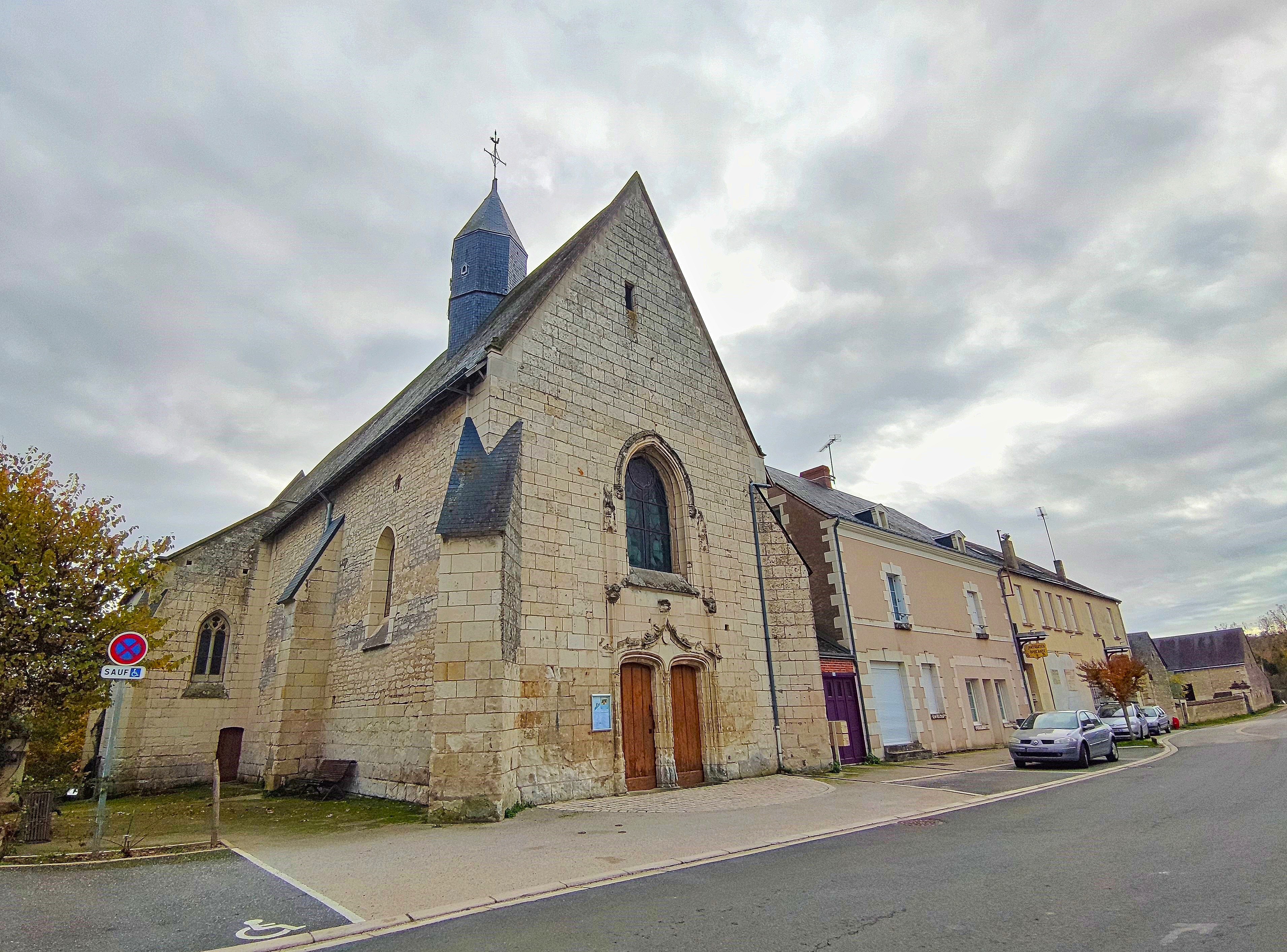 Église orientée construite au bords de la Vienne, le chevet surplombe la haute rive de la rivière. Cette église du 15è, agrandie au 16è de 2 chapelles faisant transept a succédé à une église du 11è. Cette dernière fut bâtie par la famille De La Jaille, branche de Marcilly, du château de La Motte. Le petit clocher en charpente et ces 2 cloches sont du 20è, un système automatique des sonneries a été installé en 2009 ; ces cloches ont remplacé une cloche du 15è qui était fêlée. Cette église était fermée lors de mon passage, la mairie à proximité l'était aussi, c'était un mercredi, seul jour de fermeture. Je me suis contenté des extérieurs, j'essaierai de passer à nouveau, emprunter les clés à la mairie est le plus sûr moyen de pouvoir visiter l'intérieur.