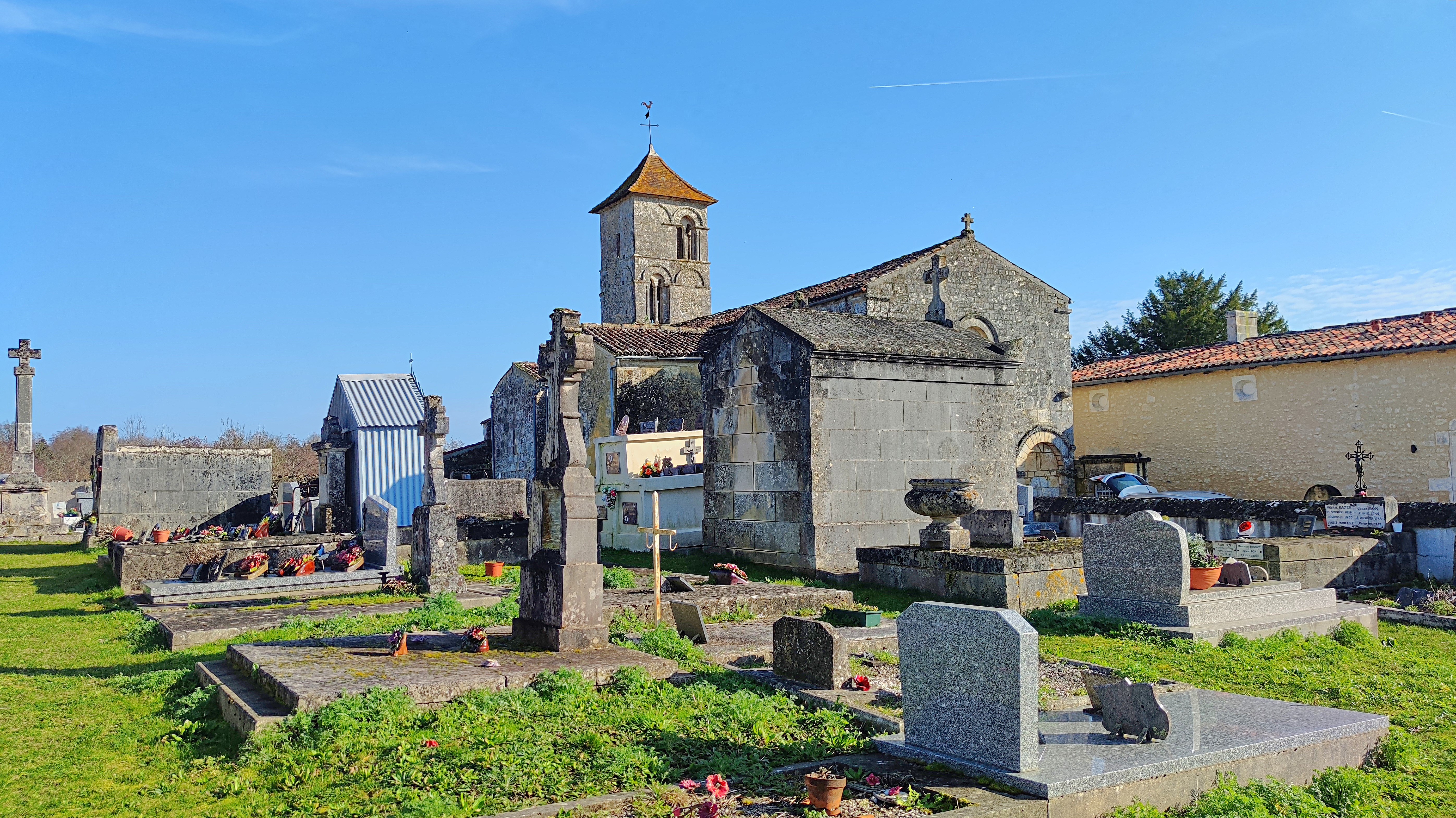 L église Saint-Brice est un monument aux origines anciennes qui bénéficie d'un site remarquable surplombant le village et la vallée. Son plan initial, qui devait être des plus simples avec une nef prolongée par une travée sous clocher plus étroite et sans doute une simple abside, a été modifié au cours des siècles. La façade, d'une grande sobriété, a été restaurée au XIXe siècle. La nef présente des murs en moellons témoignant d’une première construction du XIe siècle. Lorsqu’elle a été couverte d’une voûte en berceau au XIIe siècle, les murs ont été doublés à l’intérieur par des arcades qui ne s’ajustent pas exactement au rythme des fenêtres. Le parement extérieur a été, quant à lui, repris en pierre de taille et la nef rallongée d’une travée vers l’ouest. Deux chapelles quadrangulaires s’ouvrent au nord de la nef, la première est une adjonction de la période moderne et la seconde du Moyen-âge. Au sud, une troisième chapelle qui s’appuie contre le presbytère, fait pendant à la précédente pour former une sorte de faux transept. L’étranglement de la travée sous clocher appartient au premier édifice, puisqu’on y retrouve un dispositif archaïque, avec des murs en moellons percés de petites baies en plein cintre et une voûte en berceau destinée à renforcer la travée afin de recevoir le poids du clocher. L’ abside a été, quand à elle, remplacée au XIIe siècle par une travée droite et une nouvelle abside en pierre de taille, rythmée à l’extérieur par des colonnes-contreforts. Le clocher roman a subi d’importants remaniements puisque deux pans ont été reconstruits sans doute après les guerres de Religion comme à Berneuil. Il a toutefois conservé sur deux de ses faces d’élégantes baies géminées s’inscrivant sous de simples arcs en plein cintre. Dans la chapelle nord-est, une statue de Vierge à l’Enfant en bois polychrome du XVIIe siècle, provenant de l’abbaye de Fontdouce, fait l’objet d’une vénération particulière. Au sud, outre le presbytère du XVIIIe siècle, une adjonction du XVe siècle qui s’appuie contre la travée sous le clocher, complétait la chapelle encore accessible depuis la nef et sert désormais de remise.