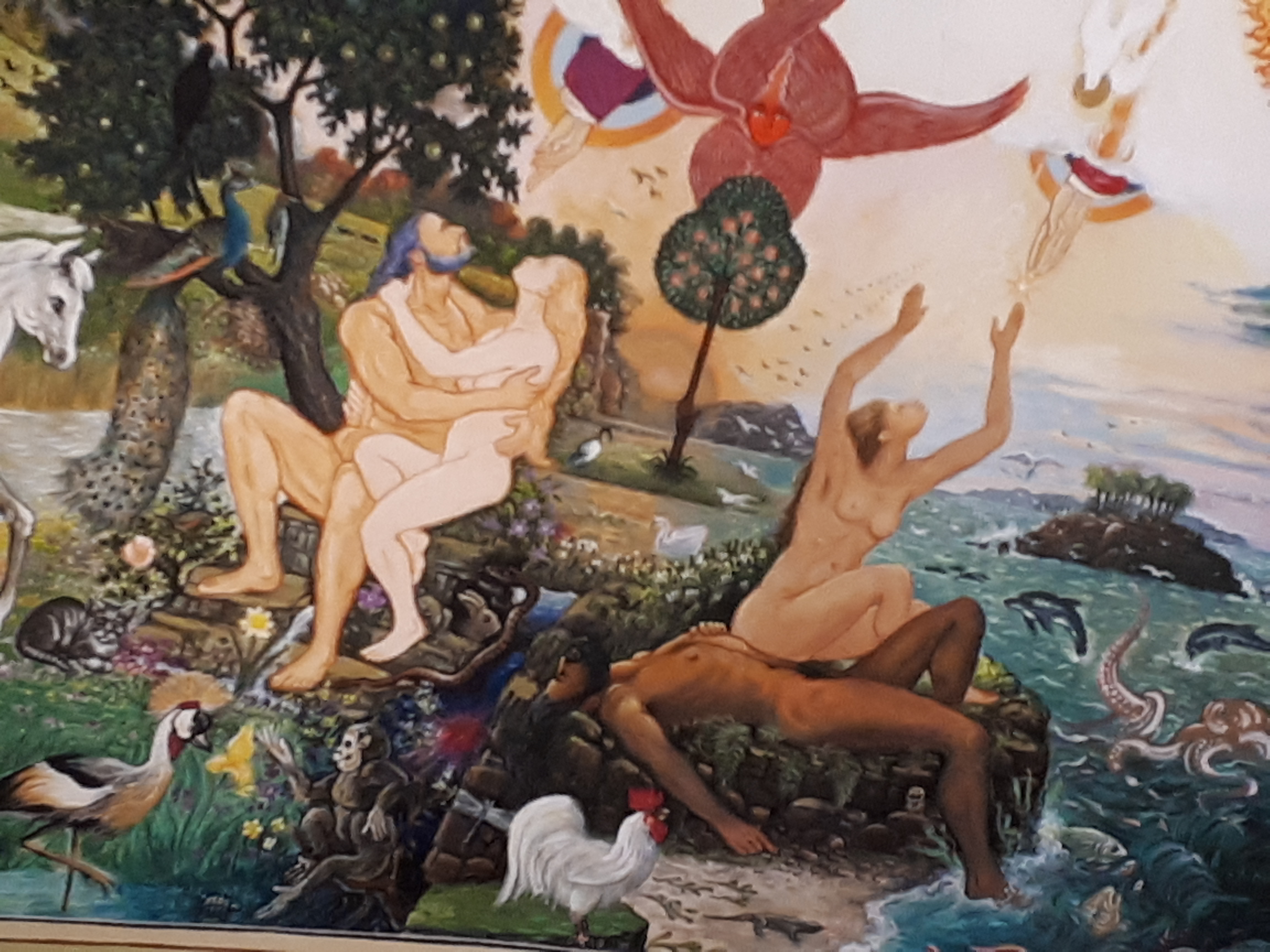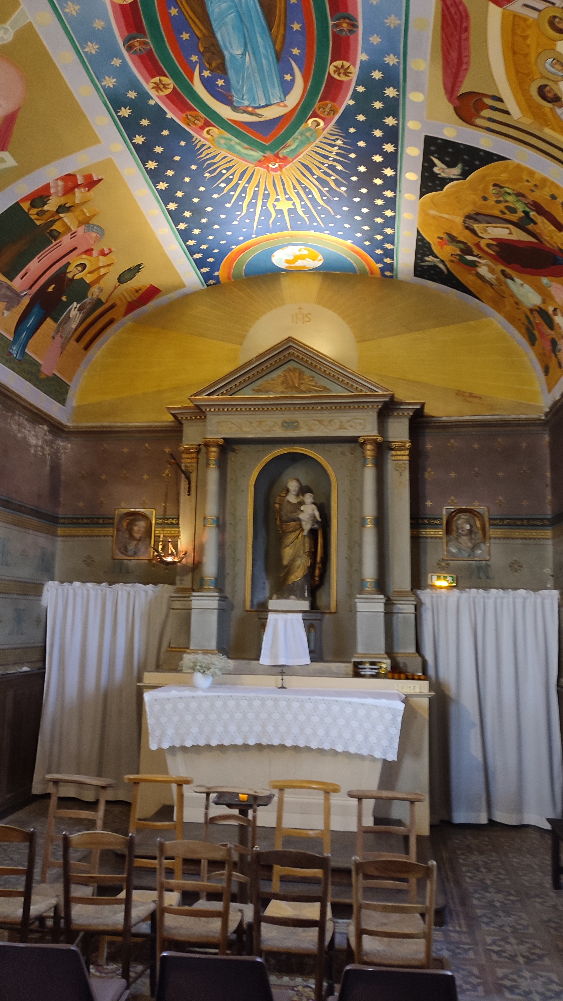 Après le Château, c'est en visitant le Village que nous avons découvert l'Eglise Saint Calais, construite dans les années 1730 par Jean-François de la Porte, alors seigneur de Meslé. Les peintures murales ont été réalisées par le peintre Vendomois Jean-Claude Ferron, de 1988 à 1996. Sur plus de 300 M2, elles intéressent l'abside (1988), la Chapelle de la Vierge (1990/1996) et s'inspirent de la tradition Byzantine. Stupéfiantes de beauté !