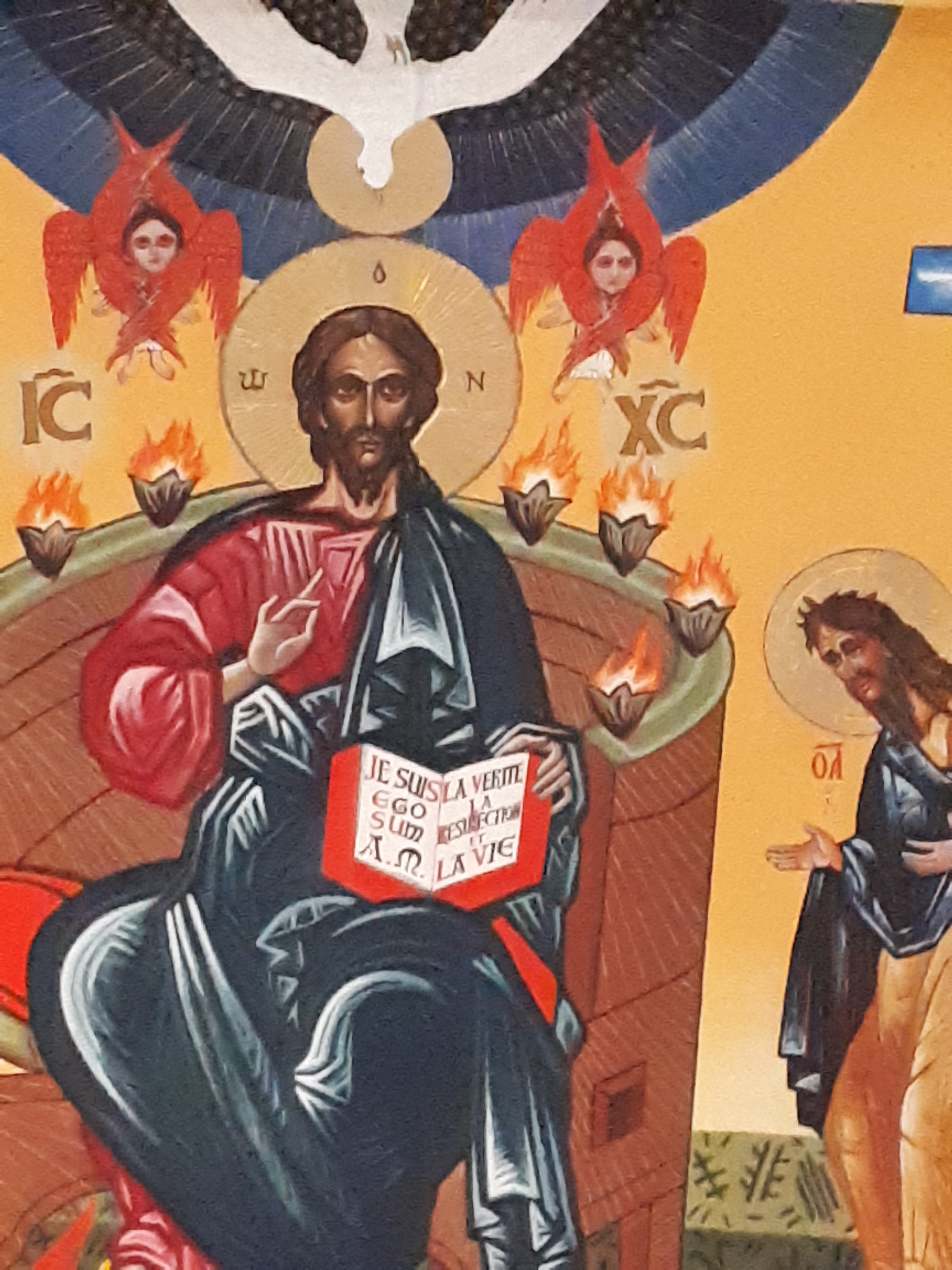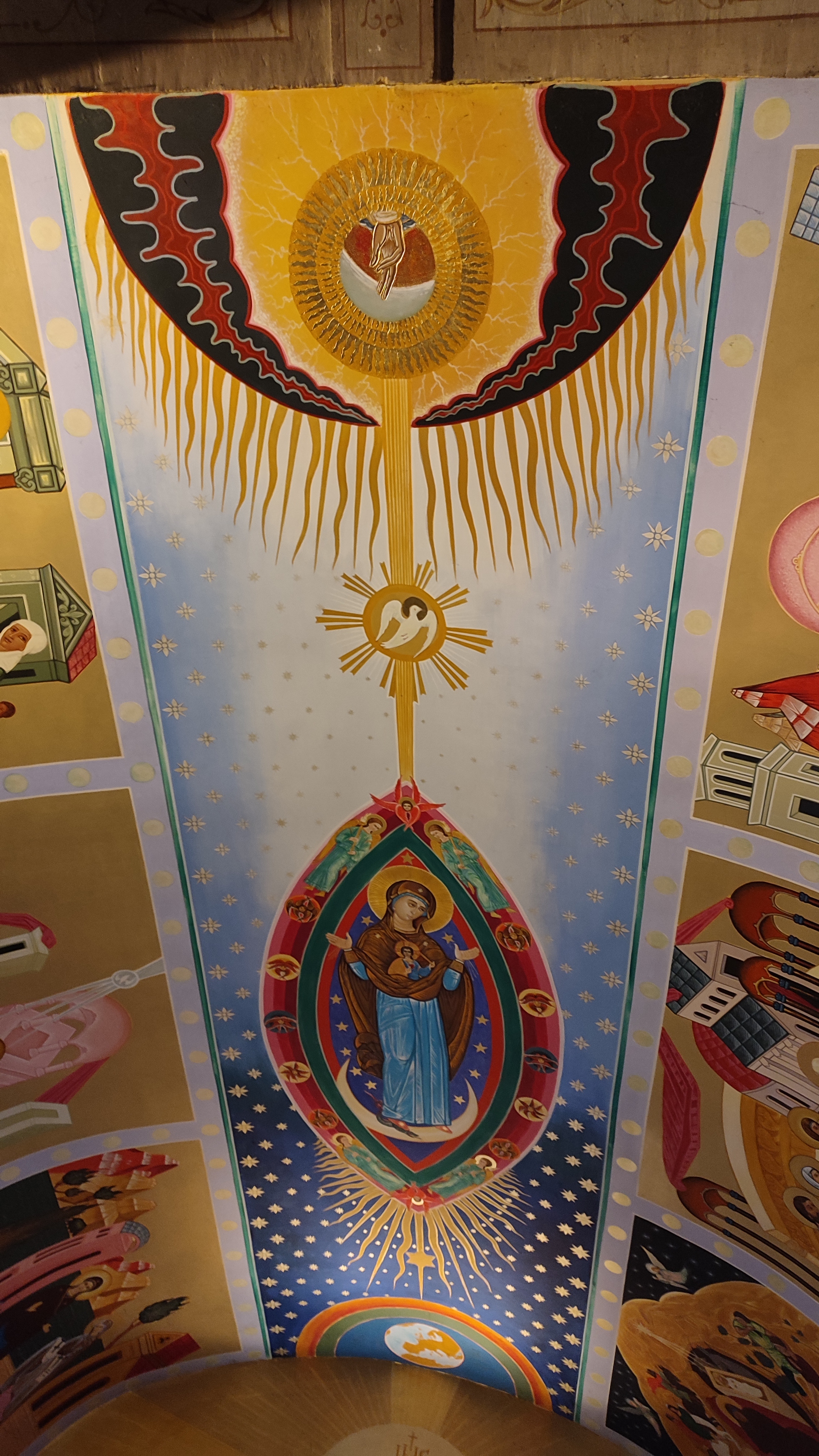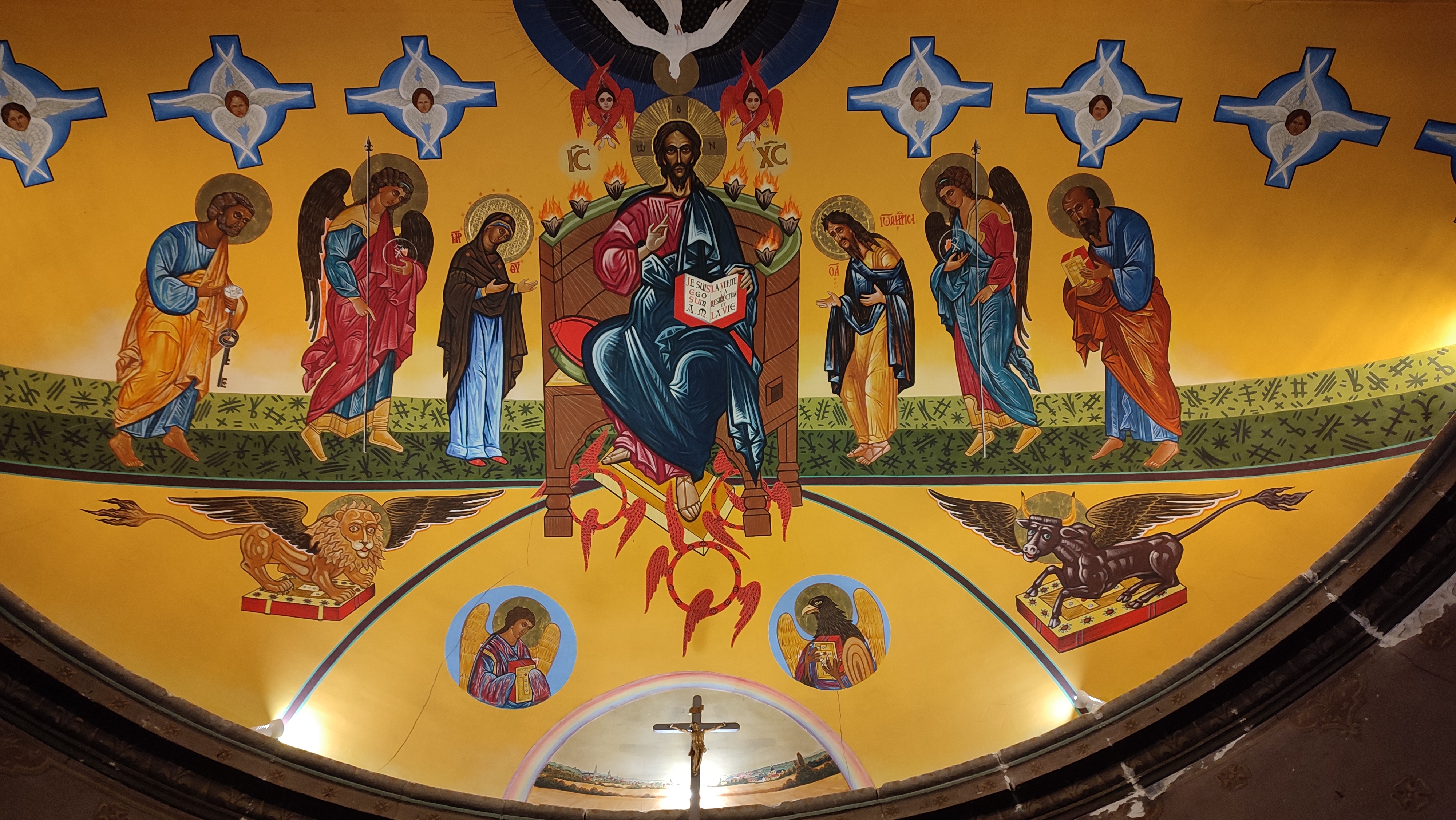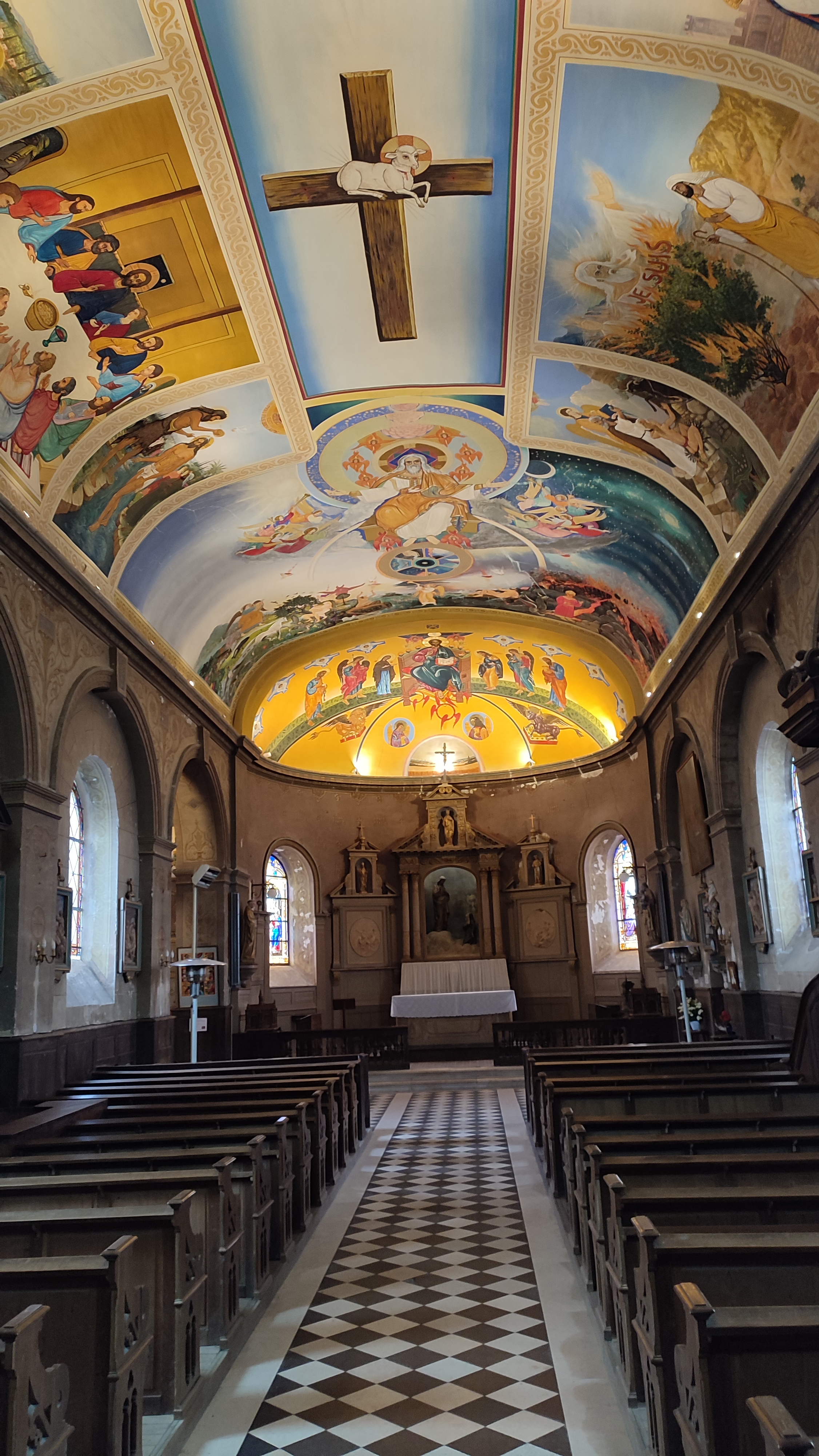 En soit l'église est petite et n'a pas de construction particulière. L'extérieur est sobre. La fresque, magnifique, la rend unique. Dès notre entrée, nous sommes subjugués par la beauté de ce plafond. Ces couleurs, cette vie qui est donnée à ce monument ! Bravo à l'artiste. Stationnement très facile à coté de l'entrée.