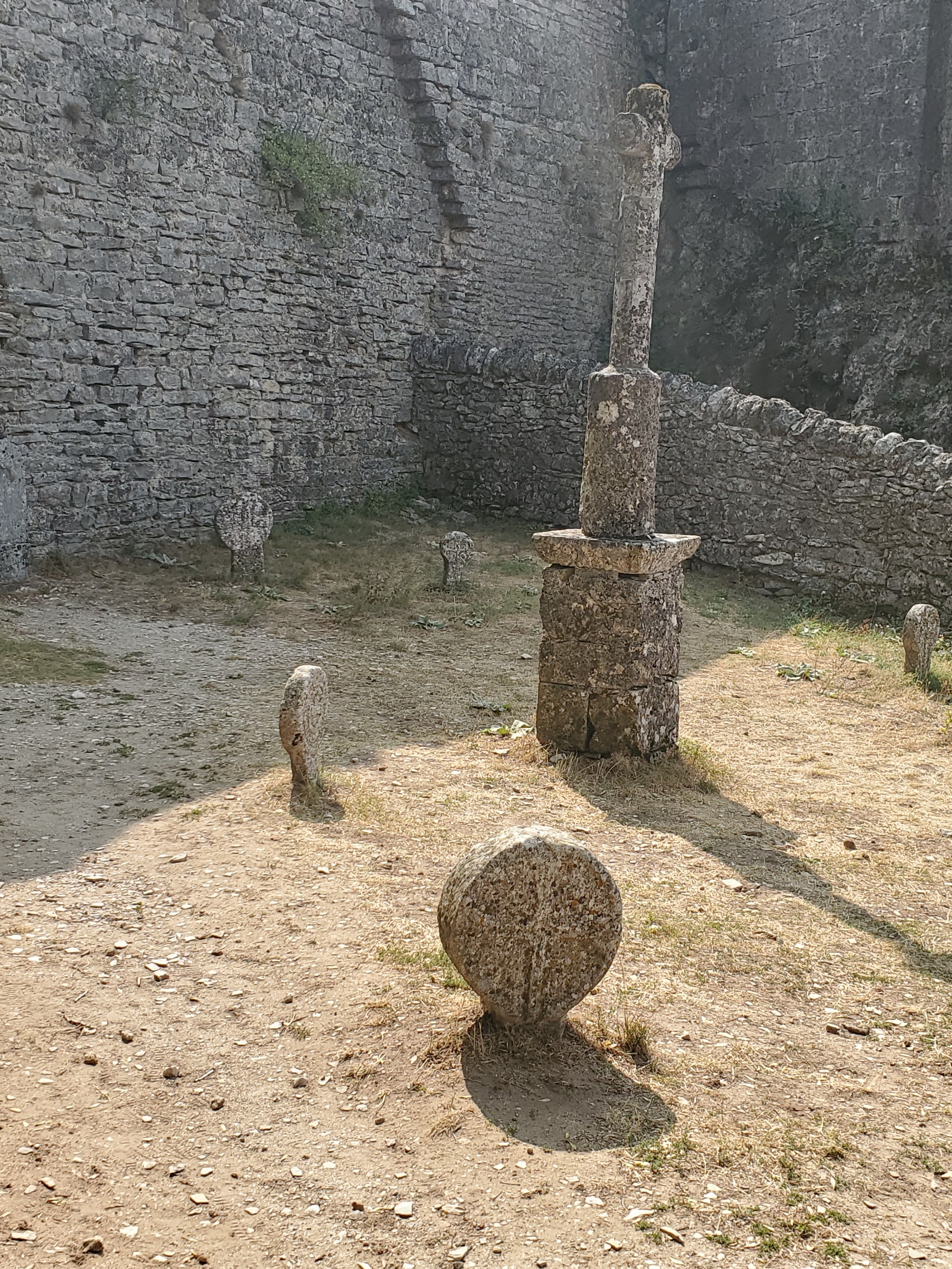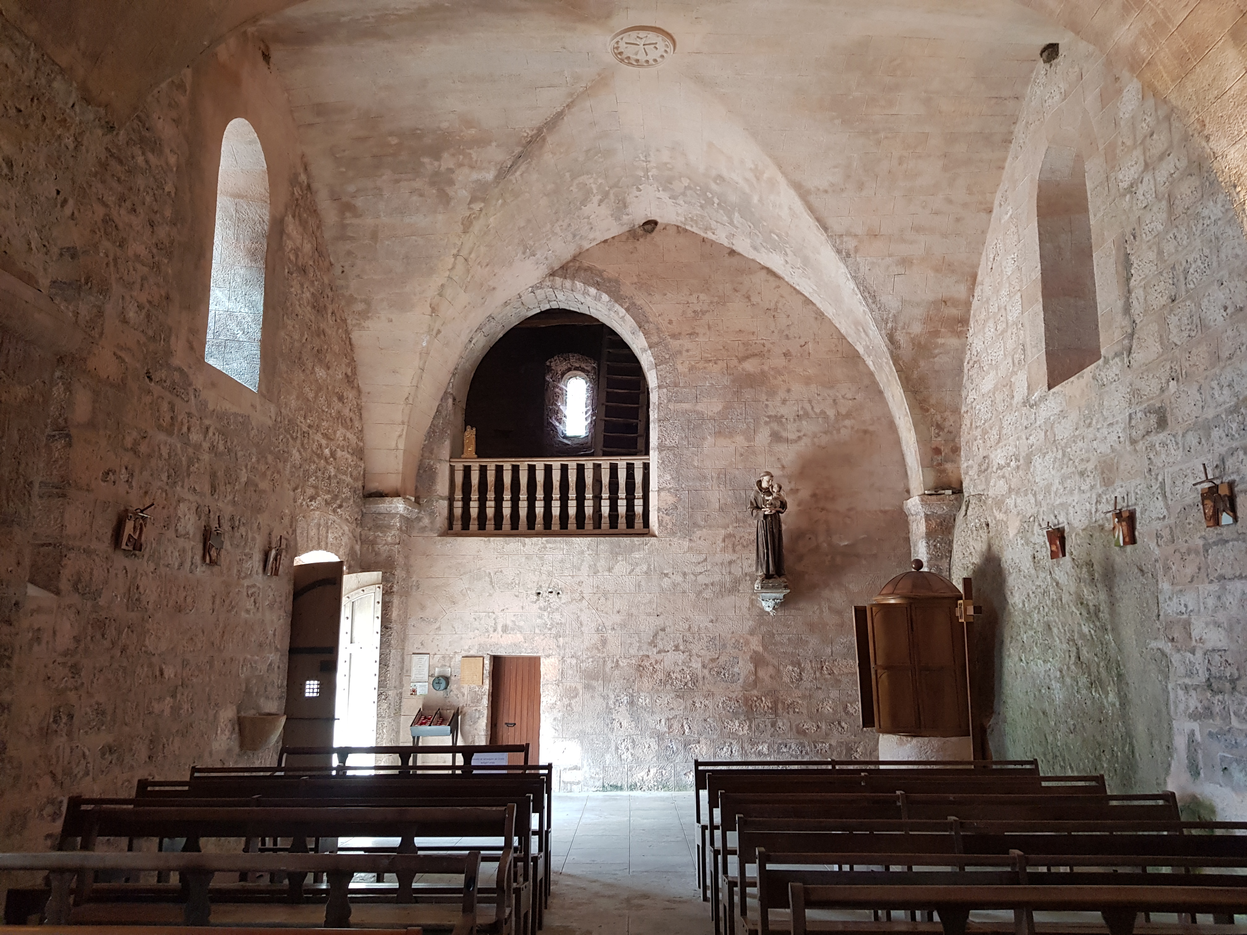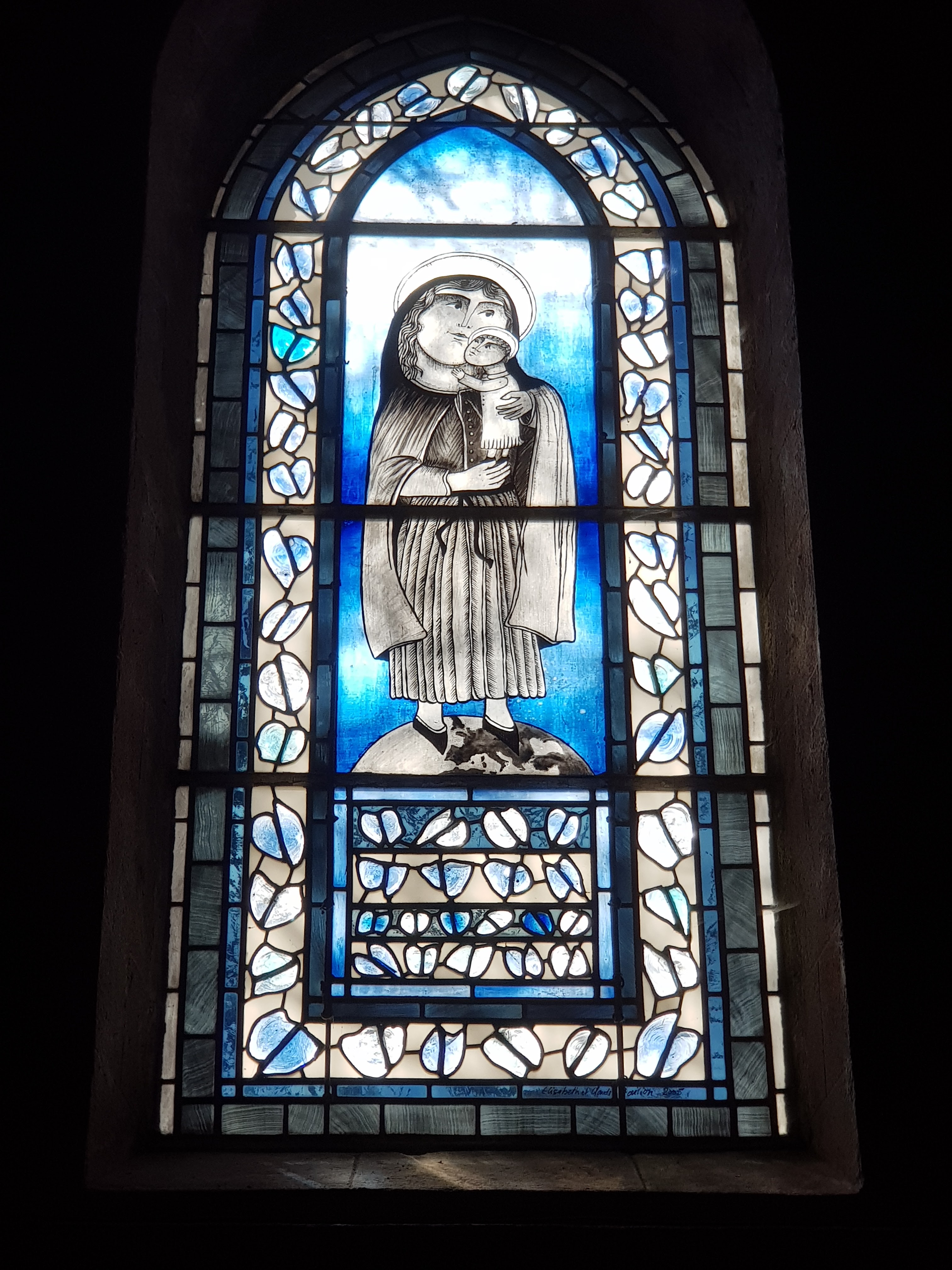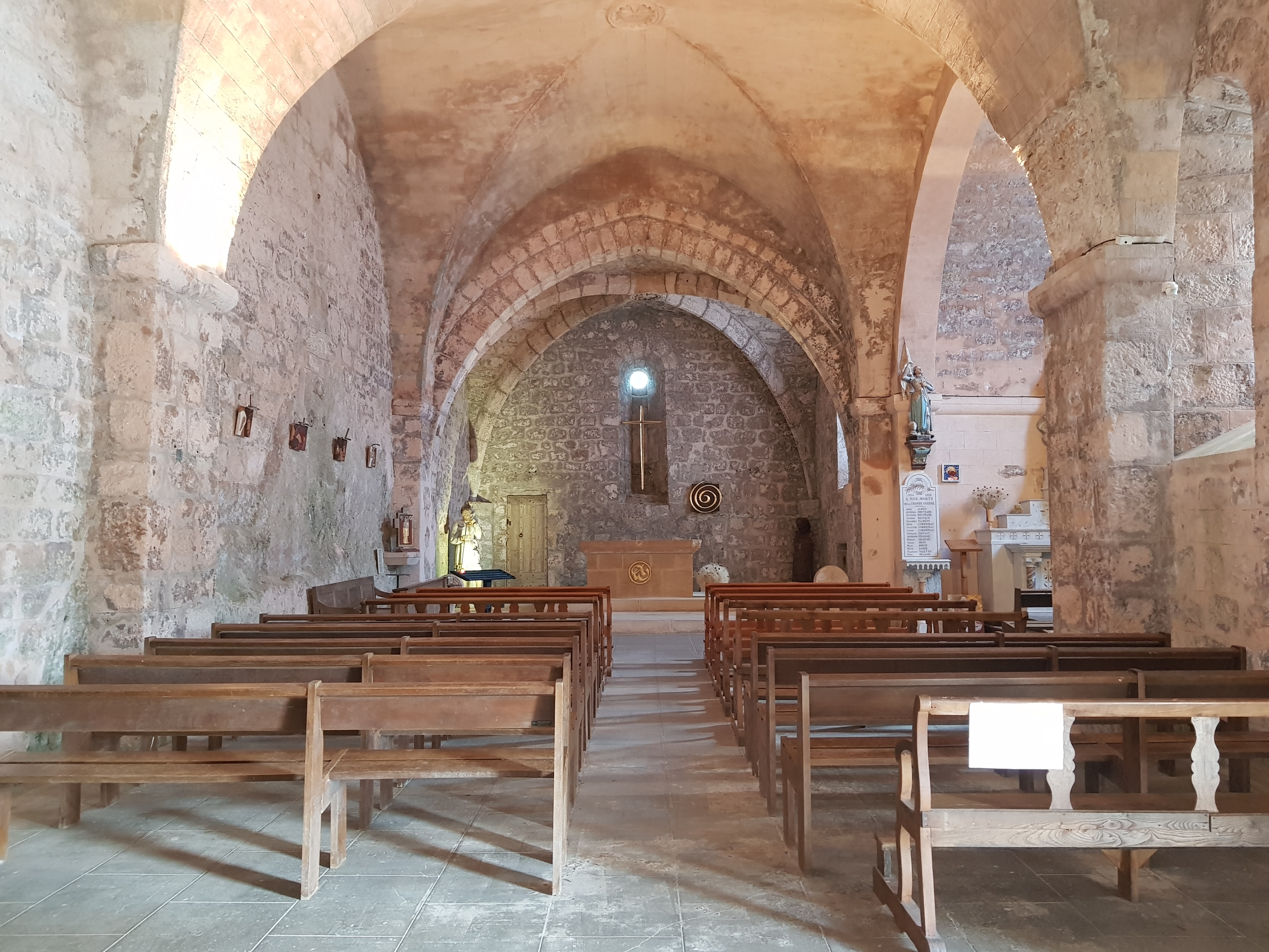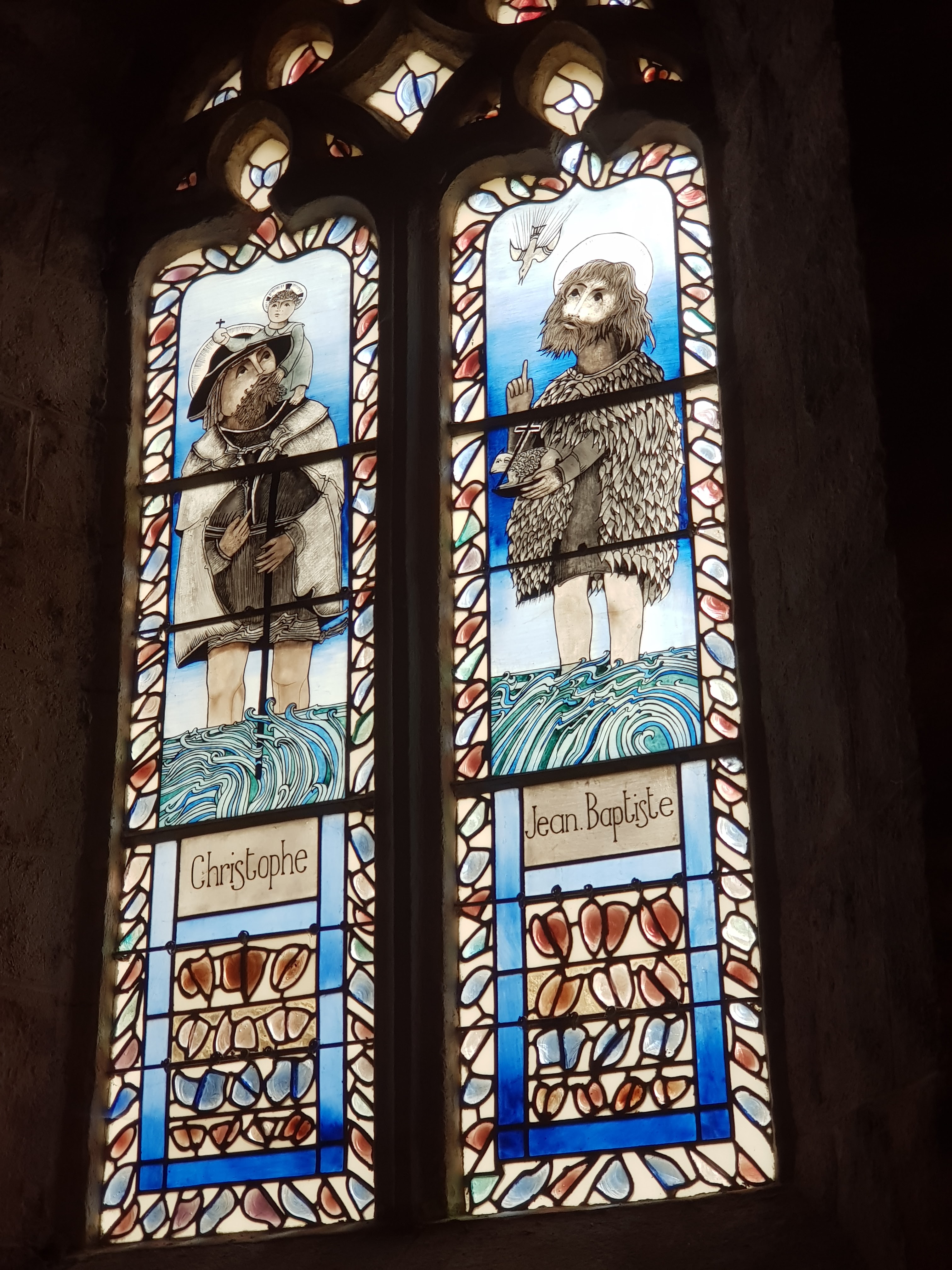 Une église très simple, remarquable par son emplacement, son insertion dans la petite cité fortifiée, mais aussi par ses vitraux et, à l'extérieur, par ses figures sculptées, qui ne sont pas d'origine, m'a-t-on dit, mais ont été prélevées sur l'ancienne église Saint-Christophe, aujourdhui abandonnée et sise, ruinée (mais en reconstruction), à l'extérieur du village, au-delà du petit monticule sur lequel est bâti le moulin.
