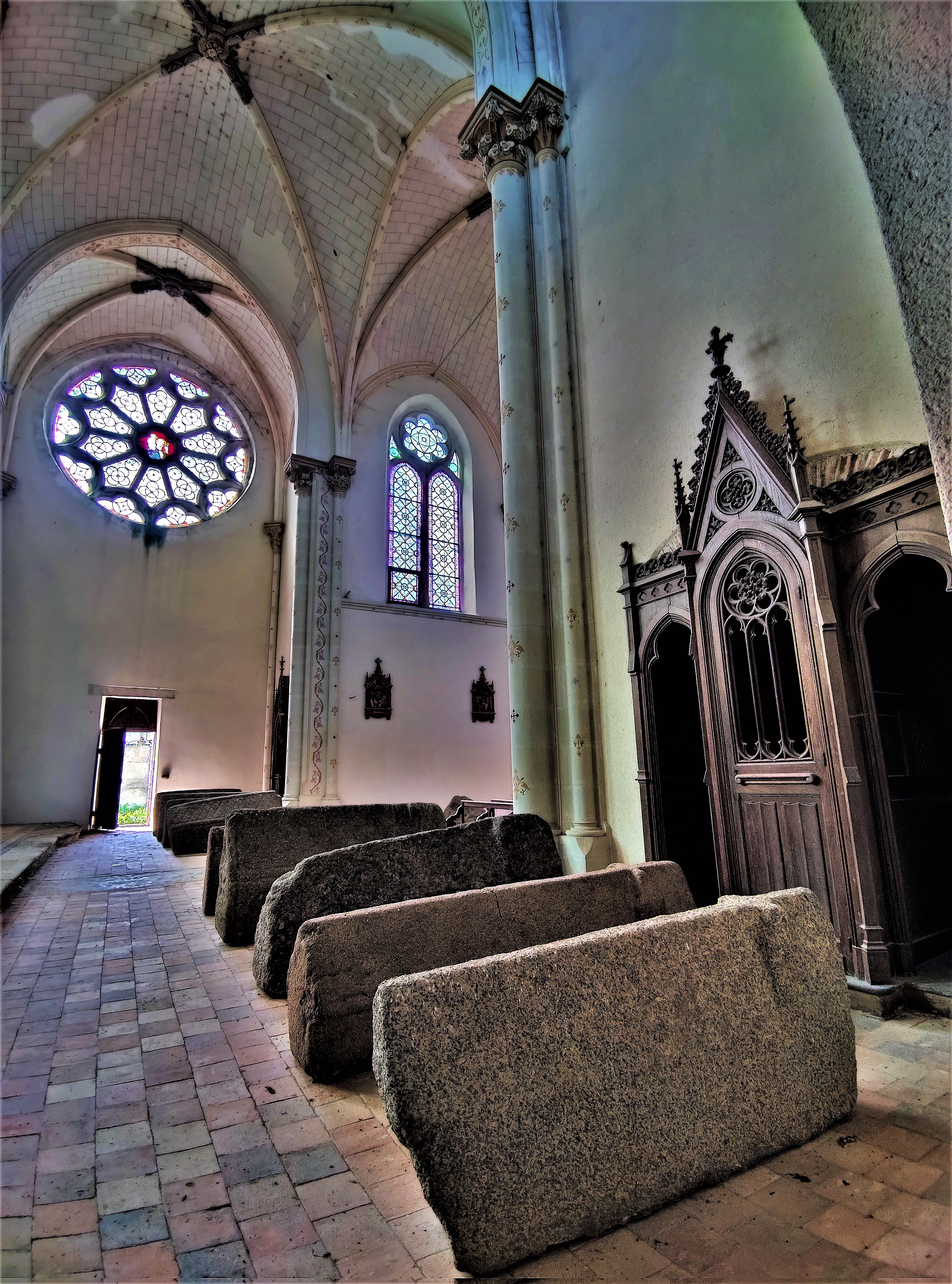Église du 19è non désacralisée mais abandonnée pour le culte, elle est aujourd'hui un musée lapidaire. Pour y entrer, il faut suivre les consignes affichées, je remercie la dame qui est venue m'ouvrir pour sa disponibilité, sa gentillesse et sa présentation émouvante de l'édifice. Église de la paroisse de la Blouère qui était distincte de celle de Villedieu, elle fut construite pour remplacer une église du 12è en un siècle très catholique. Aujourd'hui, les pierres tombales (13è et 14è) des Chevaliers de Malte ont quitté le cimetière pour être préservées dans cette église. C'est l'occasion de s'intéresser à cet ordre (Chevaliers de Saint-Jean, Hospitaliers ou de Malte) dont un musée est situé au Château de La Roche, à Magné, dans la Vienne. La mise en valeur de ses pierres m'a semblé absente, quant à l'église, on y respire un peu le parfum de l'abandon. Elle est une des 13 églises de la nouvelle commune de Beaupréau-en-Mauges, issue de multiples fusions. Les coûts d'entretien d'un pareil patrimoine bâti sont importants, réfléchir au moyen de pérenniser ces monuments est à l'ordre du jour dans la commune ; musées, bibliothèque, centre culturel, tout en préservant l'architecture et l'âme de ces lieux de culte. Héritage de nos anciens bâtisseurs, ces églises étaient aussi lieux de débats et de décisions, agoras autour desquelles se sont constitués les cités et les communautés villageoises.