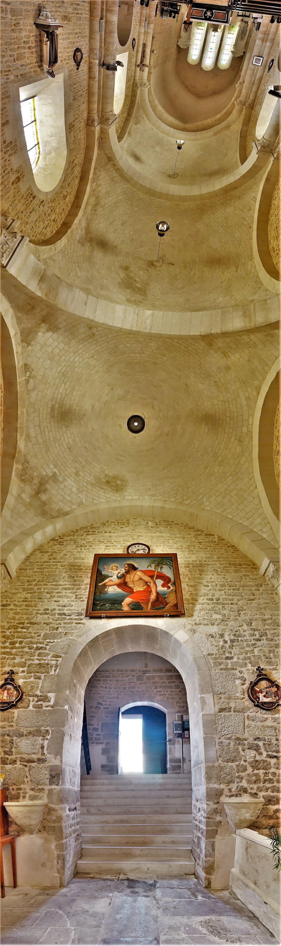 Cette église est bien mise en valeur. D'un côté une vaste place, un monument aux morts et une croix hosanniere de 9 m de haut, classée M.H. en 1889. De l'autre, la pente sur laquelle l'église est construite, descend vers la vallée, une fontaine et le ruisseau de la roche. Cette église construite au 13ème siècle a gardé le chœur et le chevet plat de l'église primitive. L'édifice a été mis à rude épreuve au cours des siècles. Les guerres de religions l'ont laissé très abîmée, Saint-Christophe-sur-Roc fut un village majoritairement peuplé de protestants. La révocation de l'édit de Nantes en 1685 provoqua l'abjuration d'un millier d'entre eux pour éviter les dragonnades. Restaurée au 17ème siècle, elle passe la révolution, la voûte de la nef doit être refaite. Elle est reconstruite en briques au milieu du 19ème et s'effondre 24 ans plus tard. Elle est alors refaite en série de coupoles, ce qui apporte une réelle élégance à l'intérieur de l'édifice. La travée du chœur reste voûtée en berceau. En bel état aujourd'hui, c'est une église accueillante. L'allure massive de l'édifice, particulièrement la sorte de clocher-porche par lequel on entre, ne présage pas du charme et du raffinement intérieur. On y découvre aussi l'histoire et les légendes de Saint-Christophe.