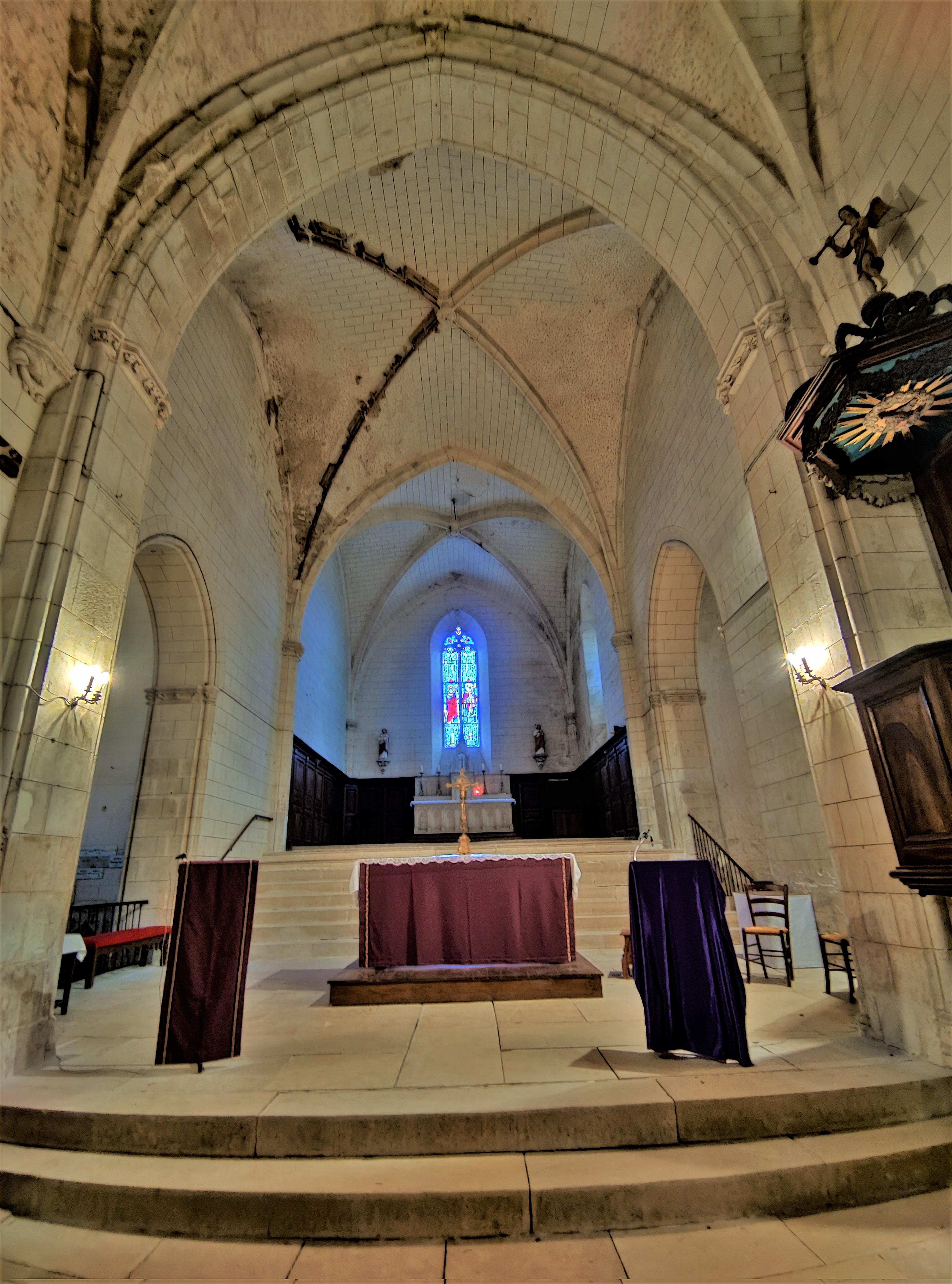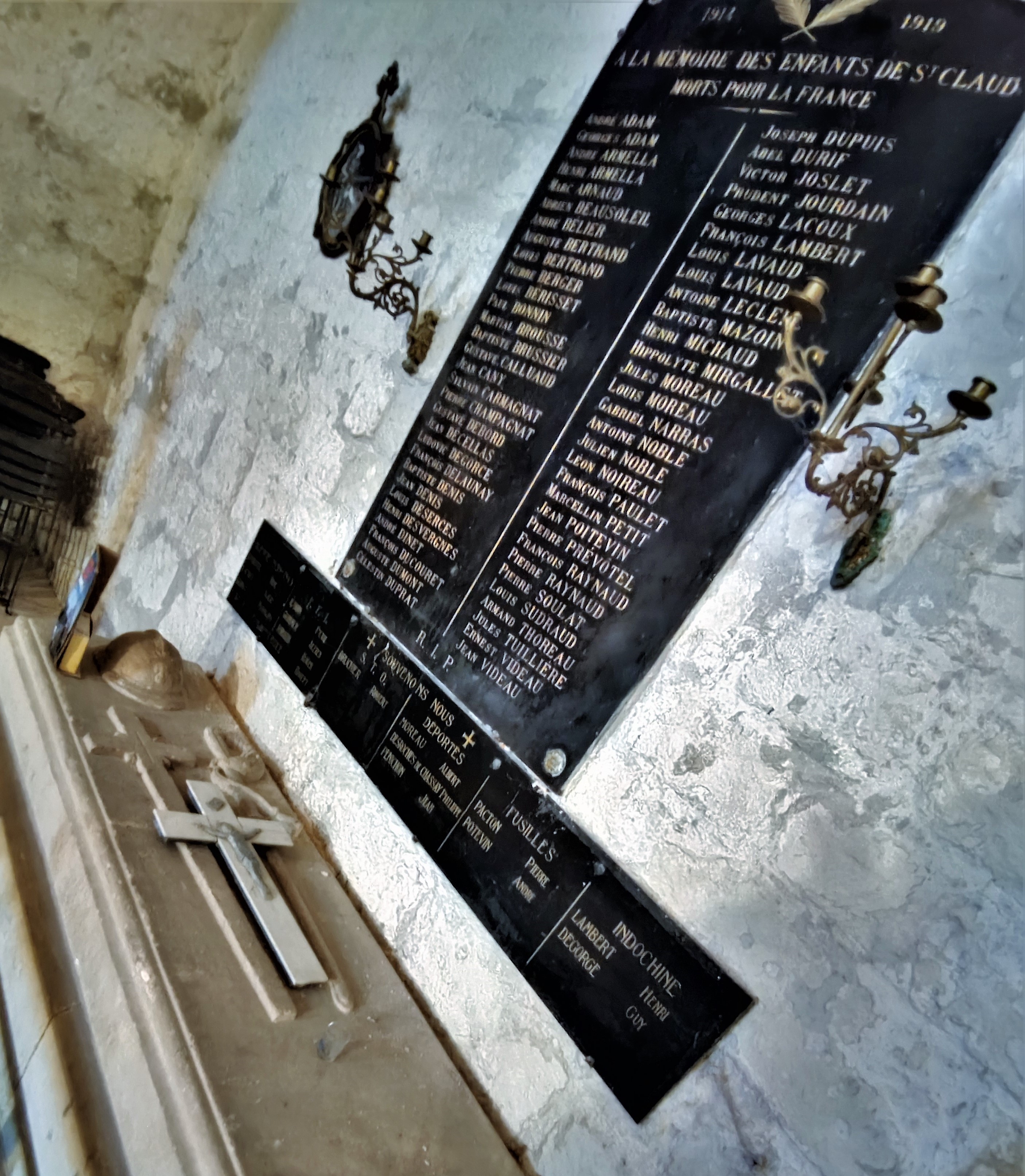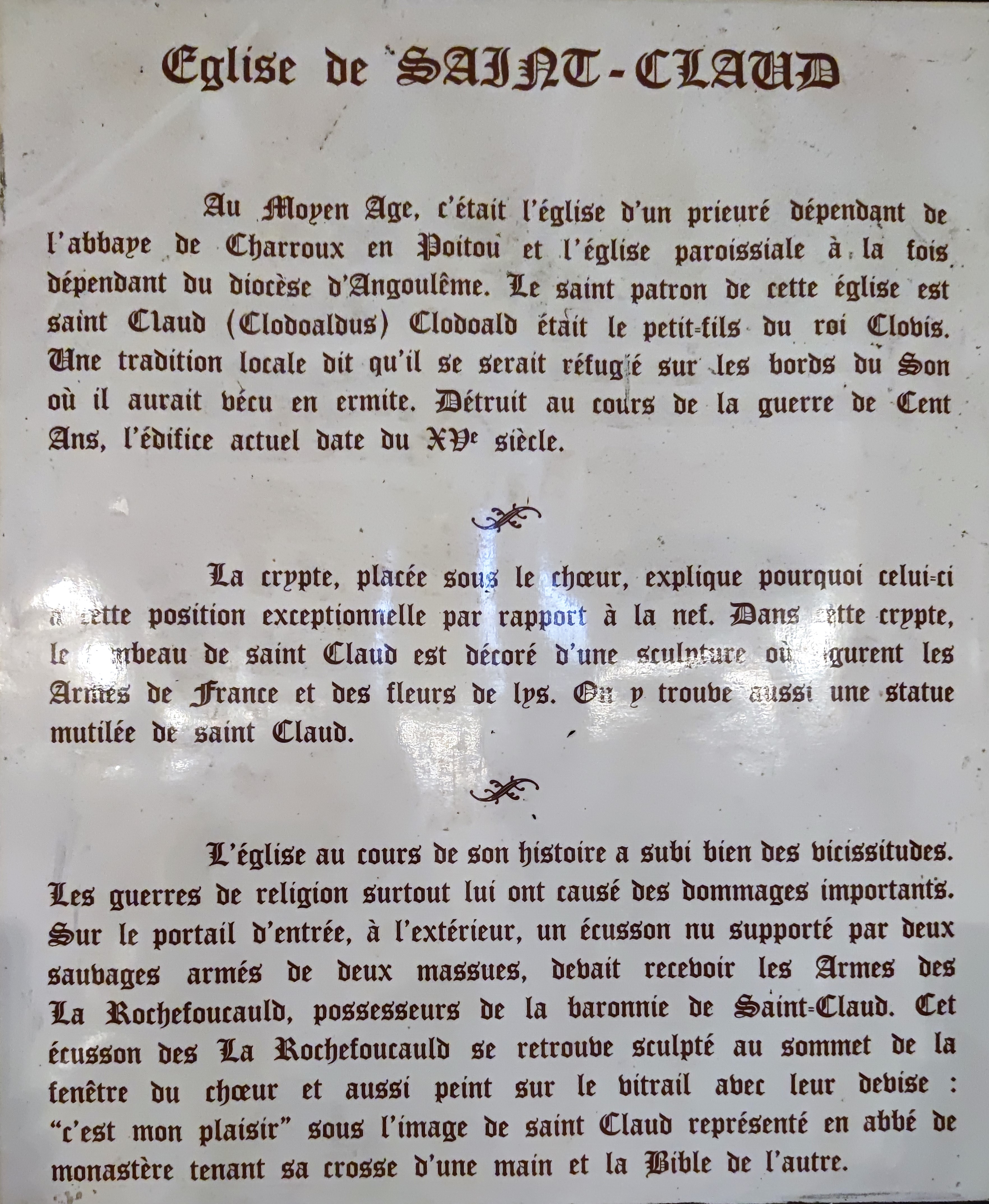Cette église du 14ème et 15ème siècles remplaça une église du 11ème siècle, détruite pendant les conflits féodaux des guerres de cent ans. Une crypte est logée sous le chœur, ses décors sculptés ont été mutilés et la statue de Saint-Claud décapitée pendant les guerres de religions. Église paroissiale et prieurale, elle est vaste pour la taille du village. Sur l'identité de Saint-Claud, protecteur de l'église et du village, il existe une incertitude. Au 7ème siècle, il existait déjà un lieu de culte dans lequel aurait été enterré le patron de l'église, Clodoald, un ermite local du 7ème siècle. Mais une légende désignerait comme titulaire Clodoald, petit fils de Clovis, qui vécut au 6ème siècle. Ayant refusé le trône après l'assassinat de ses deux frères par ses oncles, il devint ermite et aurait vécu ici. Histoire propagée par les moines, les historiens ne l'accréditent pas. Restaurée à plusieurs reprises, cette église a bénéficié d'un chantier de 2017 à 2021, elle est aujourd'hui en bel état. J'ai dû m'adresser à la mairie pour y entrer, elle est située en face de l'église. Une église gothique à découvrir sans oublier sa crypte accessible par 2 escaliers.