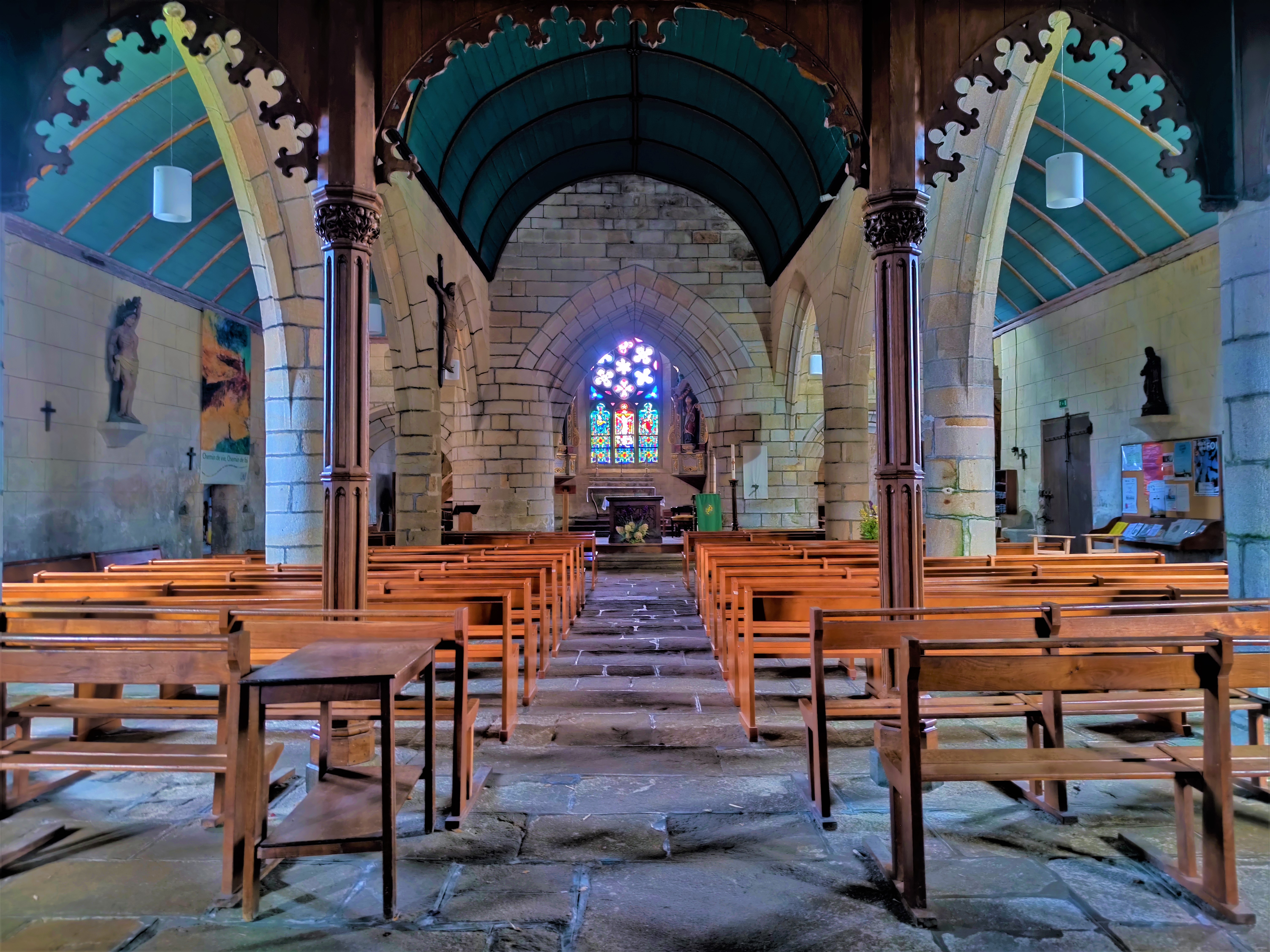 Cette église a remplacé une église du 13ème dont il reste des influences romanes dans le chœur. Une nef à 3 vaisseaux de style gothique flamboyant du 15ème et 16ème. Les arcs qui bordent le vaisseau central s'élèvent jusqu'à la voûte en bois et s'appuient sur de minces piliers, créant un vaste espace sans gêne visuelle. 2 baies à vitraux non historiés assurent l'éclairage Le changement de style est radical dès que l'on aborde le chœur. De massifs piliers soutiennent l'arc triomphal ogival qui porte le clocher. Le chœur possède 3 vaisseaux qui communiquent par des arcs en plein cintre ; il loge le sanctuaire contre un chevet plat.