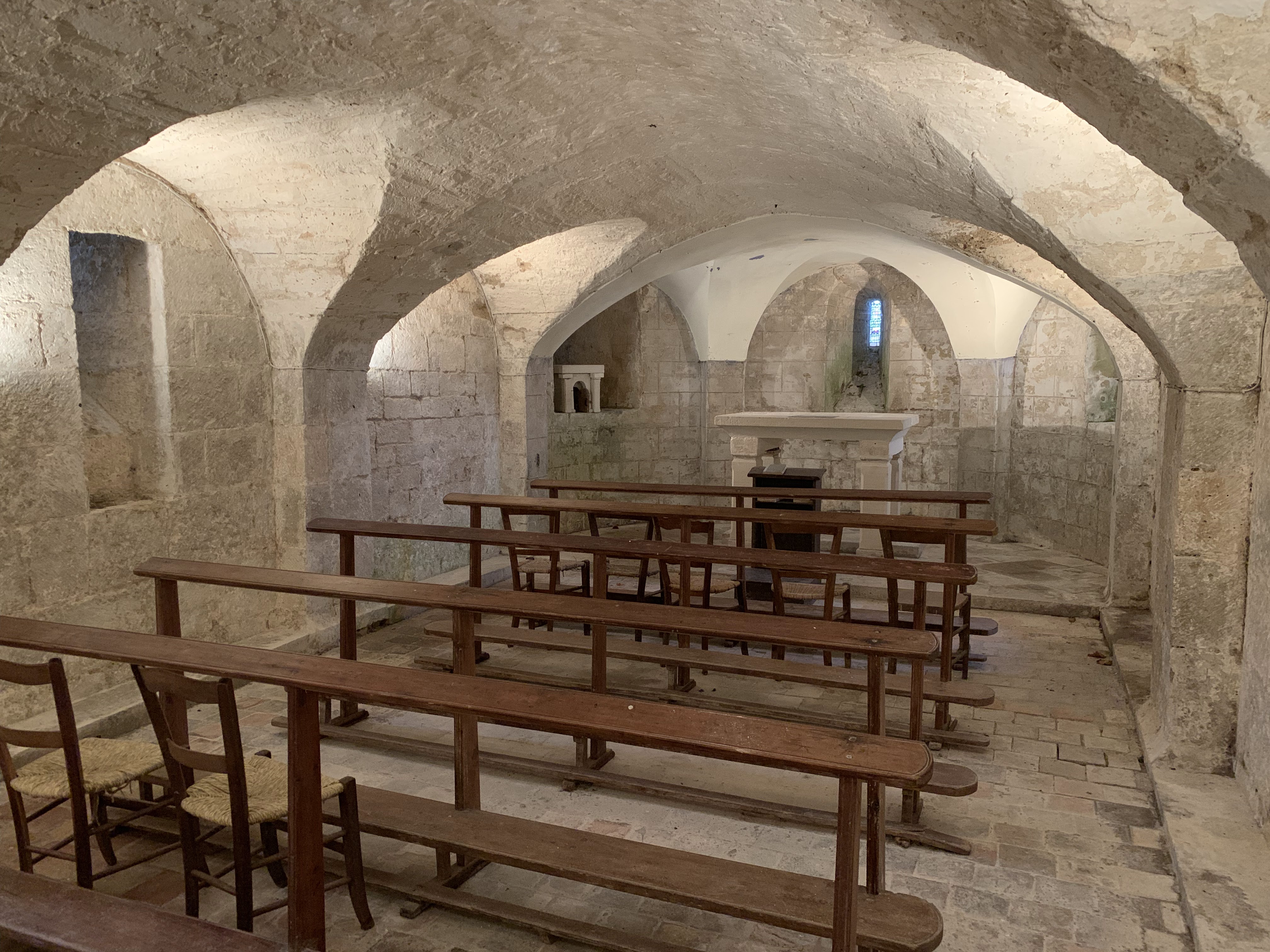“Une église et sa crypte du 12ème telle qu'elle fut construite” Une église et sa crypte, trésors du 12ème siècle, jamais remaniées, en bel état, classées en 1862, ou l'on peut admirer de jolis décors sculptés ; un plaisir authentique à ne pas bouder. La crypte est éclairée par trois petits vitraux et présente donc une allure d'église souterraine, à laquelle on accède par deux escaliers situés dans la nef.