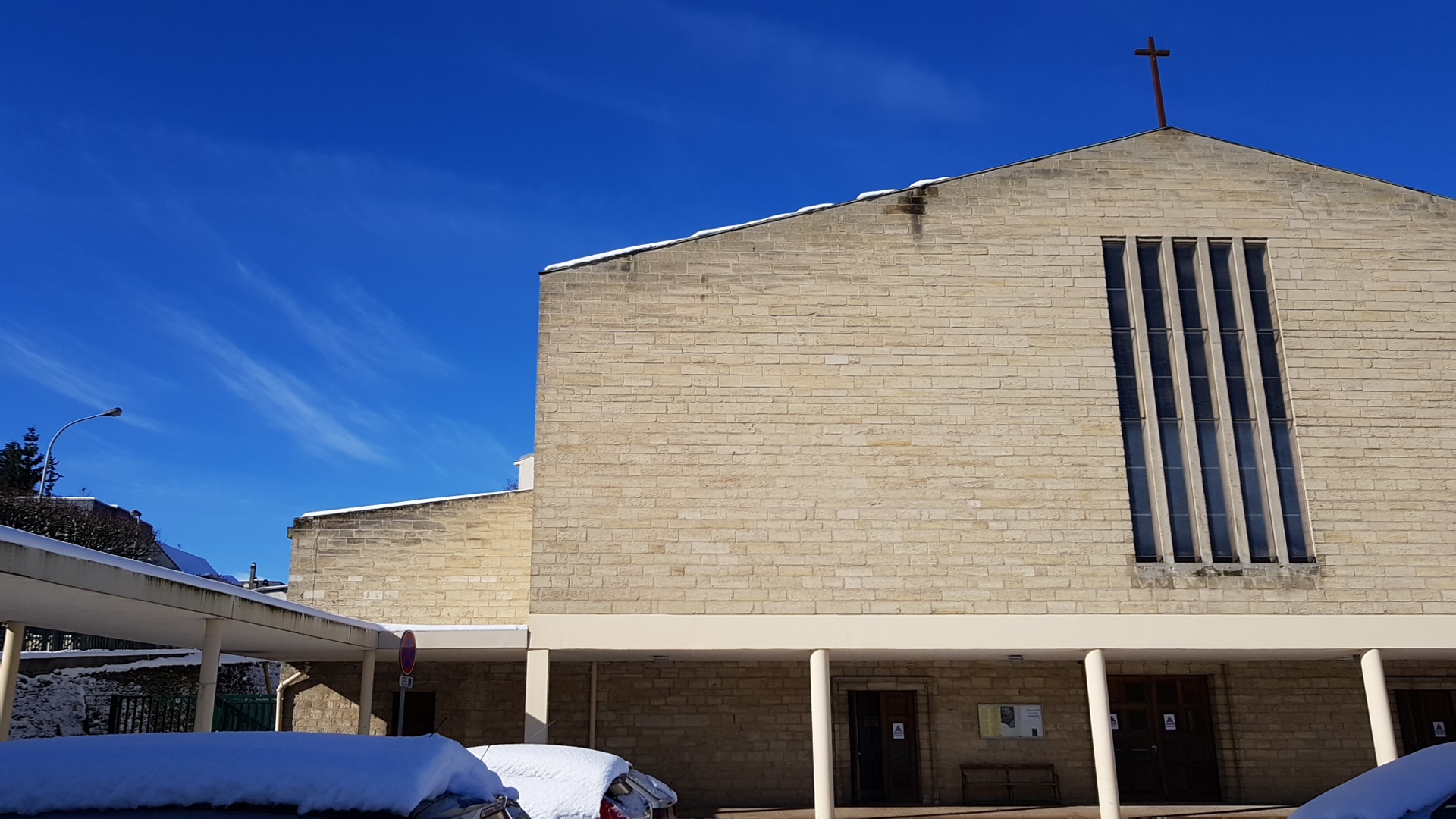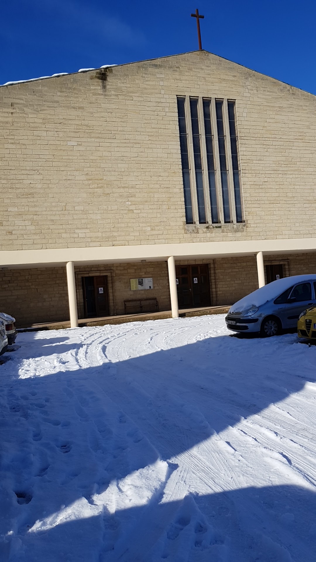 Eglise moderne avec petit parking qui est malheureusement utilisé par les résidents des alentours donc les places sont chères. L acoustique est plutôt bonne si les prêtres parlent avec leurs micros bien en face.