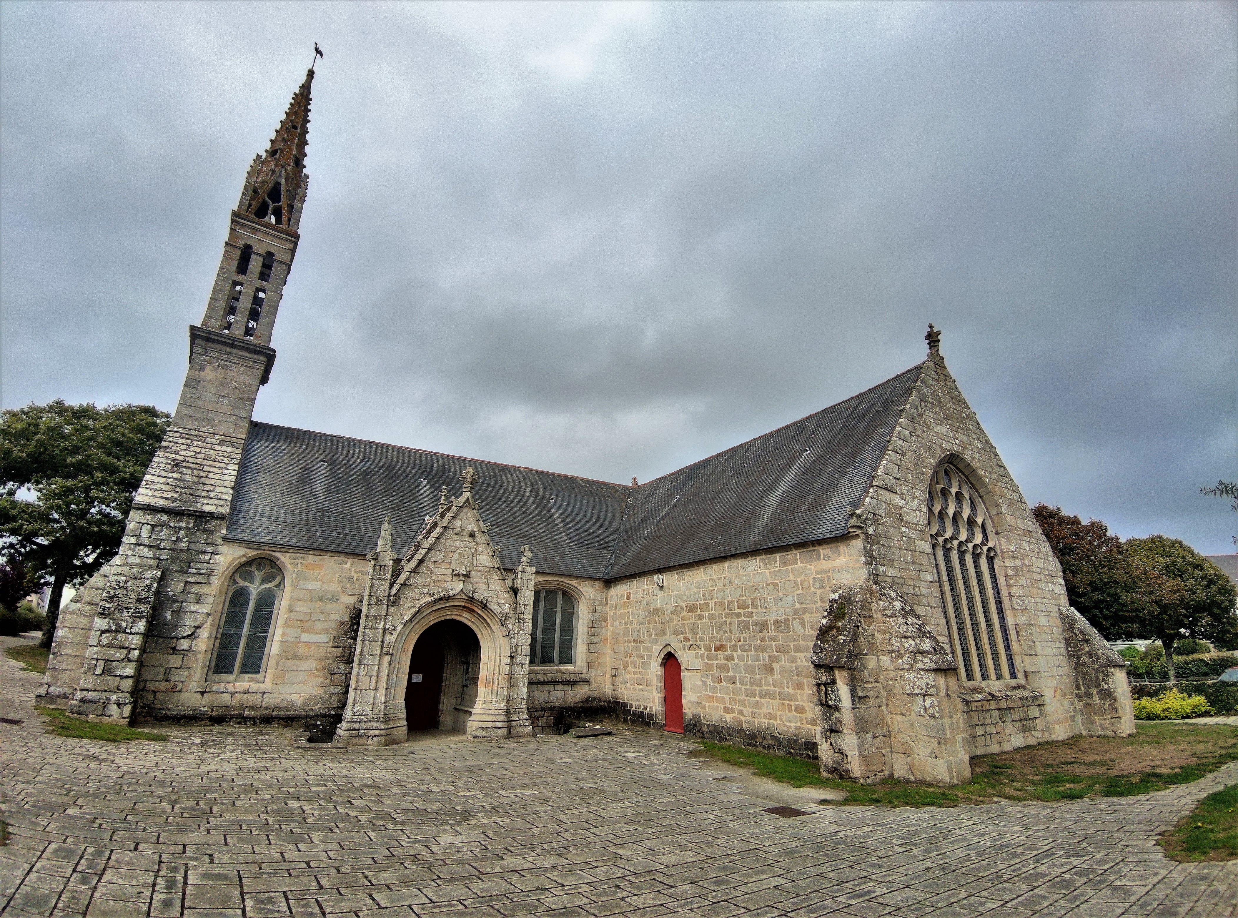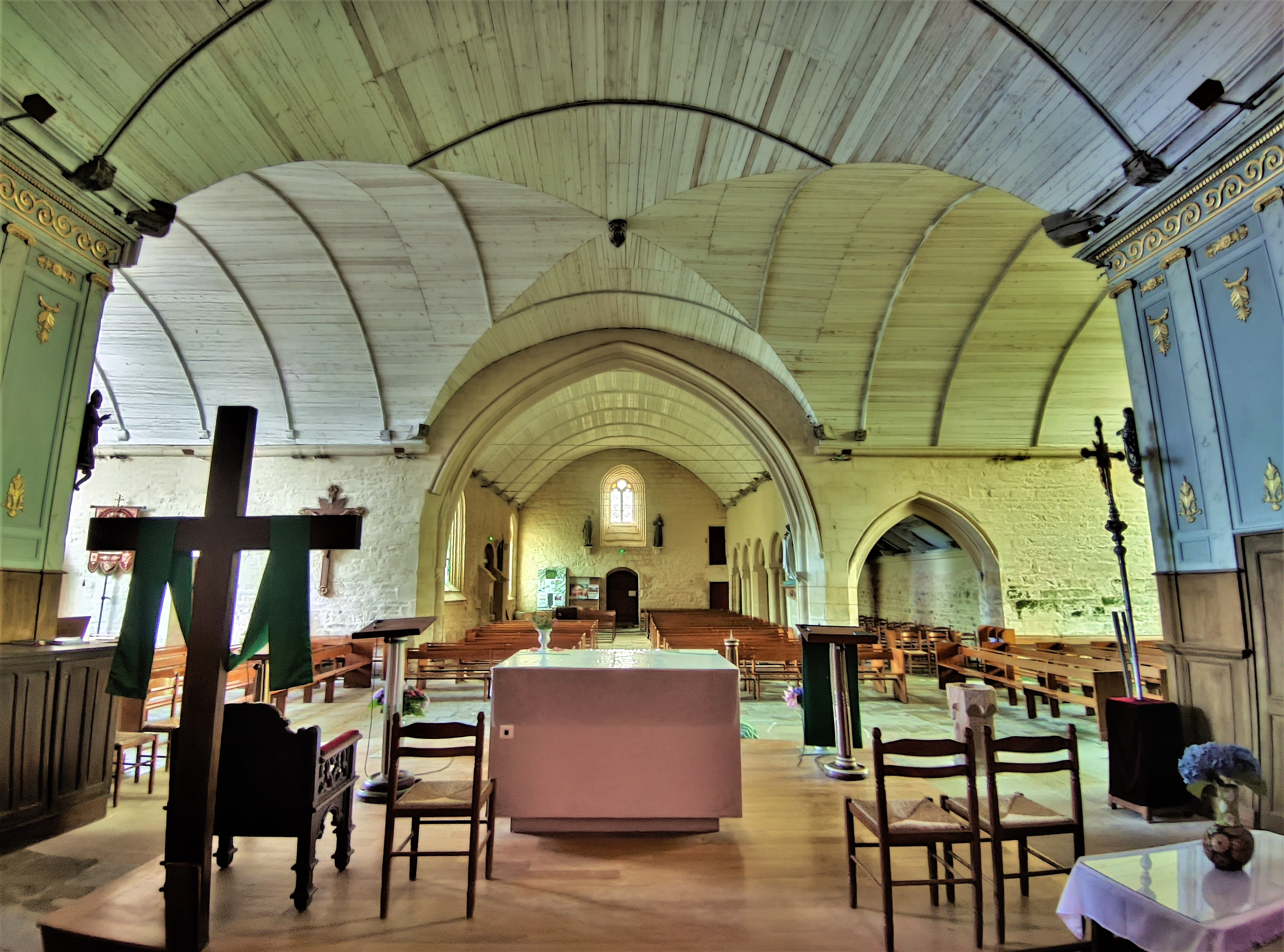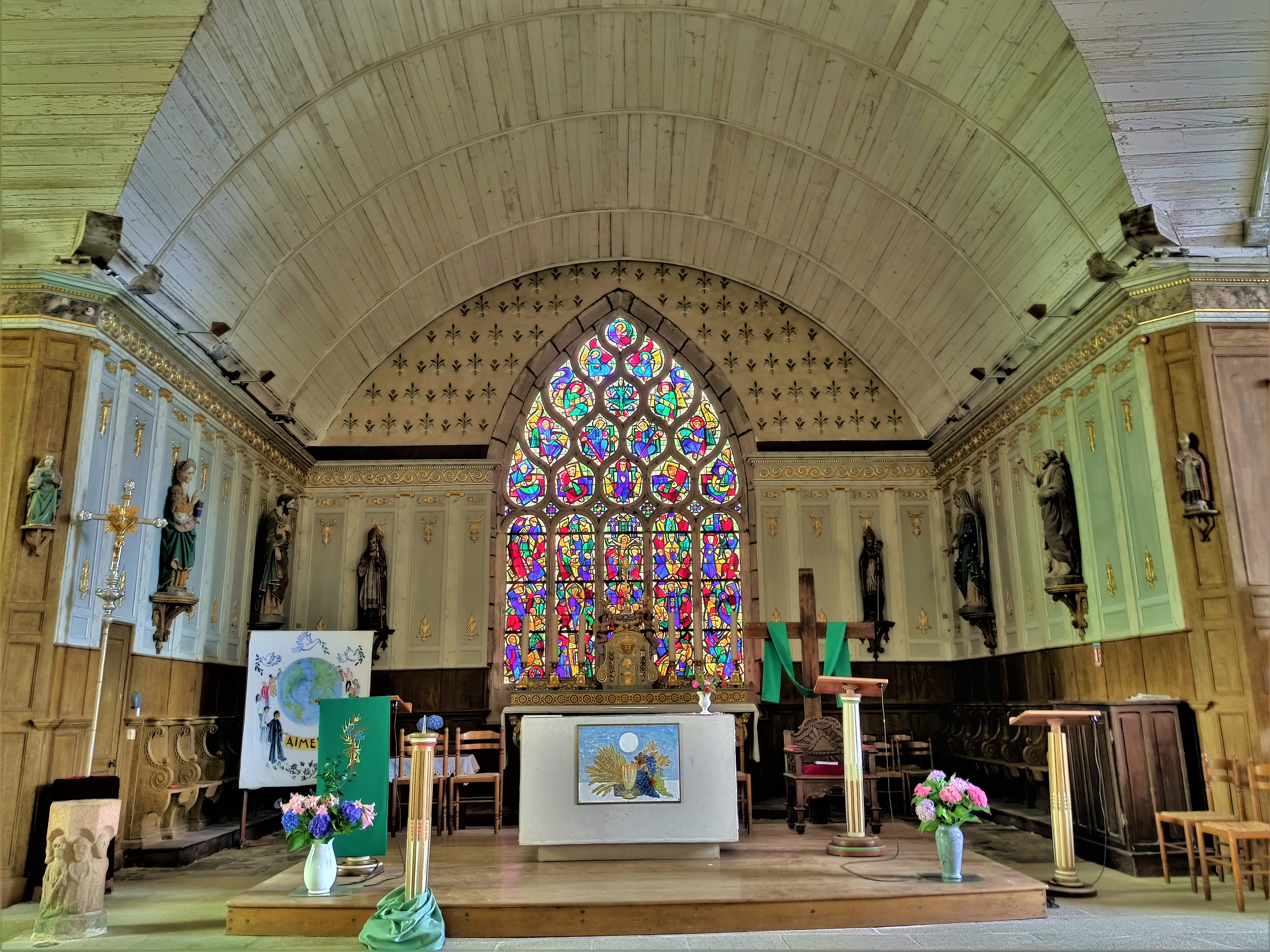 Une église du 16ème bâtie à l'emplacement d'une église du 13ème et un clocher du 18ème. L'enclos paroissial attire le regard, il abrite un Menhir, un calvaire, et un Monument aux morts original, loin des stèles habituelles. Protégée depuis août 1951 par les M H, l'église est ouverte et accueillante. Au Sud, le porche en pierre, voûté en croisée d'ogives, est encadré par une fontaine. La nef, les croisillons et le chœur sont couverts d'une voûte de bois en berceau, la croisée d'une voûte d'arêtes en bois. Un collatéral au Nord est séparé de la nef par des arcs romans, vestiges de l'église primitive. Peu profond, il a l'allure d'une galerie couverte d'un plafond rampant avec poutres apparentes. Hubert de Sainte-Marie,(1947-1991) a réalisé le vitrail de la baie axiale, le seul historié dans l'église. Les autres vitraux sont en losanges de verre, le mur Nord de la nef est aveugle. La statuaire et le mobilier sont d'agréables découvertes. Détail étrange, le portail Ouest est à moitié enterré.