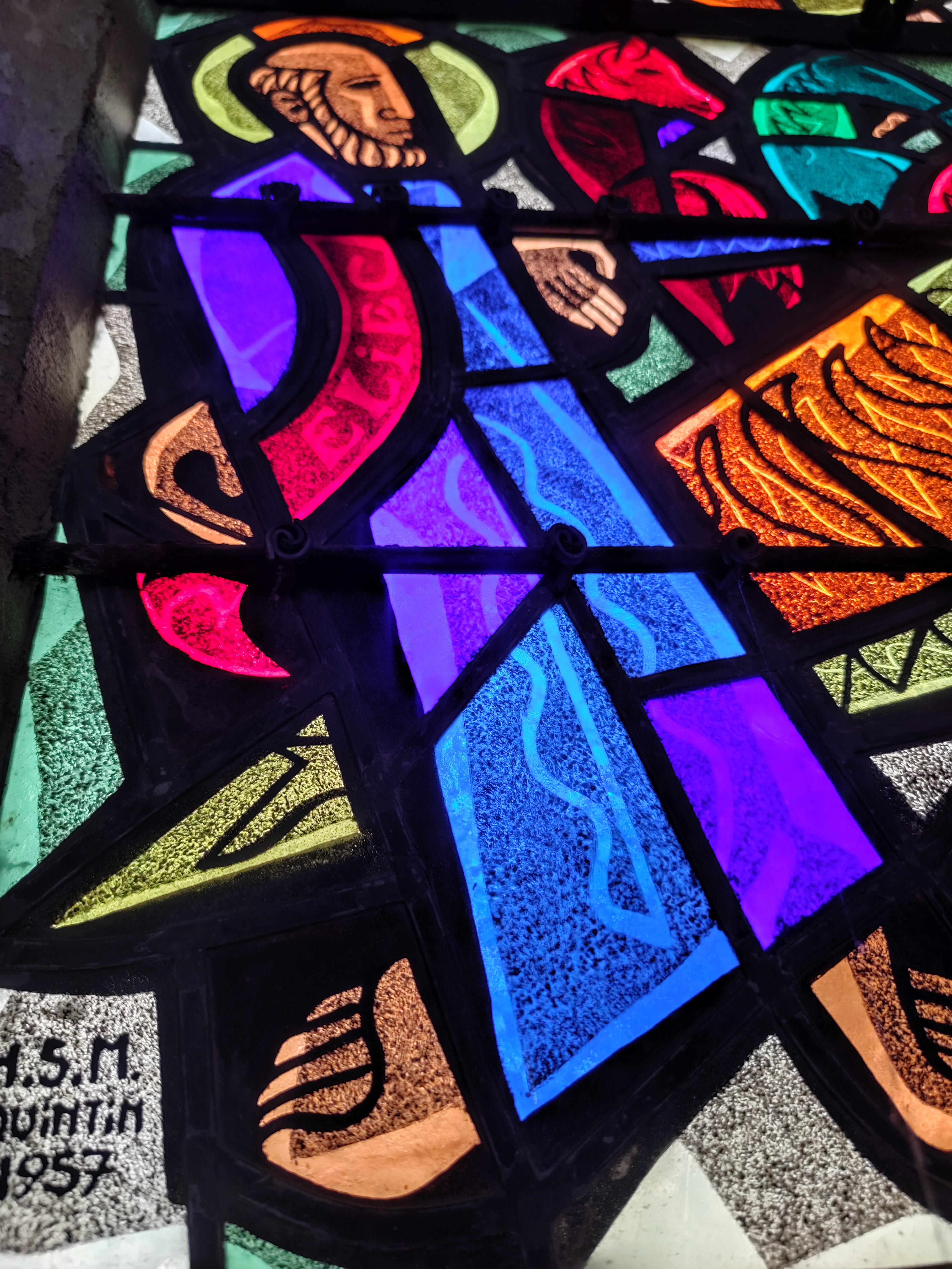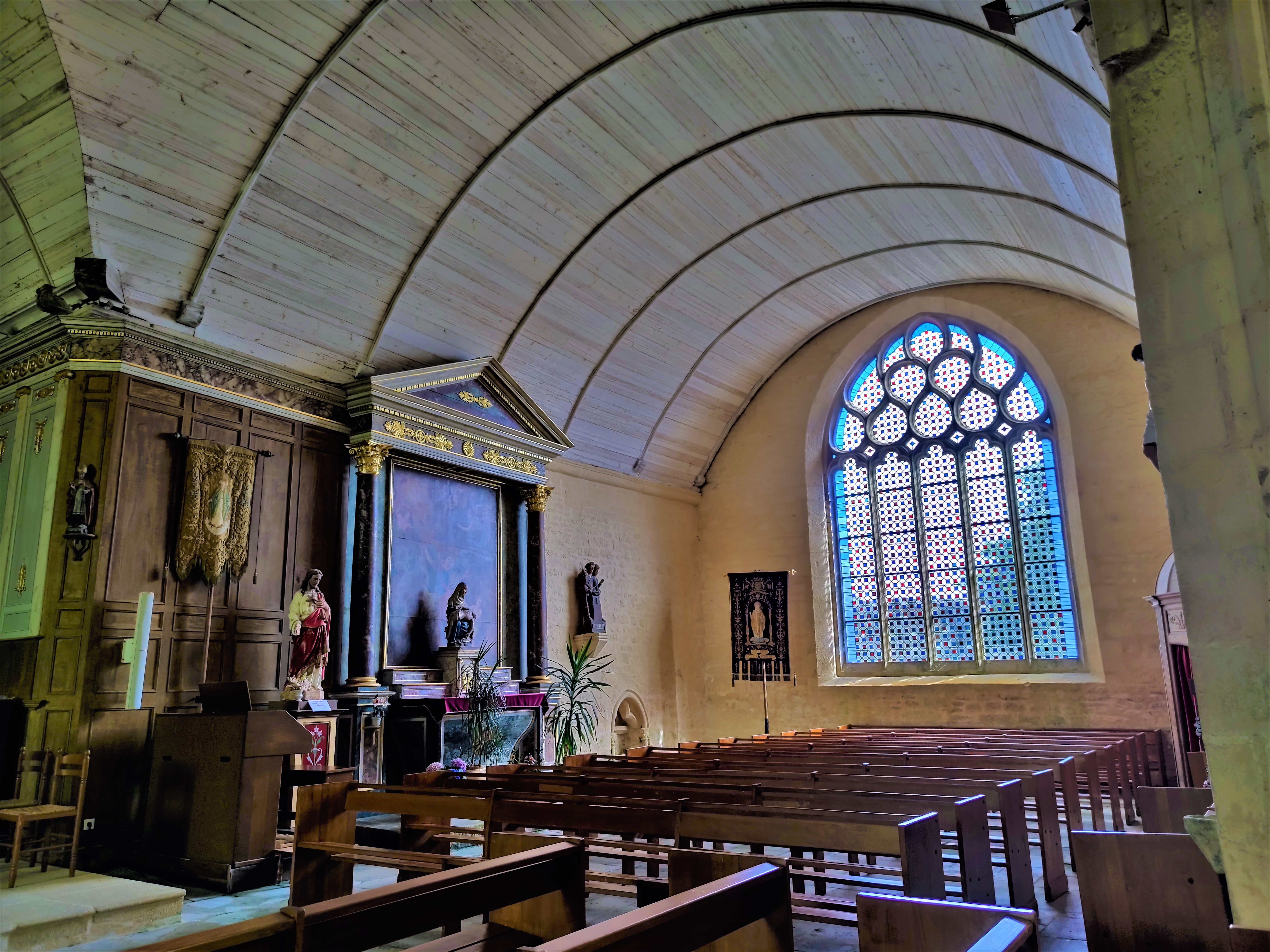 Belle église avec un vitrail impressionnant derrière l'autel.