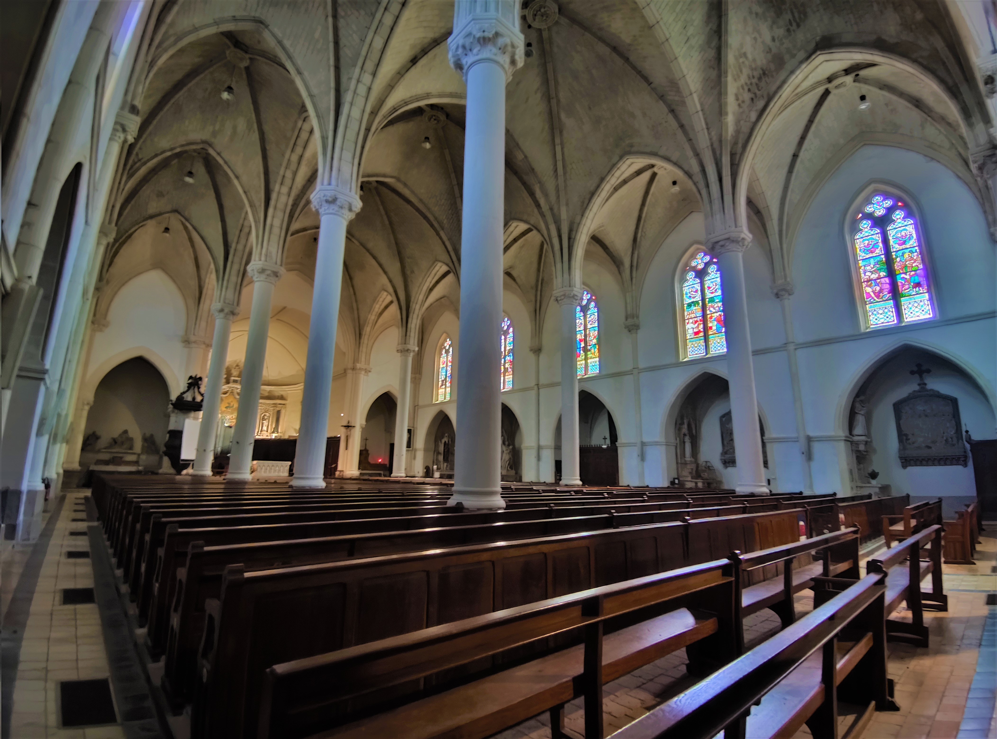 J'ai apprécié le chœur et les chapelles latérales, le sanctuaire qui abrite l'orgue est magnifique. Une église du 19ème, construite en pleine période néogothique, la façade Ouest et ses 2 clochers carrés lui donne l'allure d'une cathédrale. Construite à la place d'une église du 17ème qui menaçait ruine, cette dernière avait remplacé la chapelle castrale du 11ème. Après cette façade aux 2 clochers encadrant un pignon, on entre dans une nef à trois vaisseaux de même hauteur. Les 2 collatéraux sont bordés d'une série de chapelles, abritant les stations du chemin de croix, un baptistère et un monument aux morts. Chaque chapelle est surmontée d'une baie gothique à remplage et vitrail historié. Tout cela, plus les colonnes et arcatures qui divisent les vaisseaux voûtés en croisées d'ogives très prononcées, offrent à cette église un côté somptueux mais peu chaleureux. J'ai apprécié le chœur et les chapelles latérales qui sont l'héritage préservé de l'église du 17ème. Cette partie Est m'a semblé plus à même d'accueillir des visiteurs à la recherche d'intimité et d'intériorité. Le sanctuaire qui abrite l'orgue est magnifique.