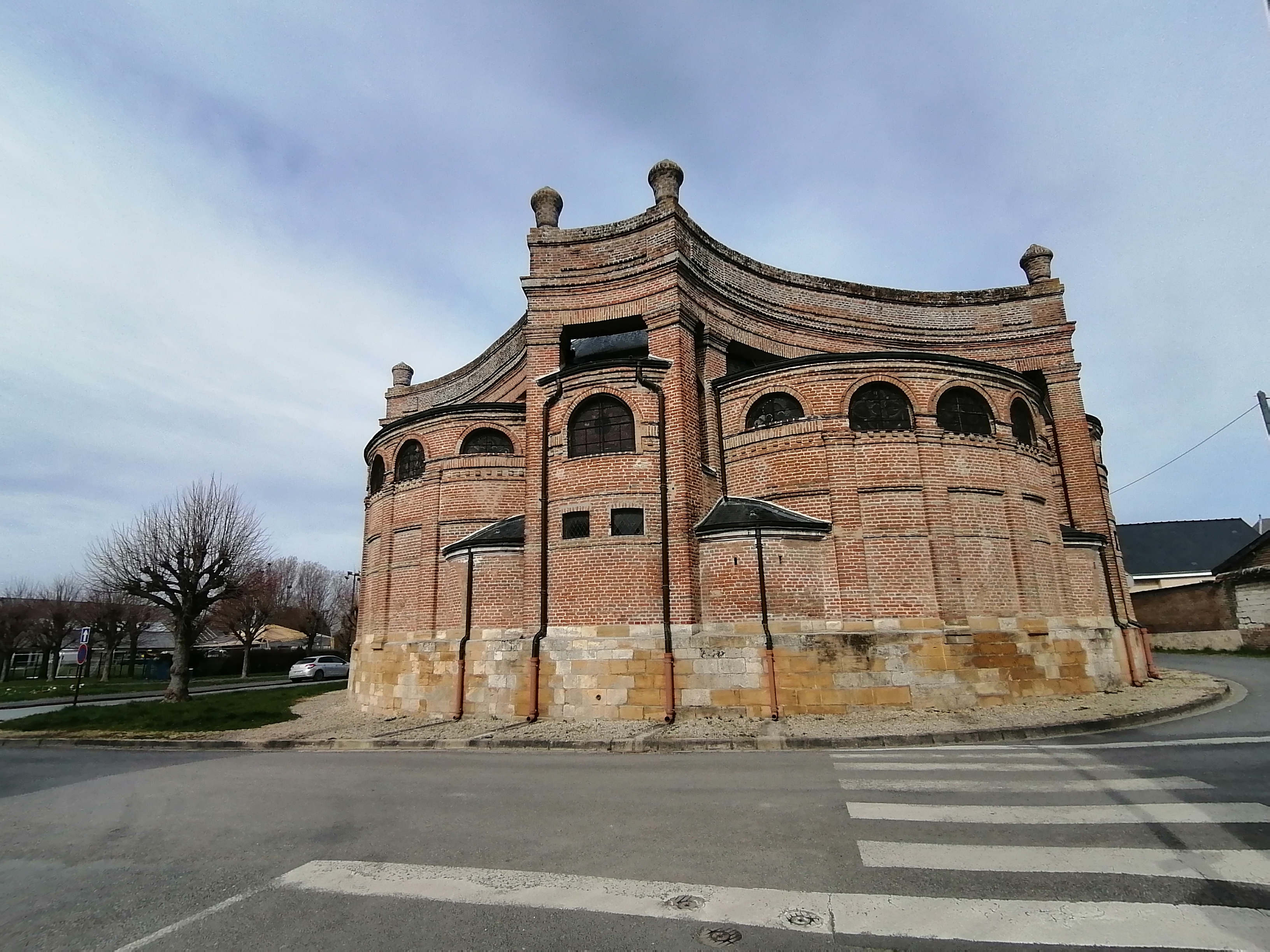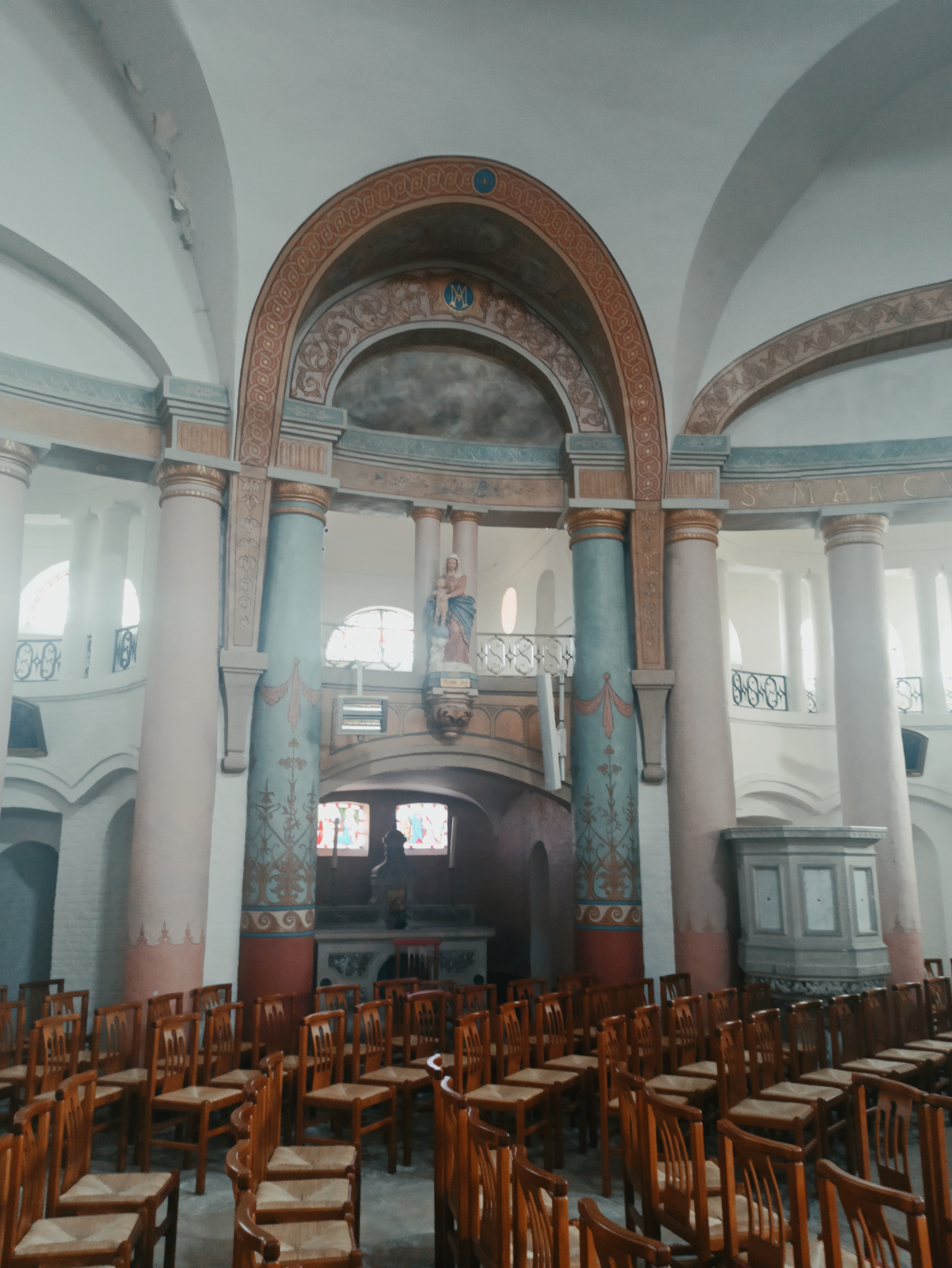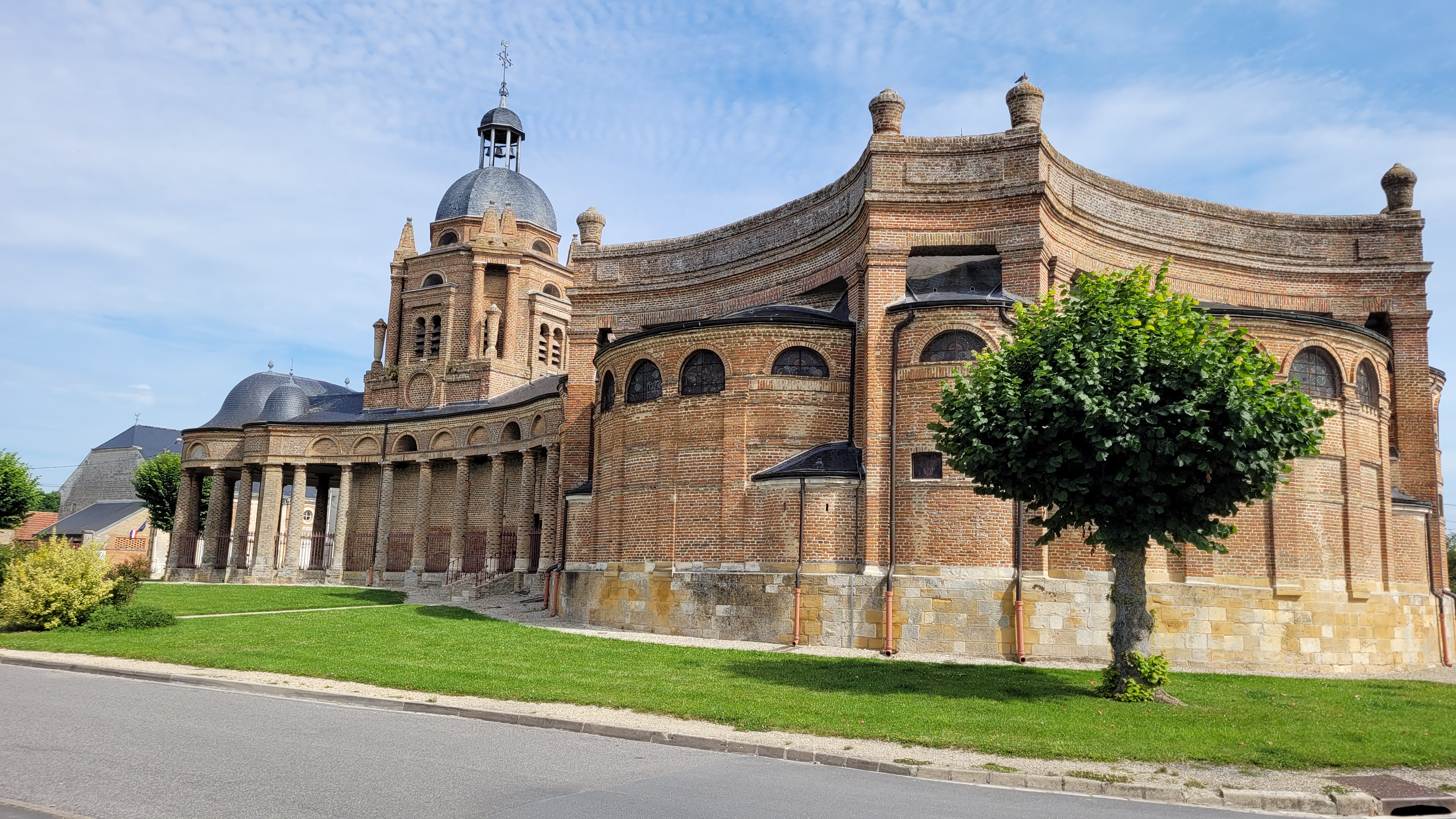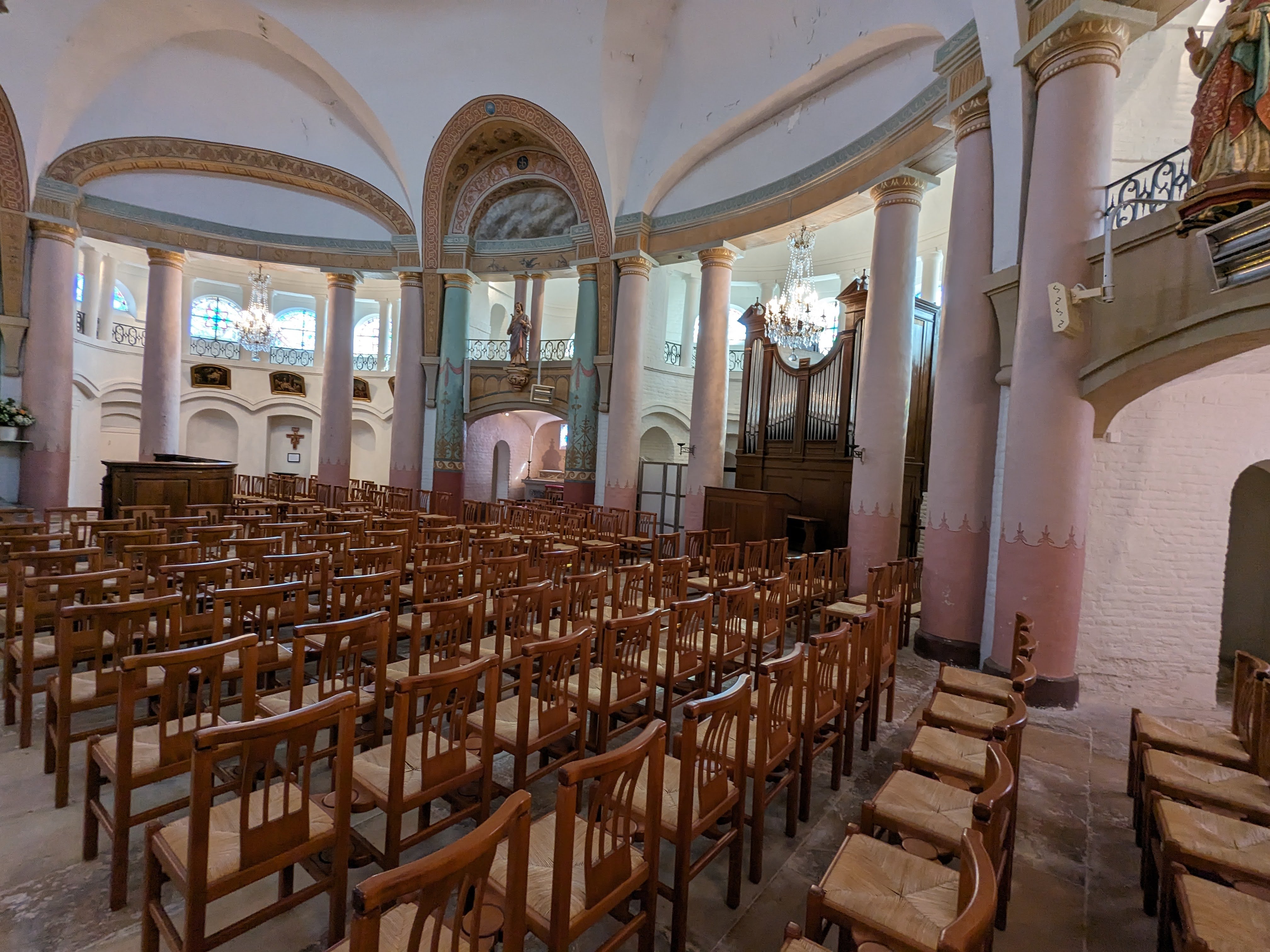 Dans ce village de Champagne-Ardennes portant un nom aux consonnances étrangement germaniques, une église tout aussi improbable dont le plan évoque la silhouette d'une viole. La partie la plus remarquable, aussi bien intérieurement qu'extérieurement, est la rotonde bâtie sur un plan pentagonal.