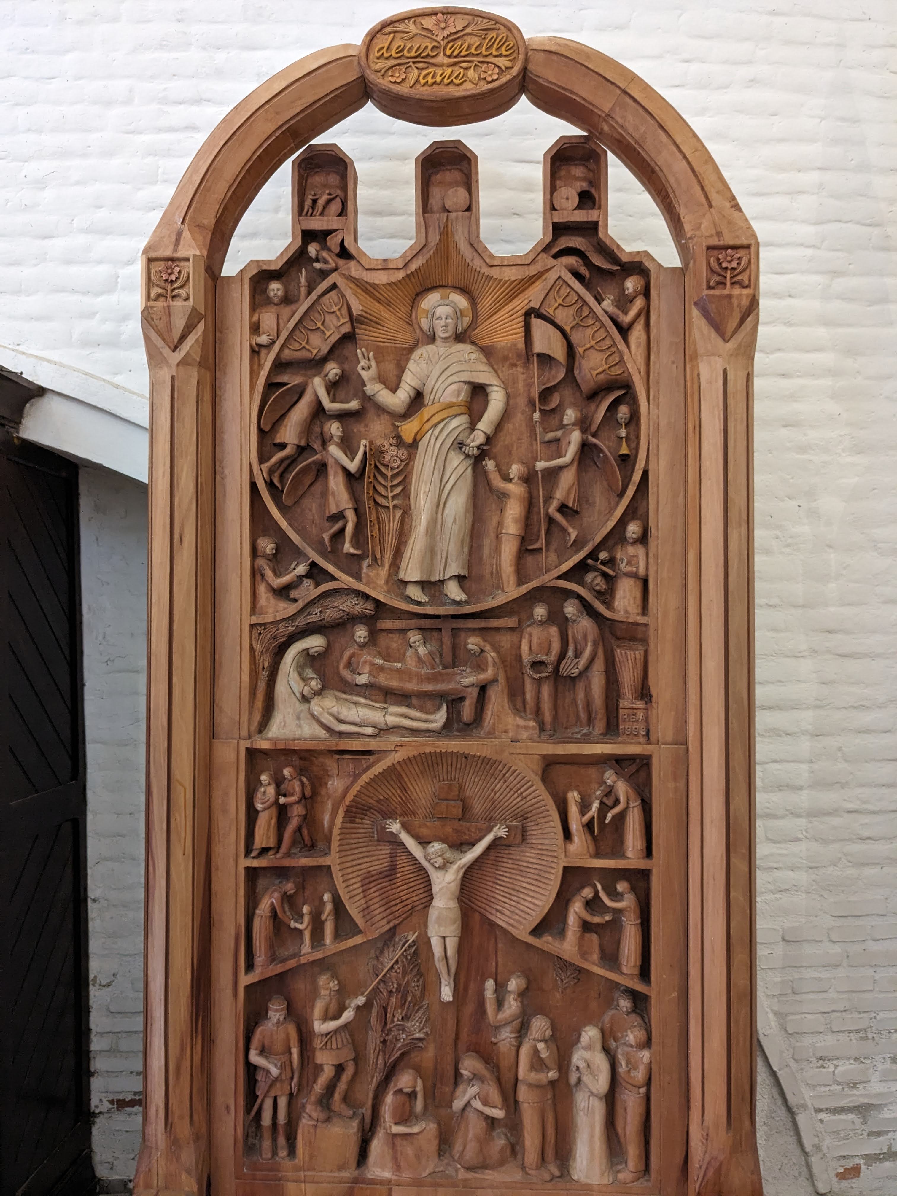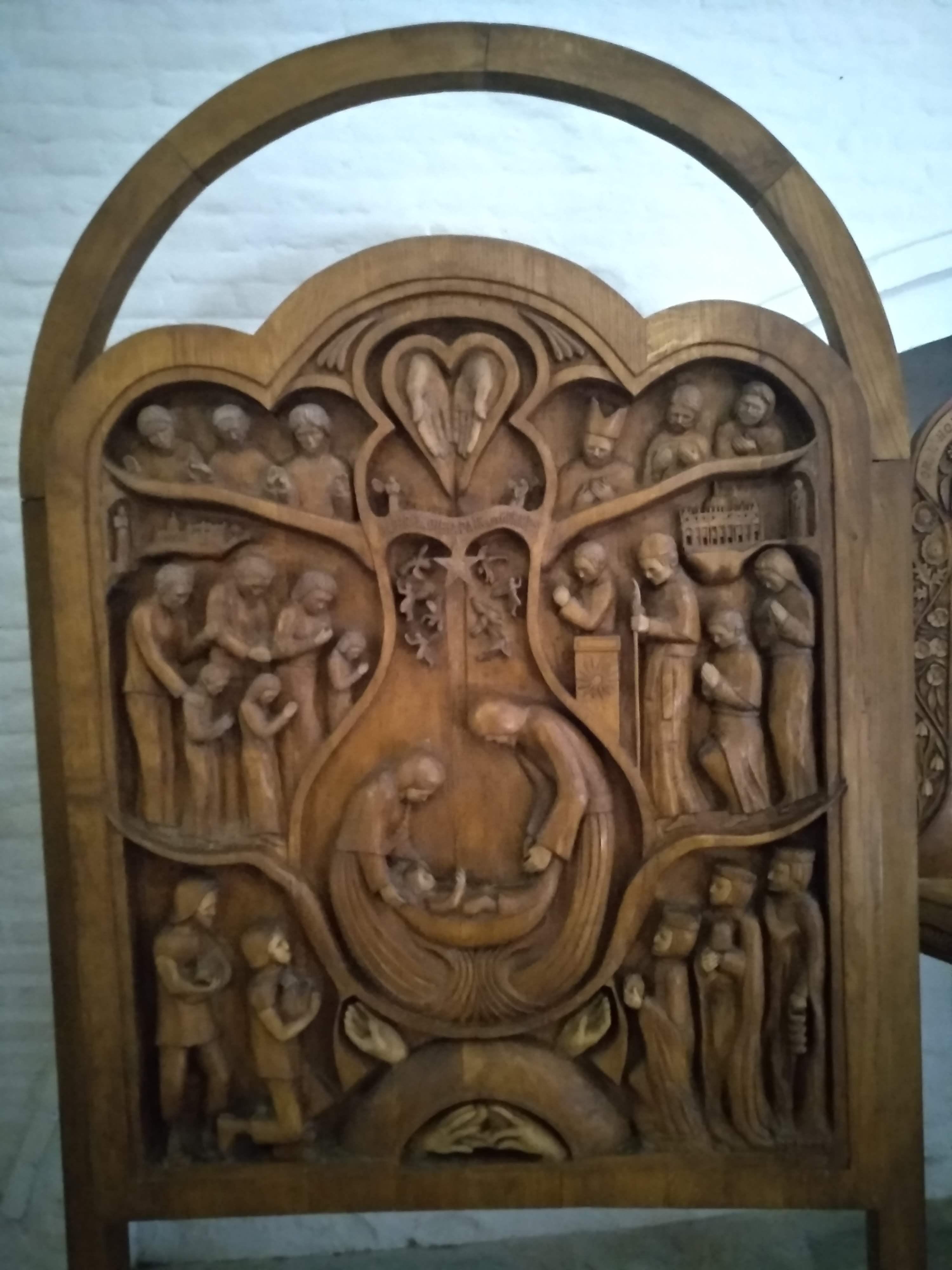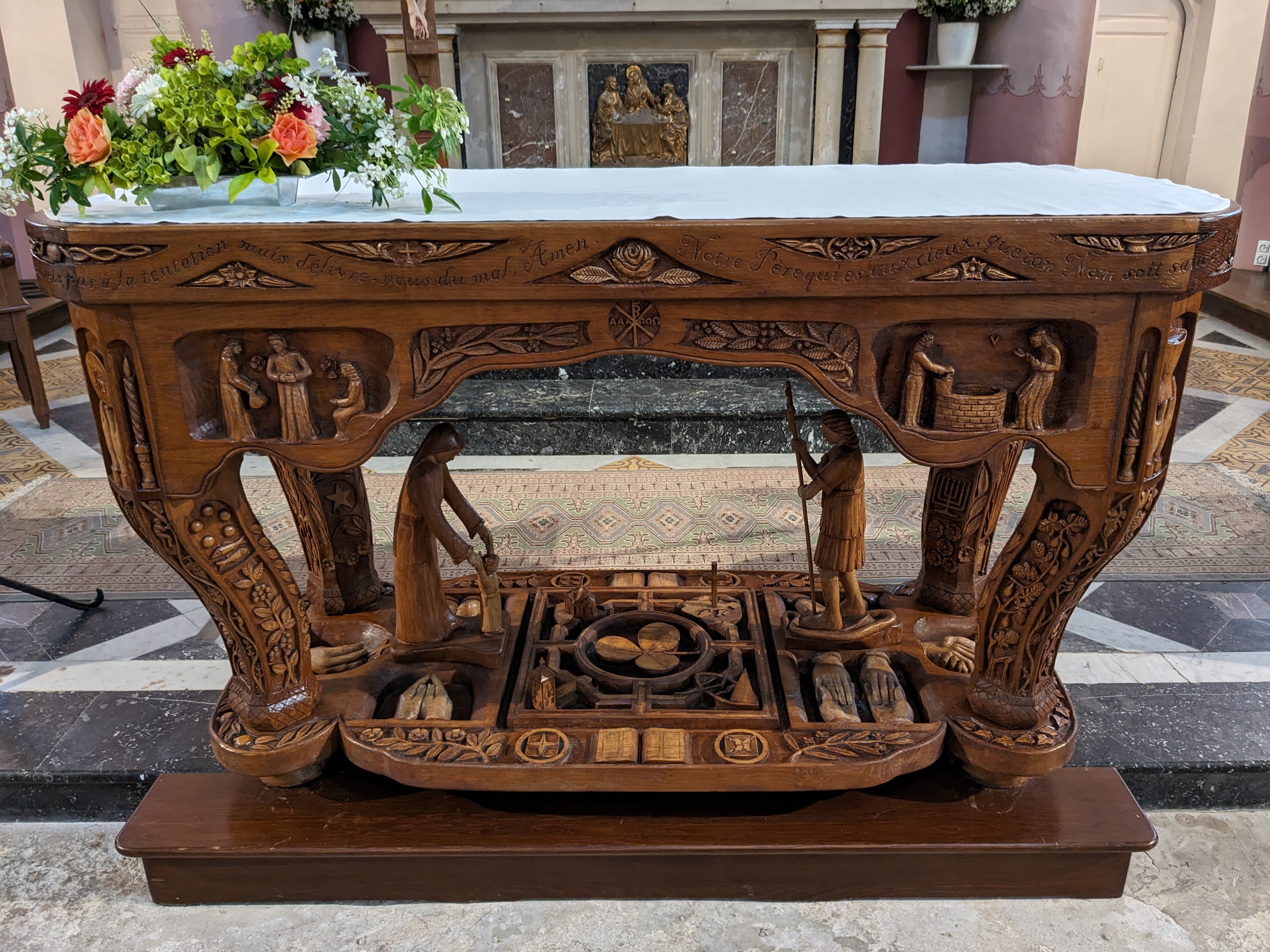 Visite enrichissante, Construction de forme très particulière et autel en chêne remarquable.
