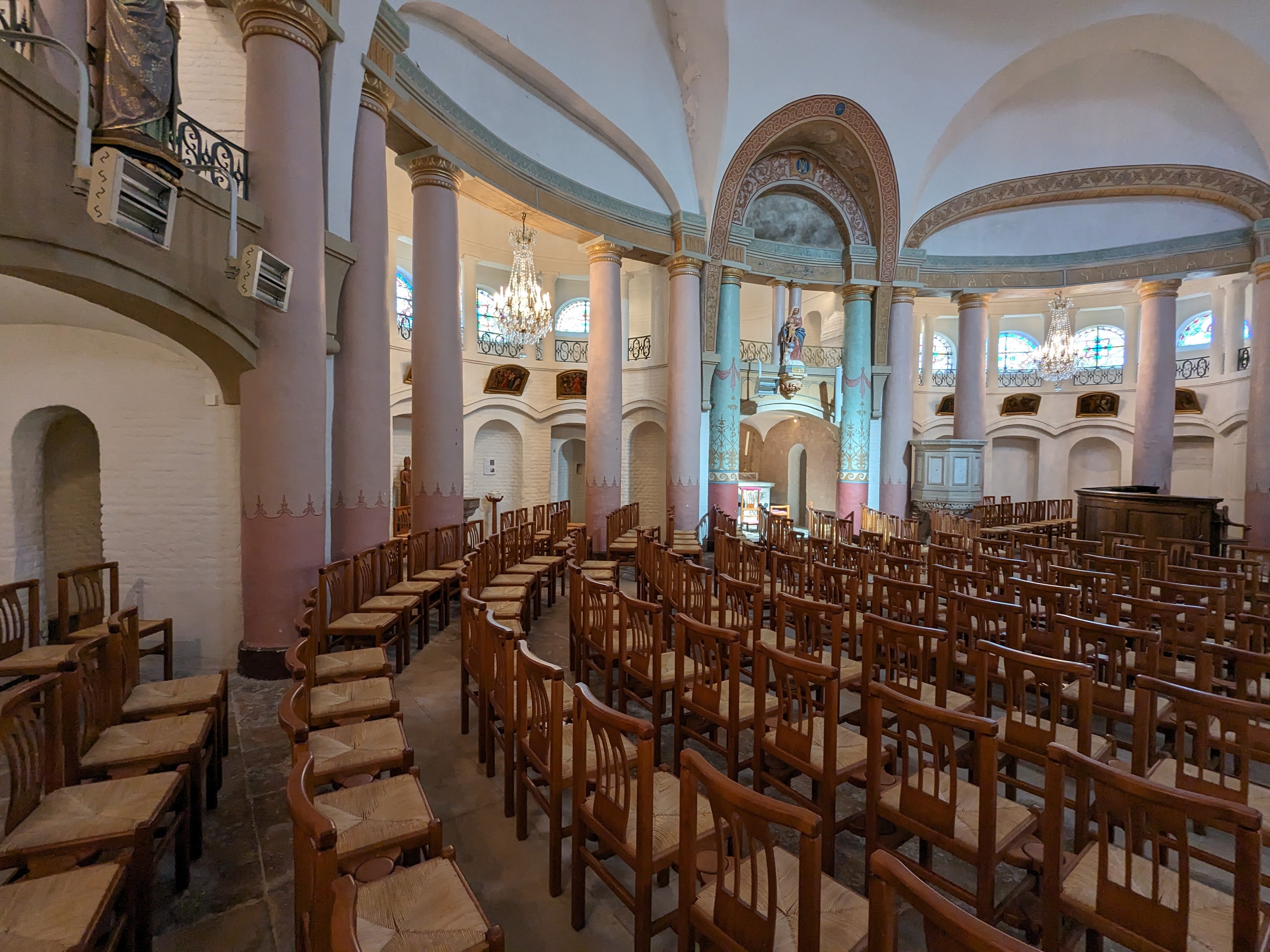 Superbe au cœur d'un village des Ardennes. Architecture originale et bien entretenue. Particularité du corps intérieur avec ses passages discrets entre les alcôves permettant de circuler sans gêner l'Office.
