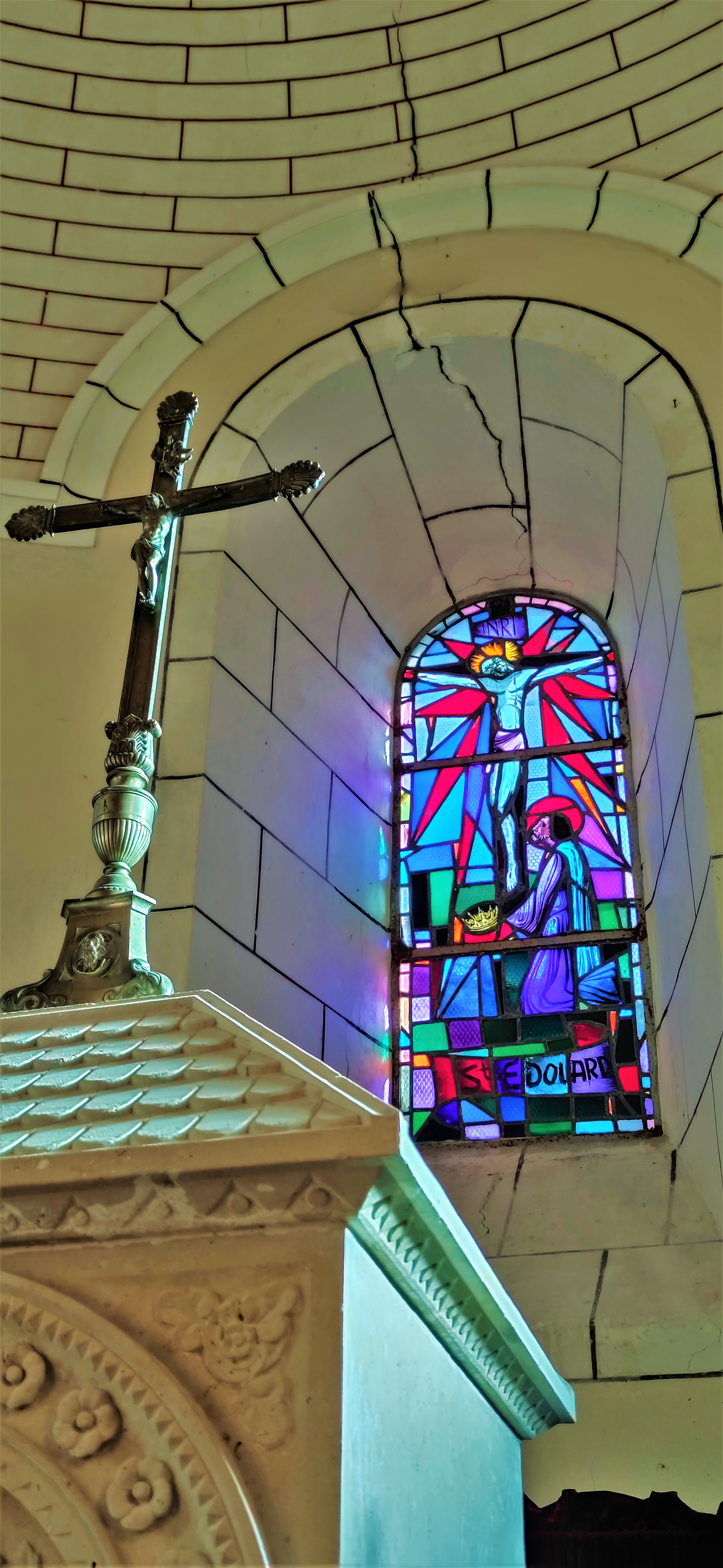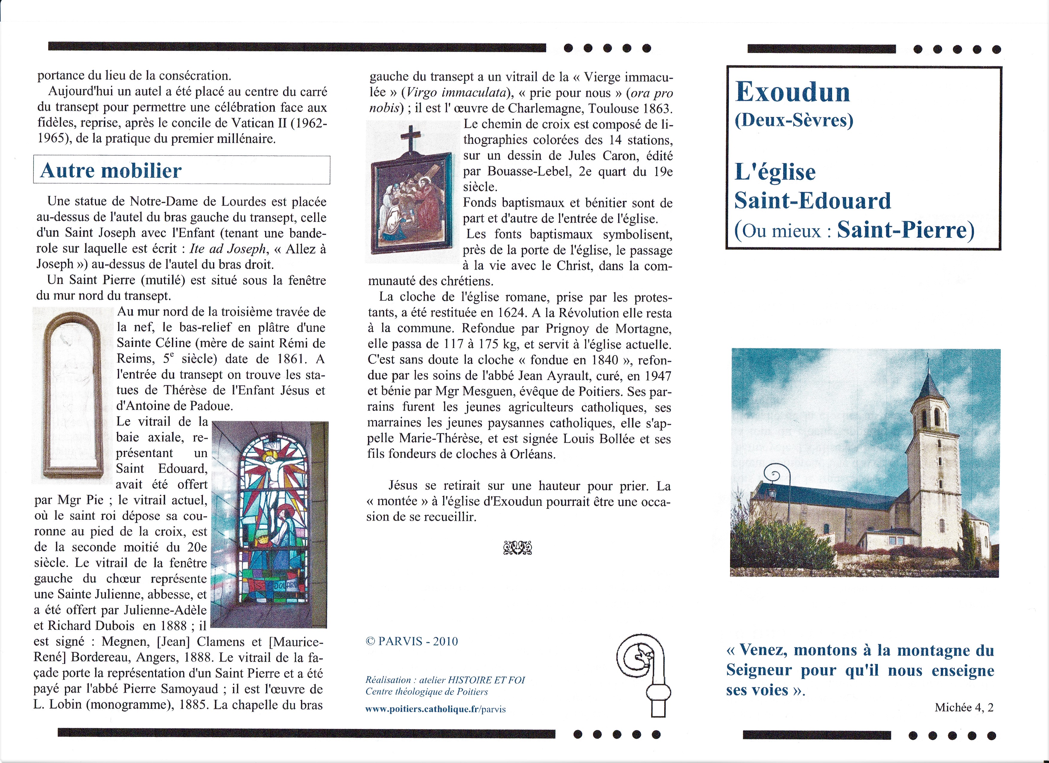 Après un passage à Exoudun où l'église et la mairie étaient fermées, je me suis organisé pour pouvoir voir l'intérieur. C'est la troisième église construite en 1855 à cet emplacement. Il existait une église en l'an 1000, on en reconstruisit une à l'époque romane. Disparue après sa vente comme carrière de pierres à la fin du 18è, sa crypte fut découverte en 1973. Cette église du 19ème est bien mise en valeur sur les hauteurs, son allure est élégante. C'est par erreur que Saint-Édouard apparaisse comme protecteur de cet édifice qui est en fait sous le patronage de Saint-Pierre. Saint-Édouard fut honoré à la consécration du maître autel et l'habitude de le nommer comme Patron de l'église fut prise. Elle est l'héritière de 1000 ans de patrimoine bâti dans cette cité dont l'histoire chrétienne est plus ancienne. Au 4è, Saint-Martin serait passé à Exoudun et aurait utilisé les eaux de la Fontaine Bouillonnante pour baptiser. A forte imprégnation protestante, cette commune possède un Temple bâti en même temps que l'église. Village accueillant, Exoudun offre de belles balades, son patrimoine bâti est intéressant.