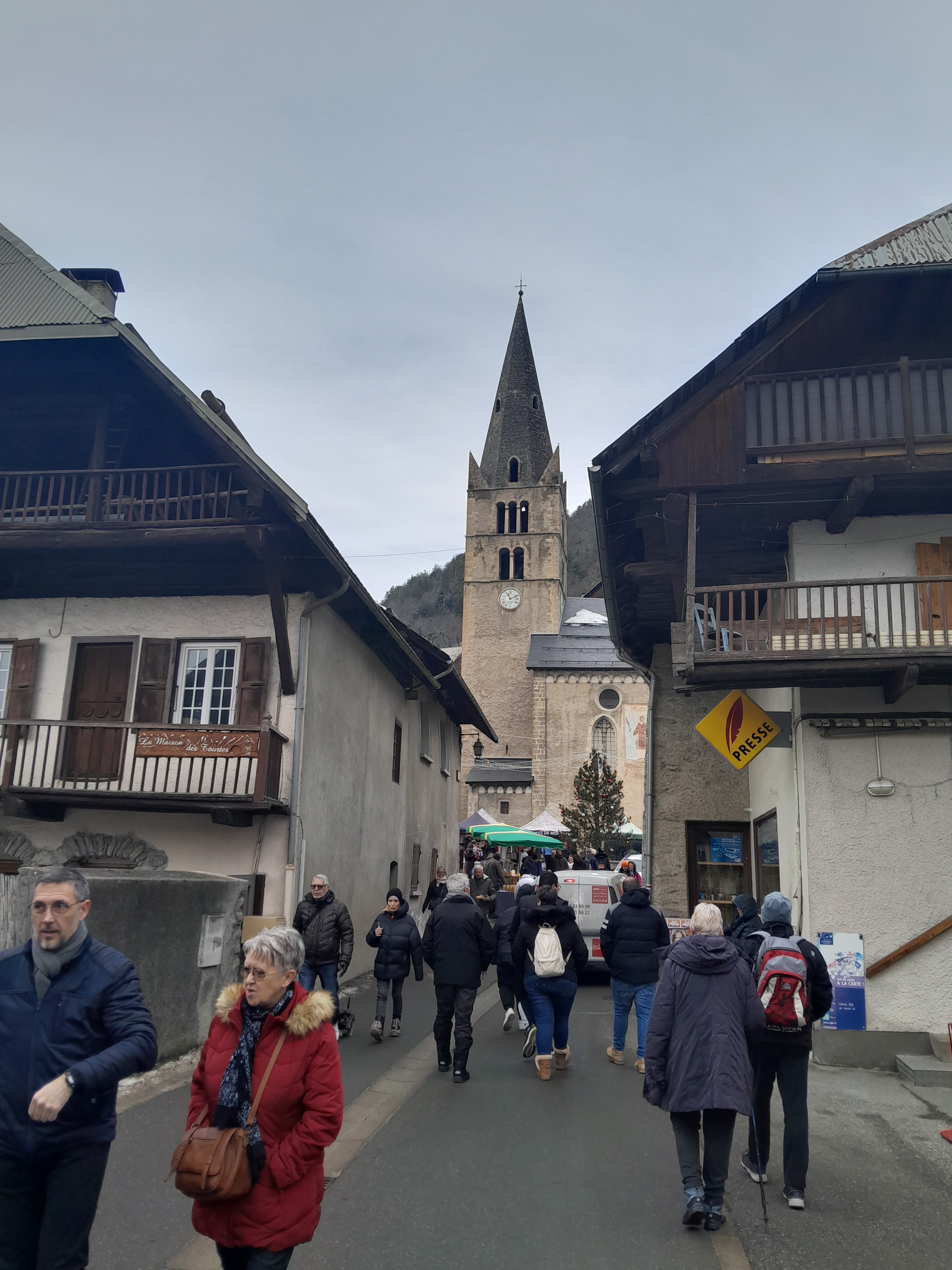 Très joli village, belle église entourée de maison et chalet typique des vieux village des alpes