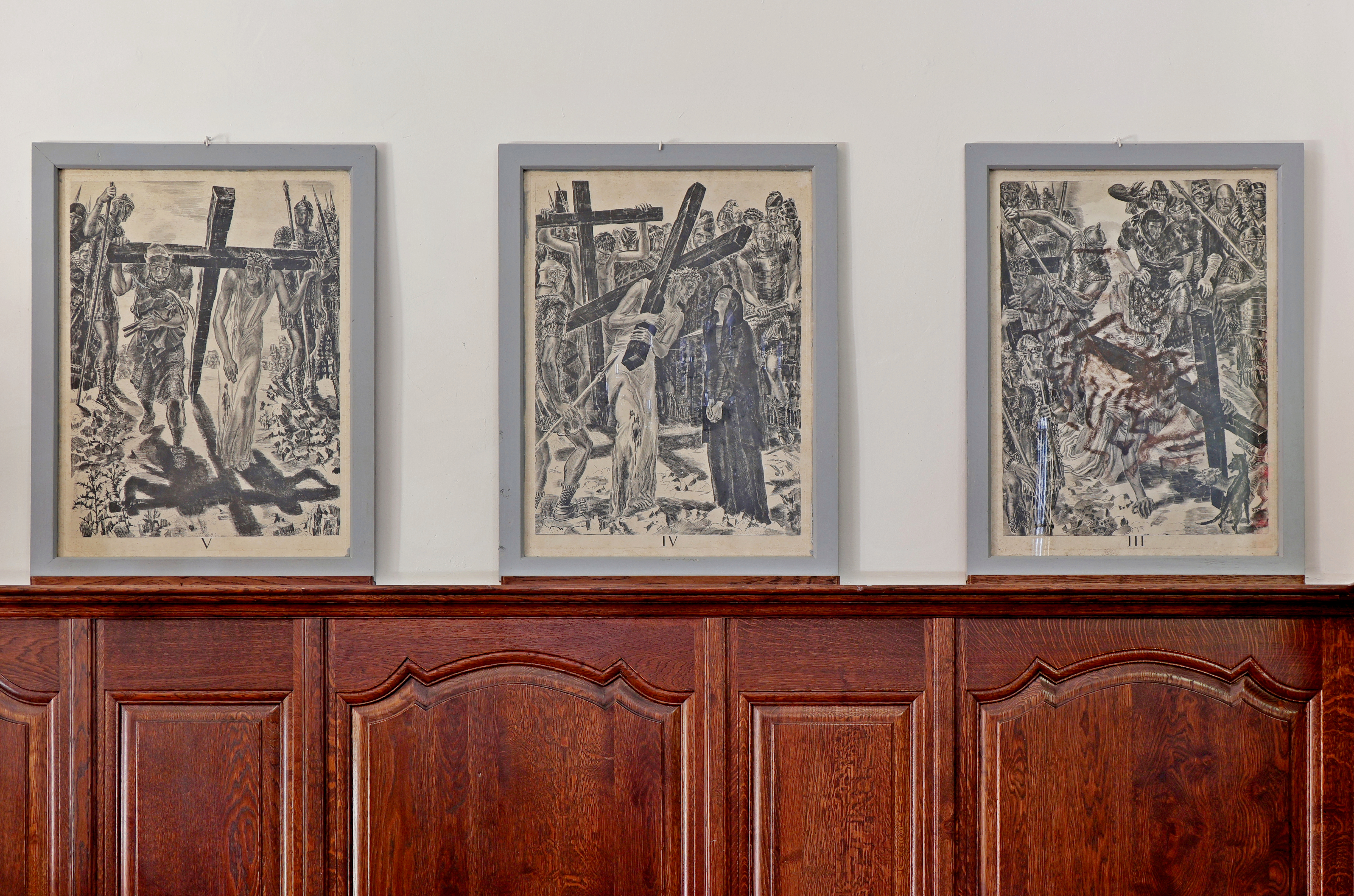 Photo de trois des douze tableaux du chemin de croix. Tableaux gravés au burin sur cuivre (puis imprimé sur papier) par le maître graveur Albert Decaris (1901-1988).