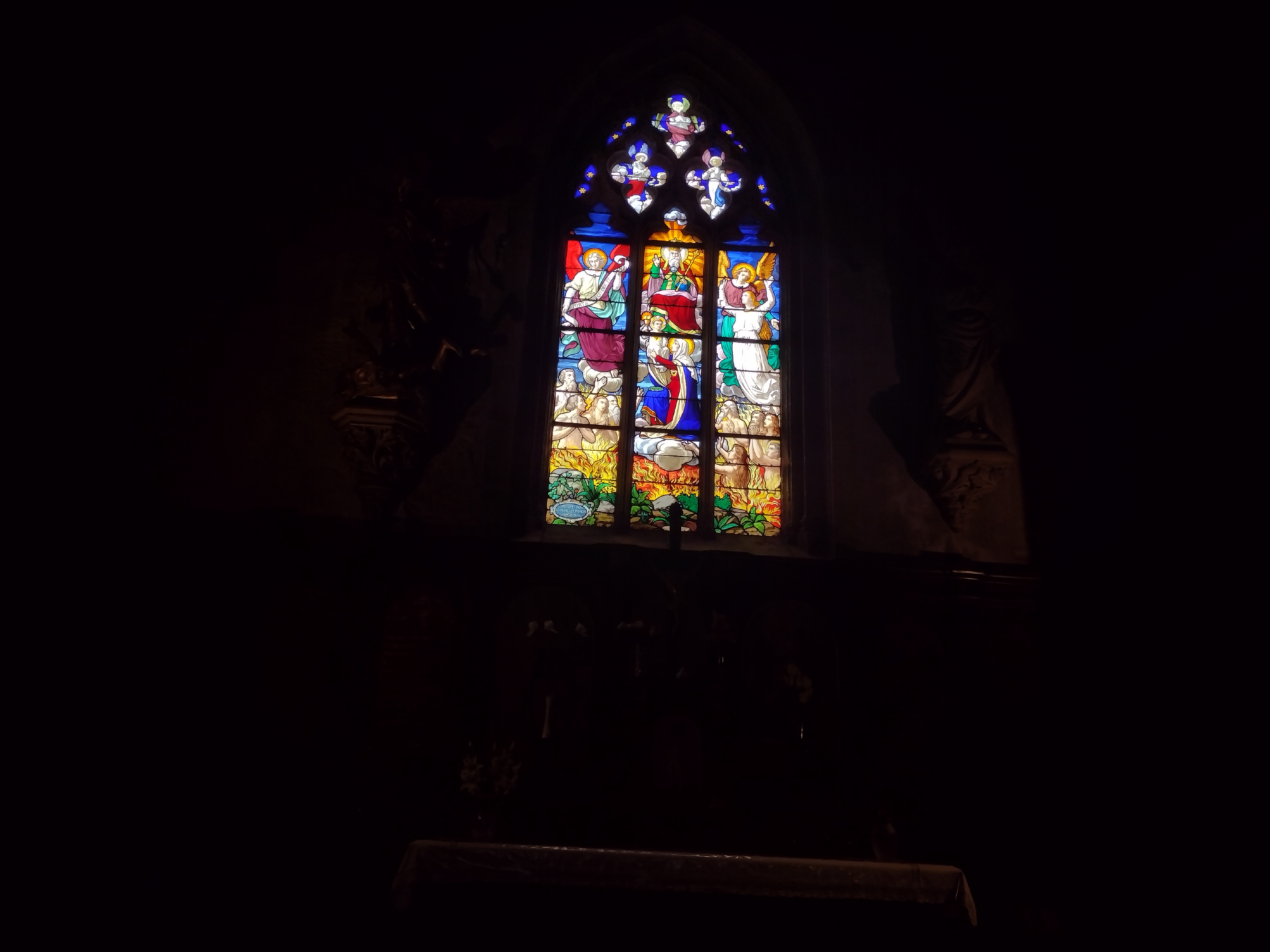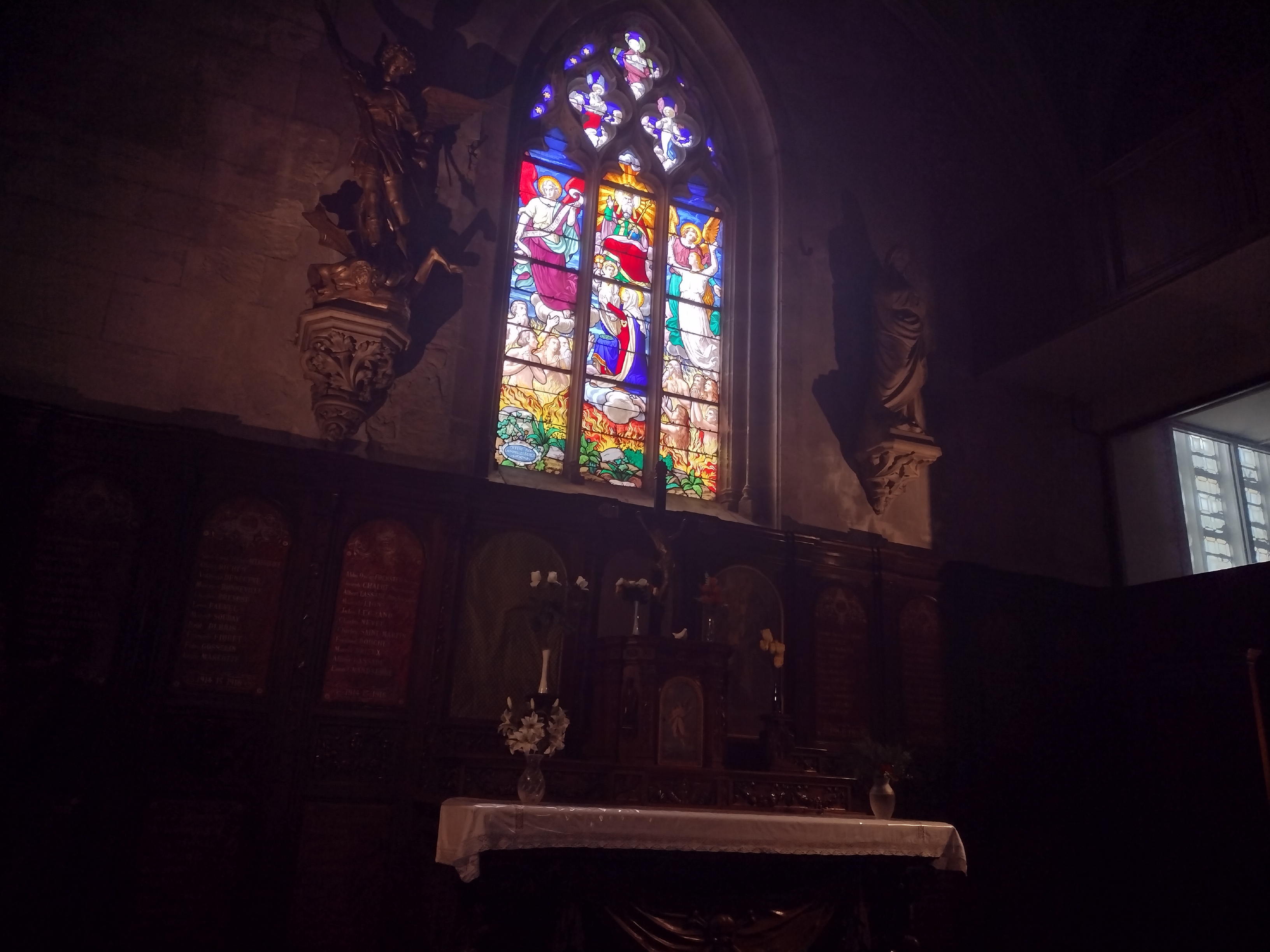 Eglise en travaux Très abîmée De beaux vitraux et de belles peintures Ferme à 16h30