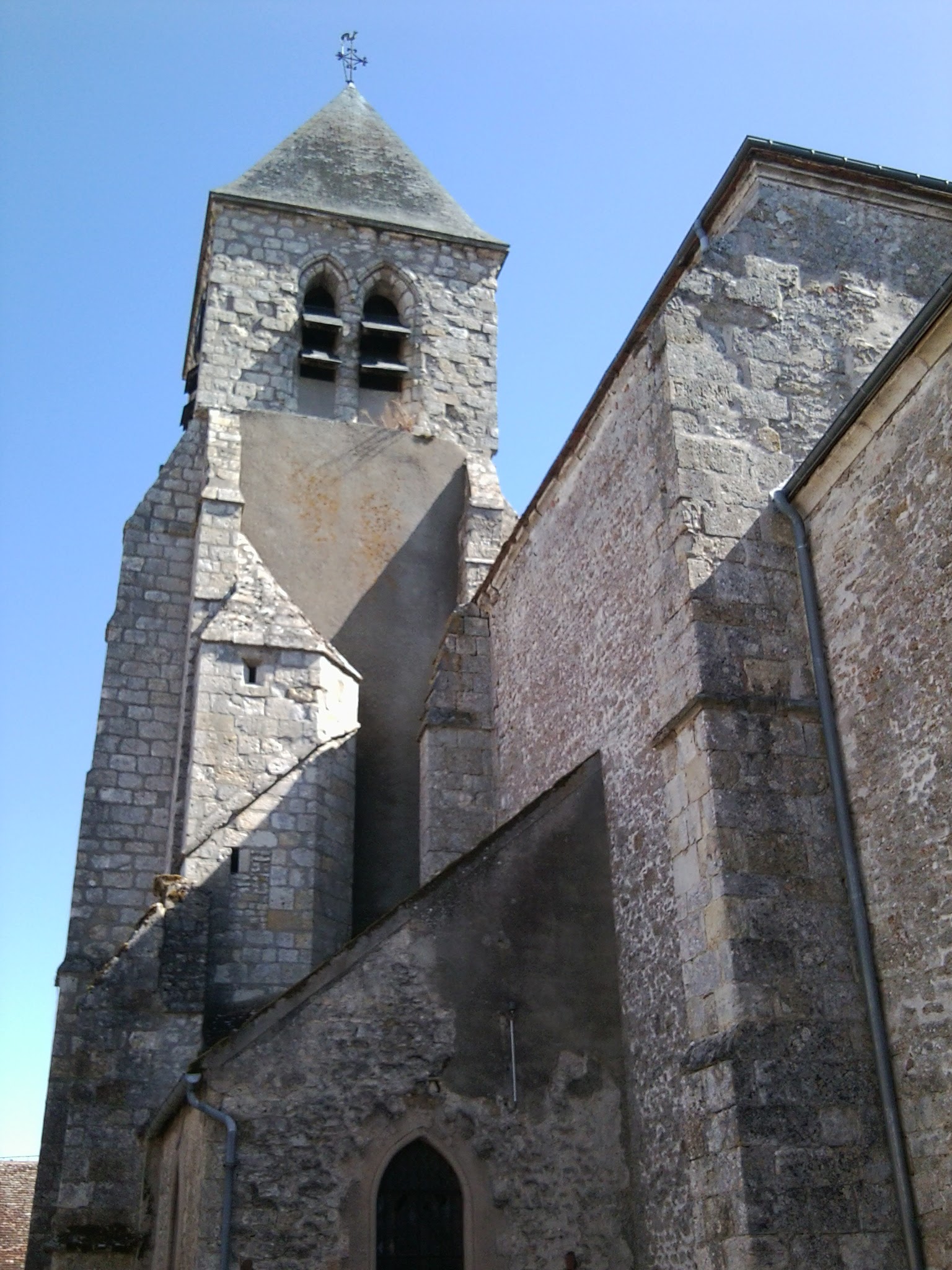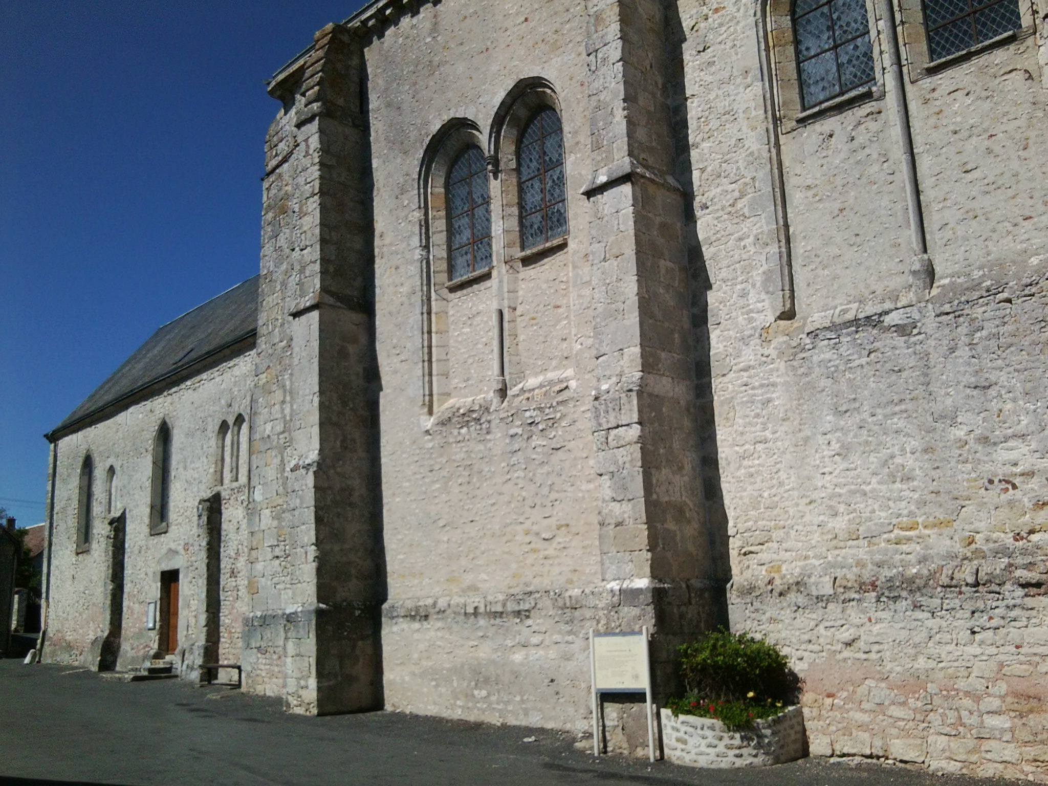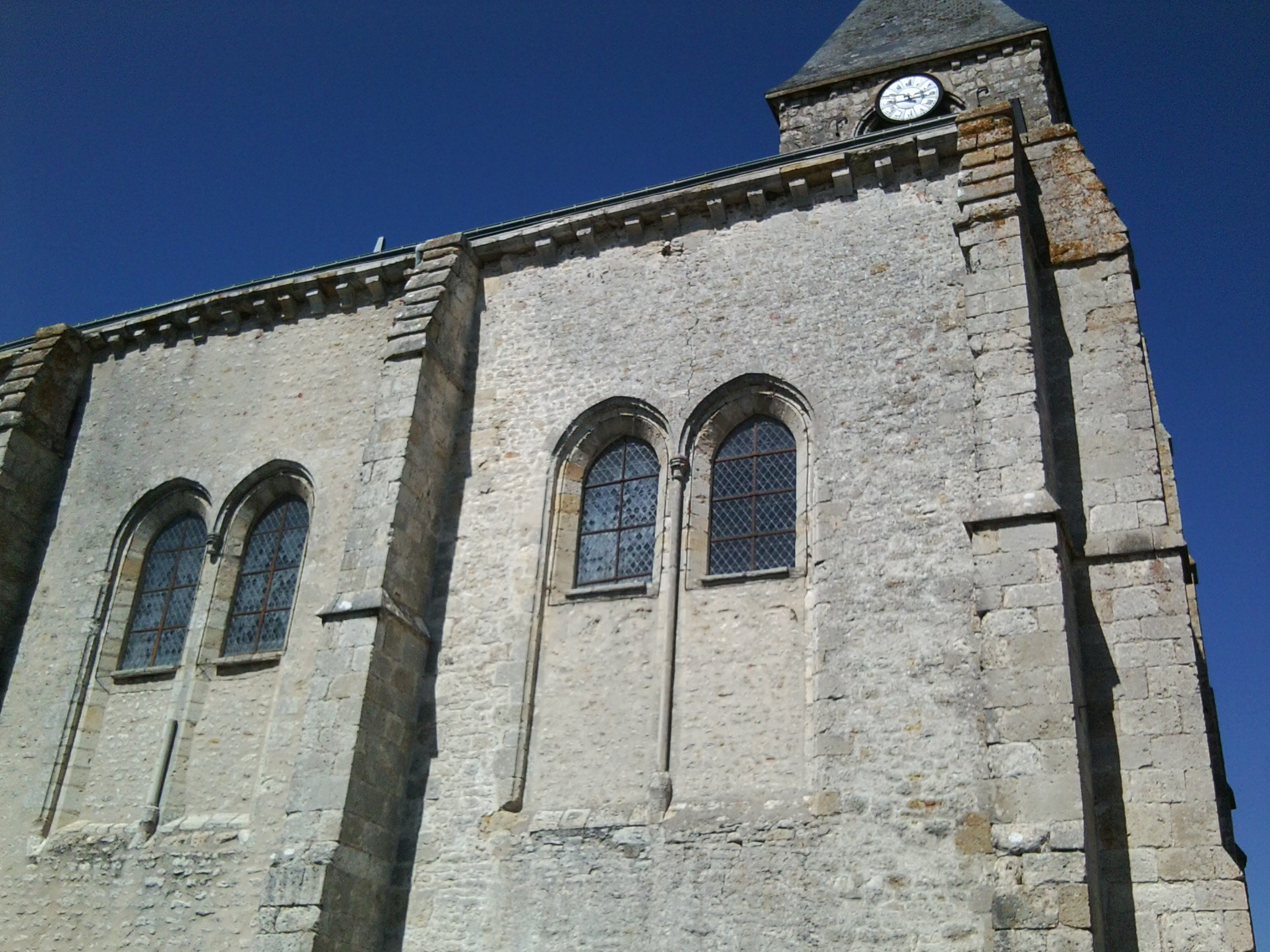 De la construction primitive du XIVe siècle ne sont conservés que le choeur composé de deux travées carrées et le clocher accolé en prolongement de la façade postérieure, sur le côté nord. De longues fenêtres géminées éclairent chaque travée. Une fenêtre triple à lancette centrale occupe le fond de la travée formant l'abside carrée. La nef est plus étroite et plus récente.