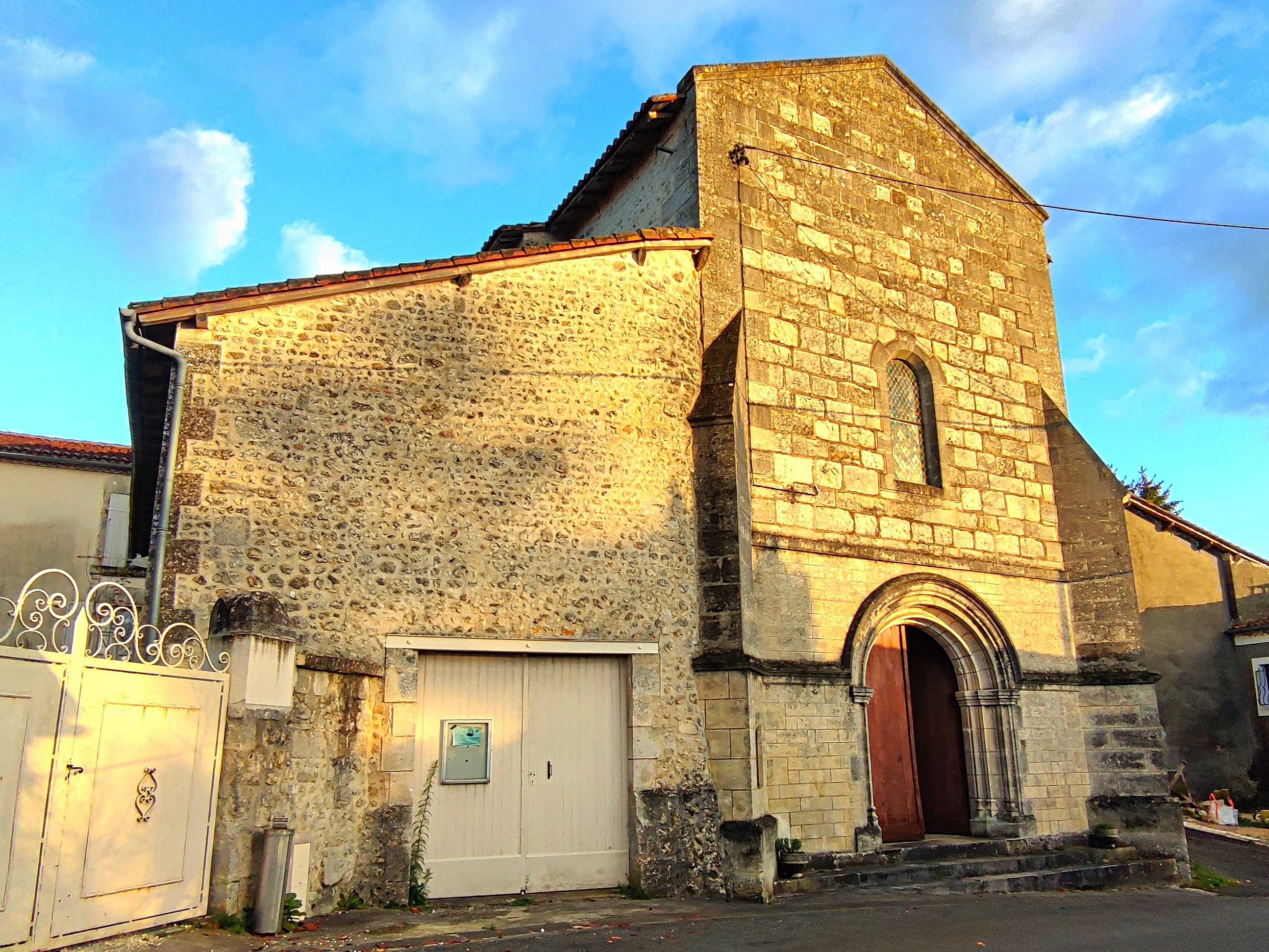 Église romane du 12è protégée en totalité par les MH depuis 2009, on entre à l'Ouest par un porche ajouté au 15è. Il faut entrer dans le cimetière pour avoir une vue d'ensemble sur cet édifice, son chevet en hémicycle et son clocher carré. Dans la partie basse du porche qui fait narthex, quelques traces de décors peints ont subsisté. La nef unique voûtée en berceau prolongée d'une abside voûtée en demi-coupole, les ouvertures et les arcs doubleaux en plein cintre, l'esprit roman de l'église primitive a été préservé.