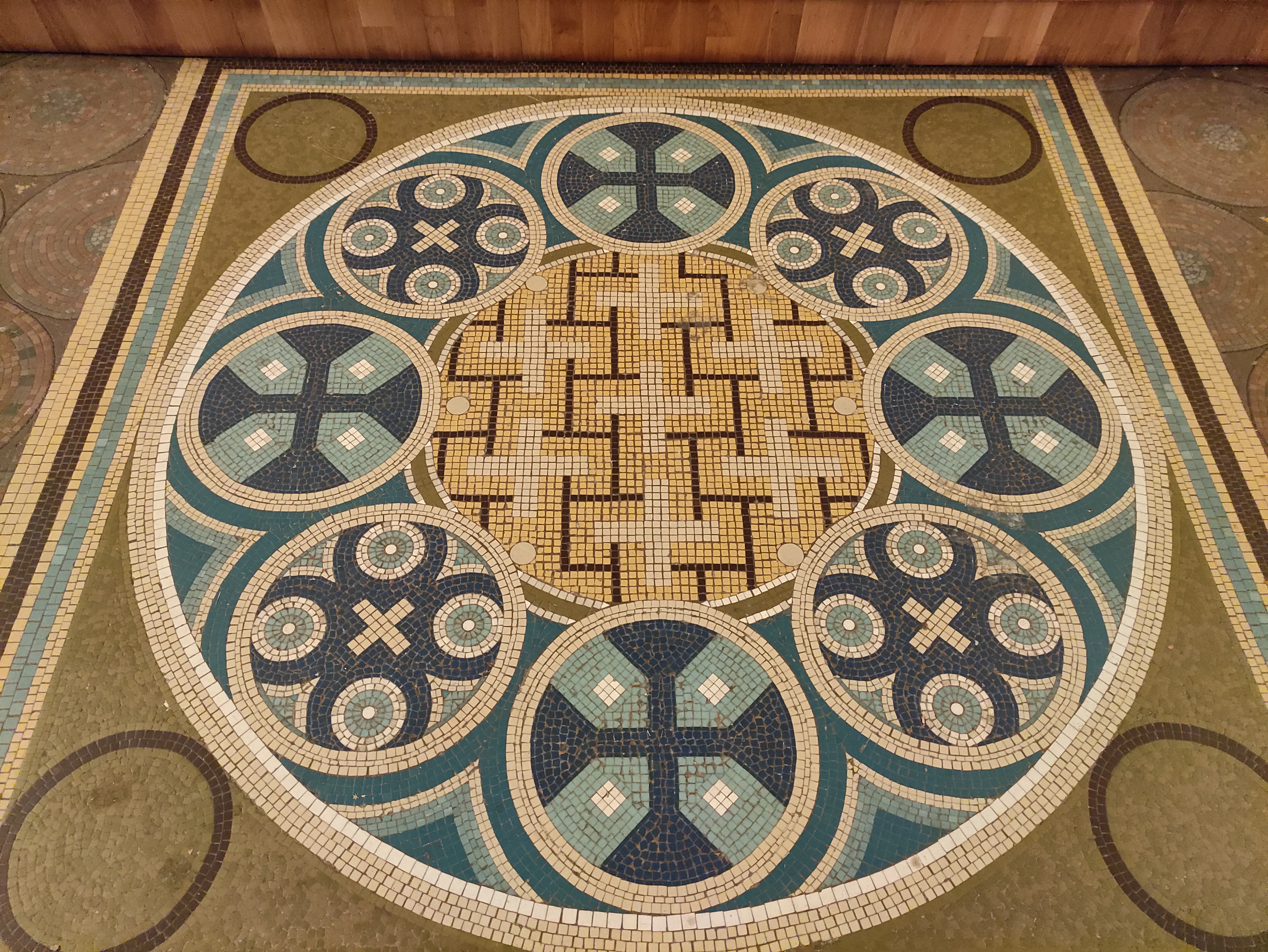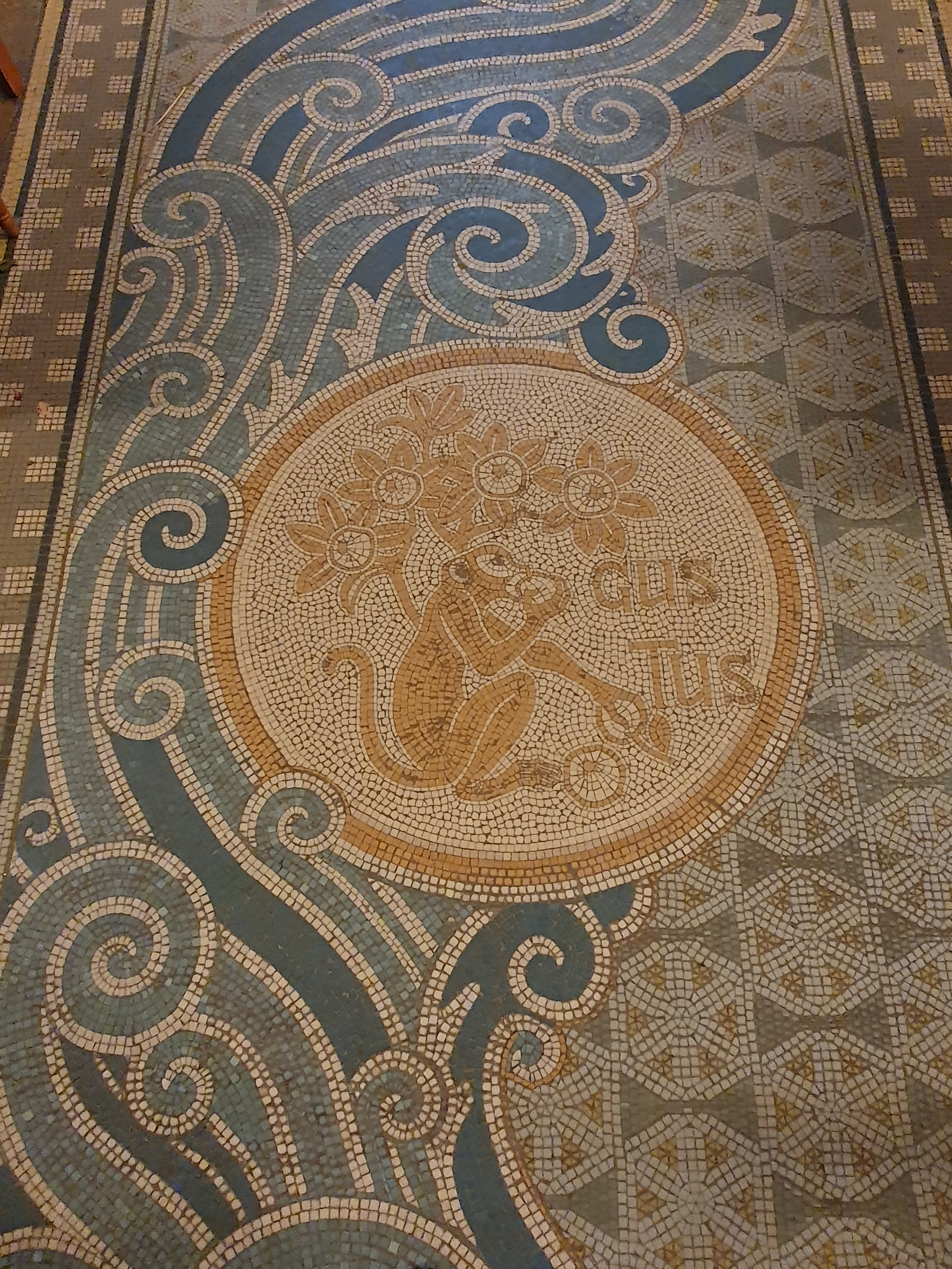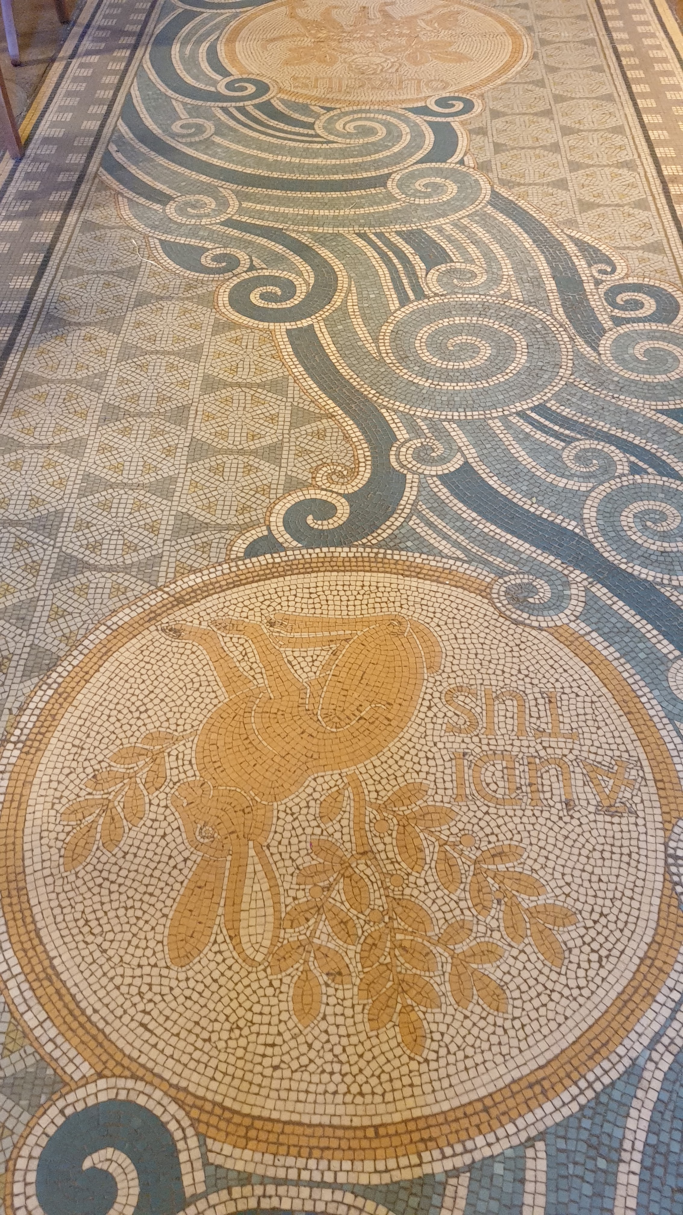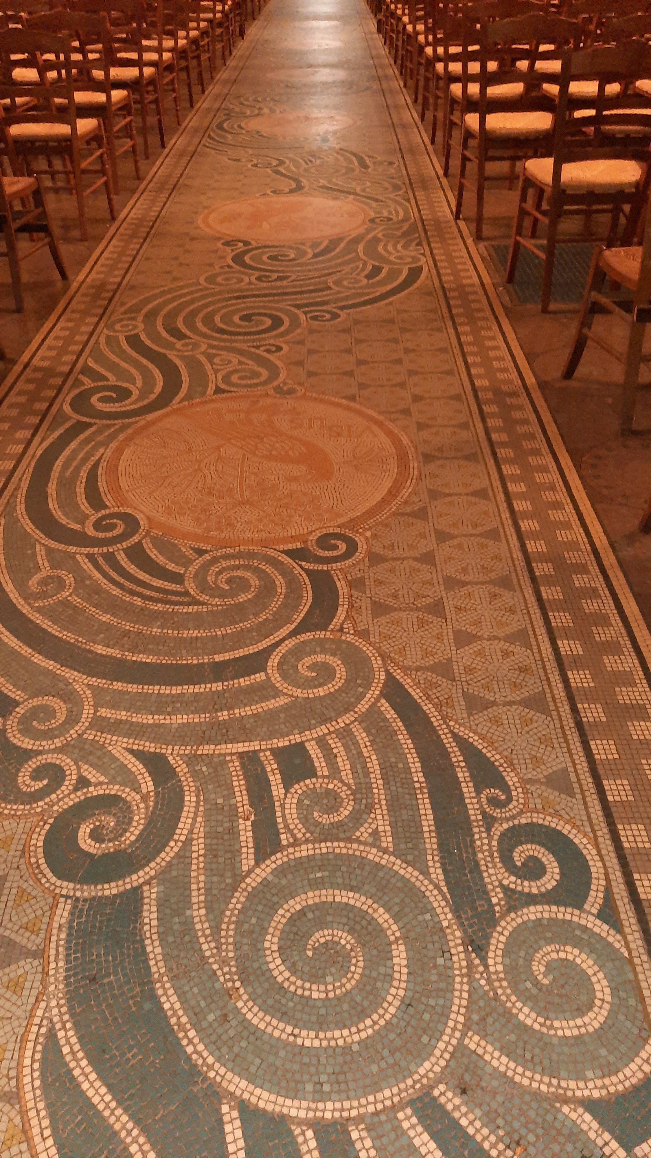 Superbe mosaïque au sol dans l'allée centrale et dans la petite pièce à droite dans le fond de l'église.