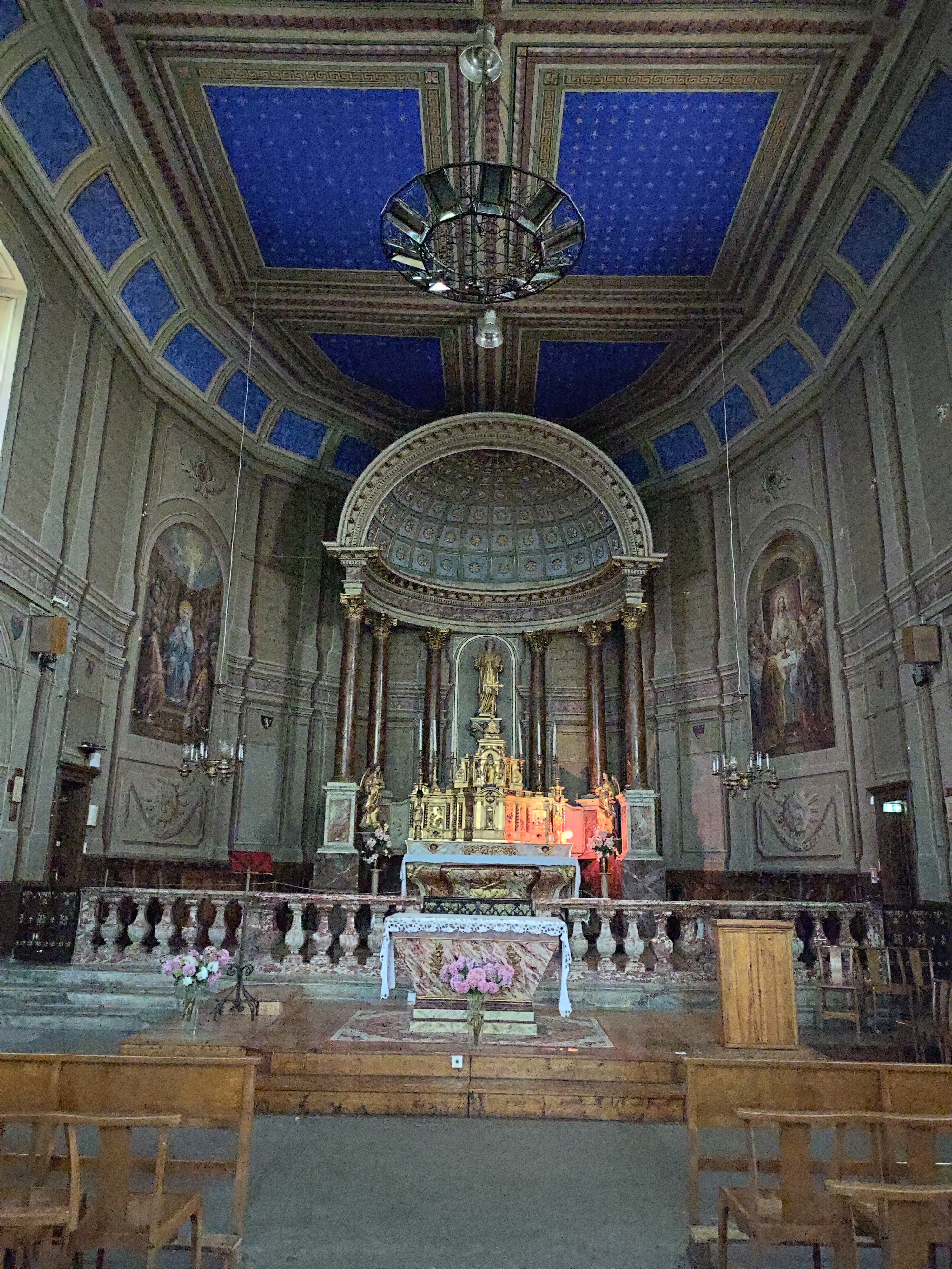 Église avec un intérieur un peu sombre mais très beau avec des fenêtres et un plafond décoré.